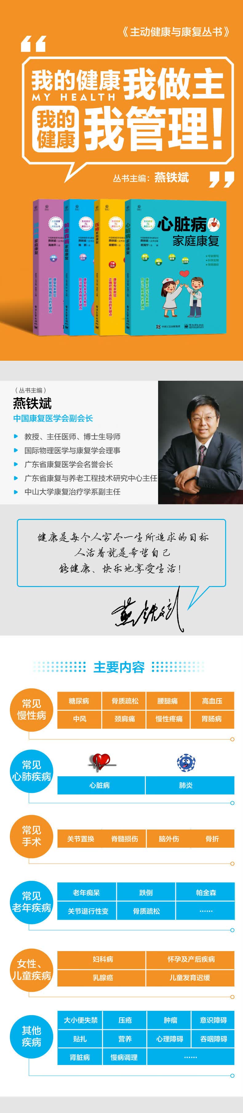《颈肩痛家庭康复》一书主要是针对颈肩痛的预防和家庭康复治疗来编写的。全书内容围绕颈椎病和肩痛展开论述,列出颈椎病和肩痛的发病原因、自我诊断方法、居家康复训练方法等。全书共分为十三章,第一章是阐述颈肩痛的概念;第二章到第七章是阐述颈椎病的认识、颈椎结构、颈椎病的诊断与自我诊断、颈椎病的治疗、居家康复及如何预防;第八章至第十三章阐述肩痛的初步认识、进一步认识、诊断与自我诊断、肩痛的治疗、家庭康复及如何预防。全书内容强调预防和"家庭”康复,文字描述简单明了、通俗易懂,尤其是配有大量的原创性图片,有利于读者更好的理解各种居家预防和康复的方法。