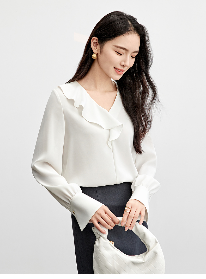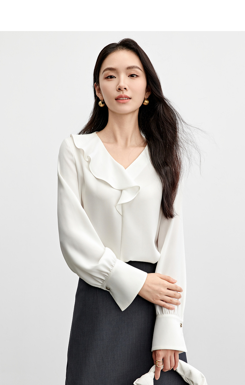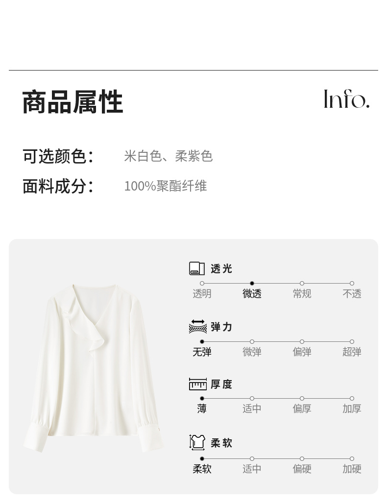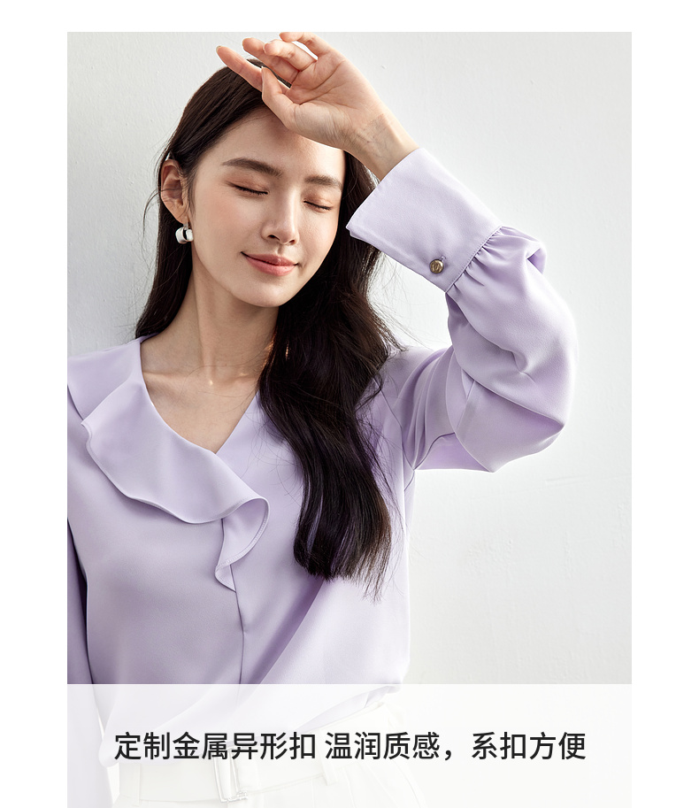 【内购】【麻感雪纺衫】通勤优雅不对称荷叶边V领金属异形扣清爽垂感上衣-151V57520