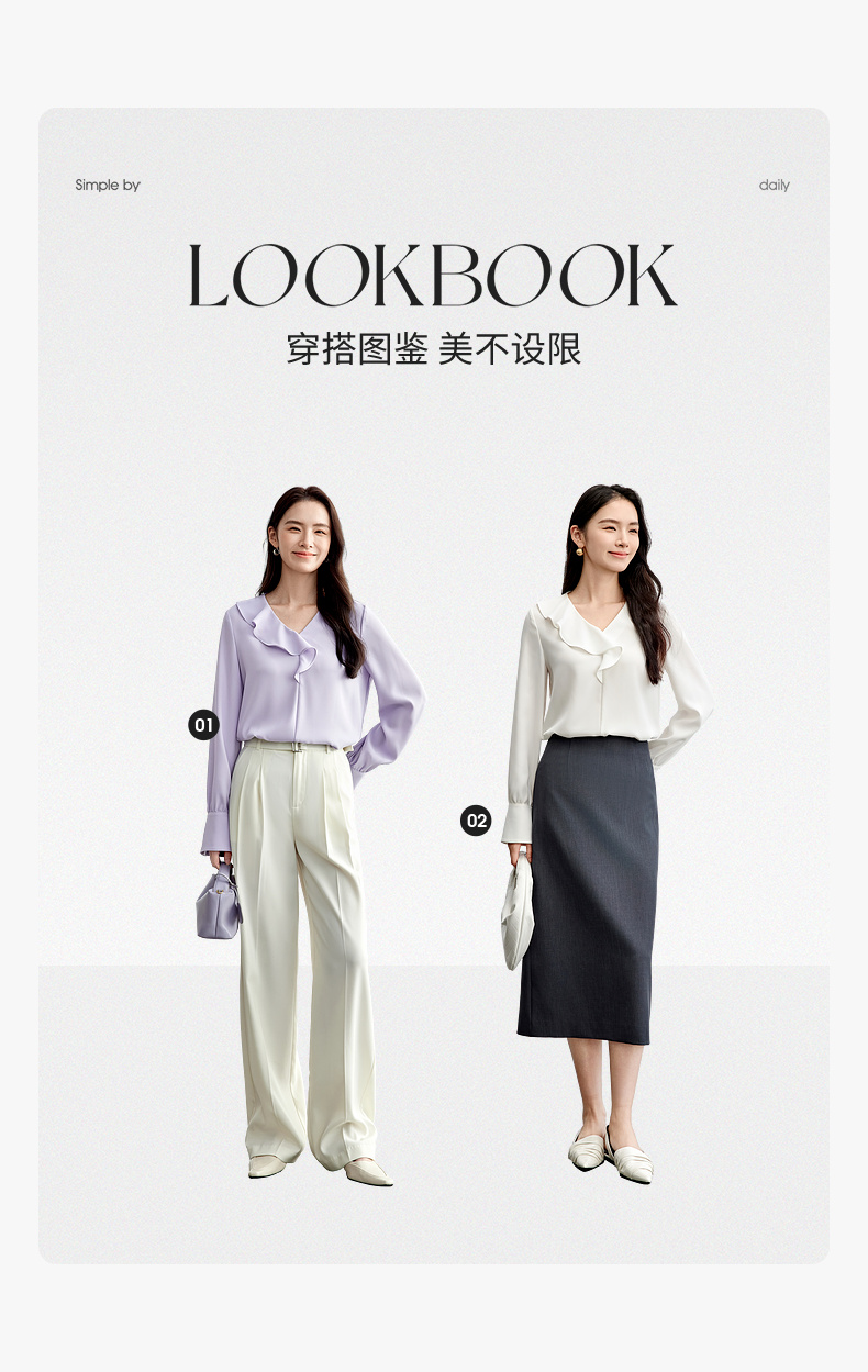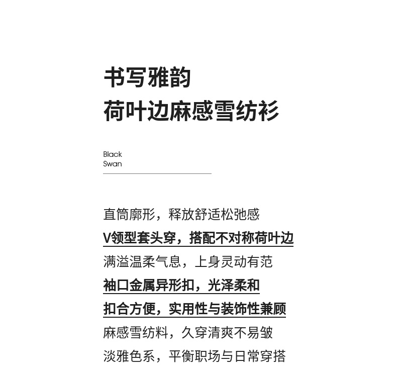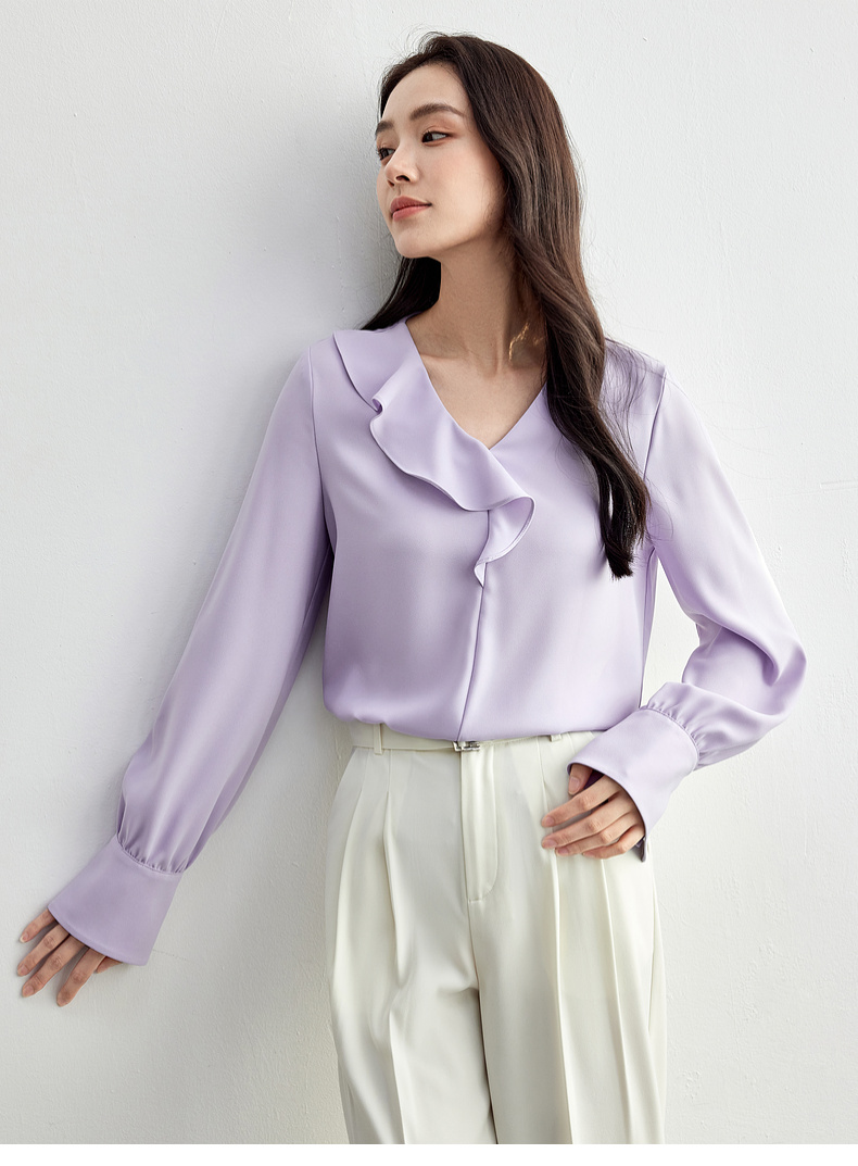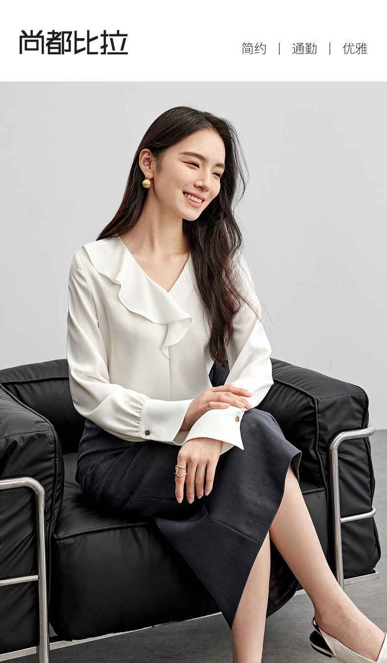 【内购】【麻感雪纺衫】通勤优雅不对称荷叶边V领金属异形扣清爽垂感上衣-151V57520