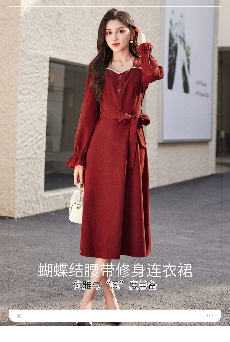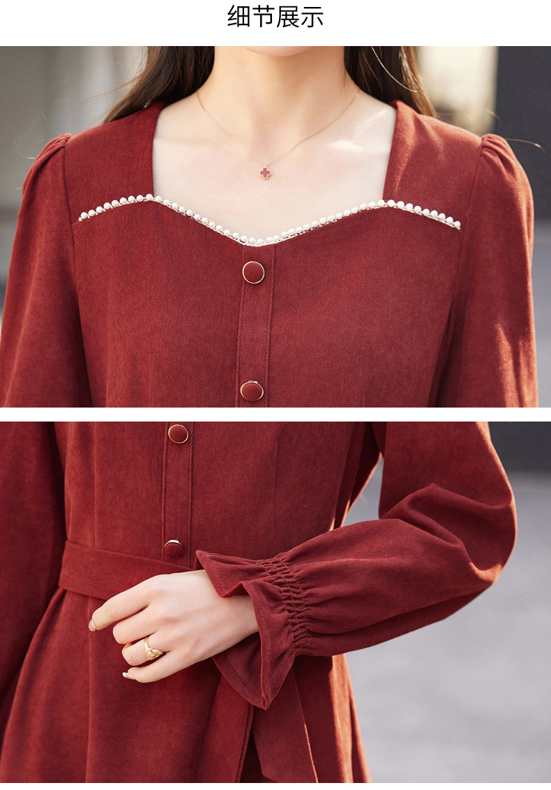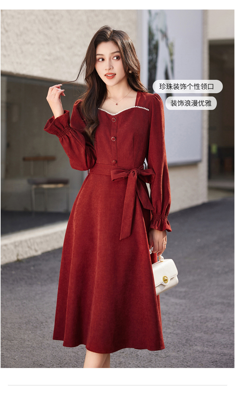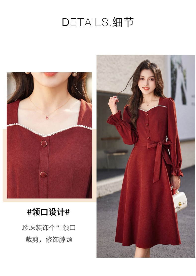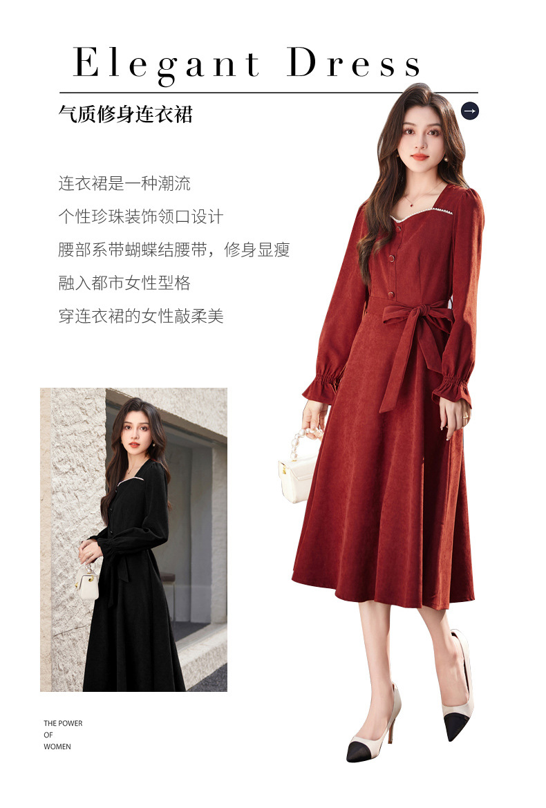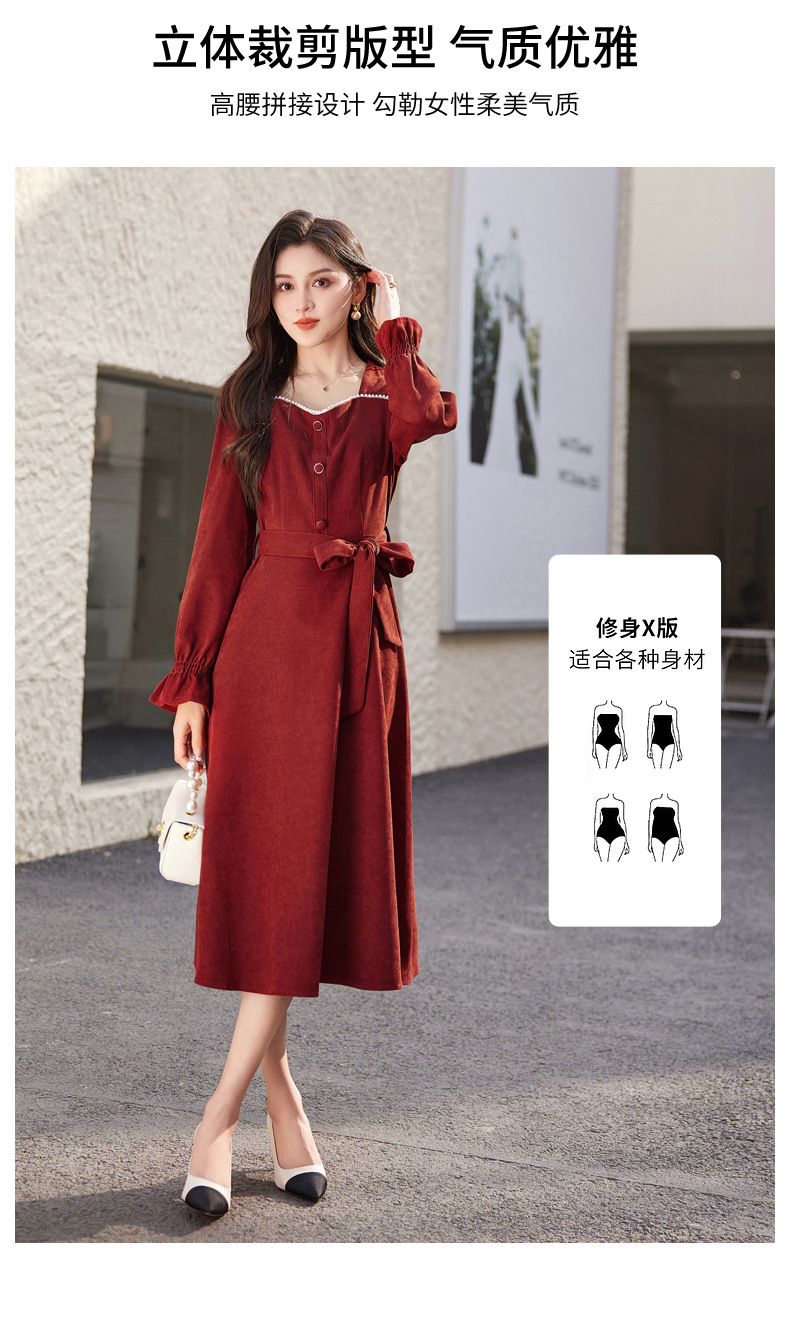 2024年秋季新款红色长裙气质显瘦珍珠拼接连衣裙MHYM38822