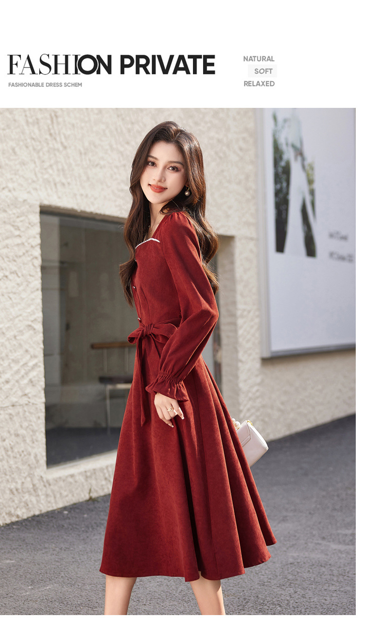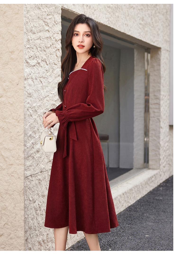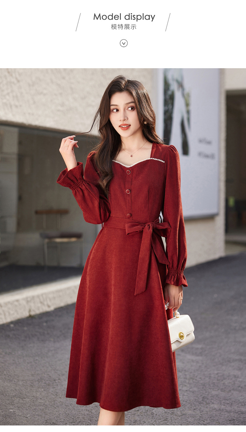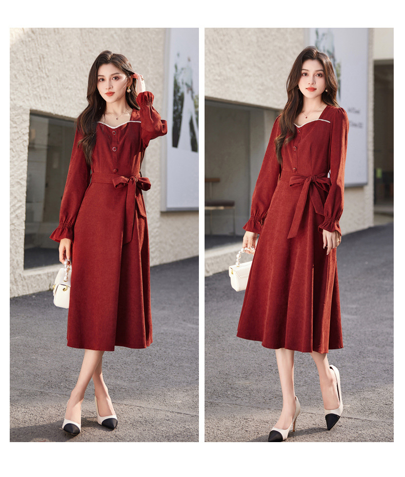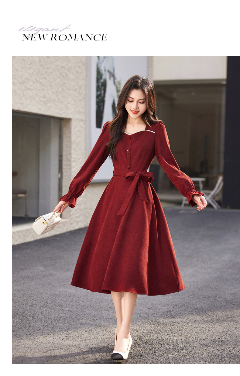 2024年秋季新款红色长裙气质显瘦珍珠拼接连衣裙MHYM38822