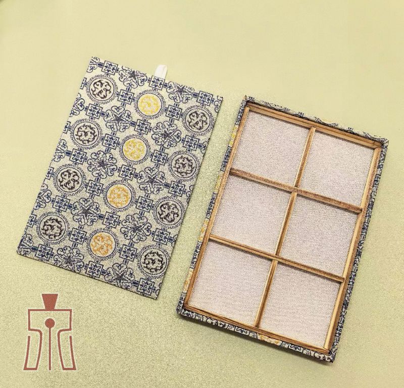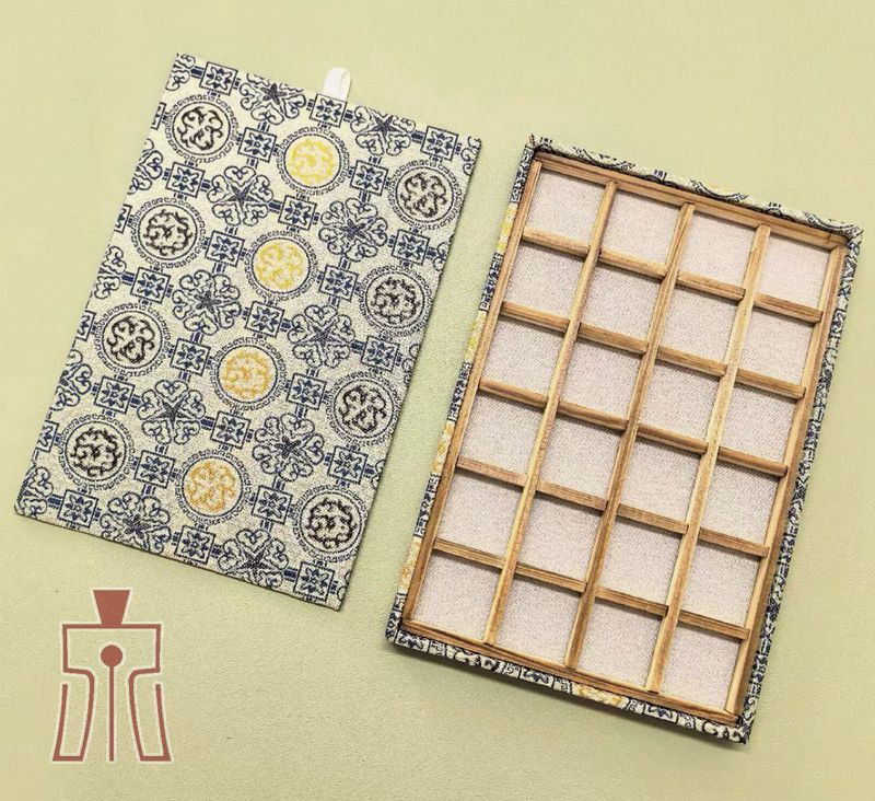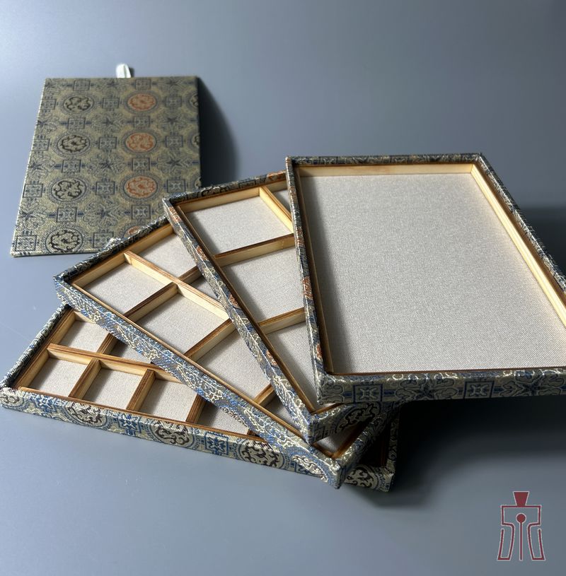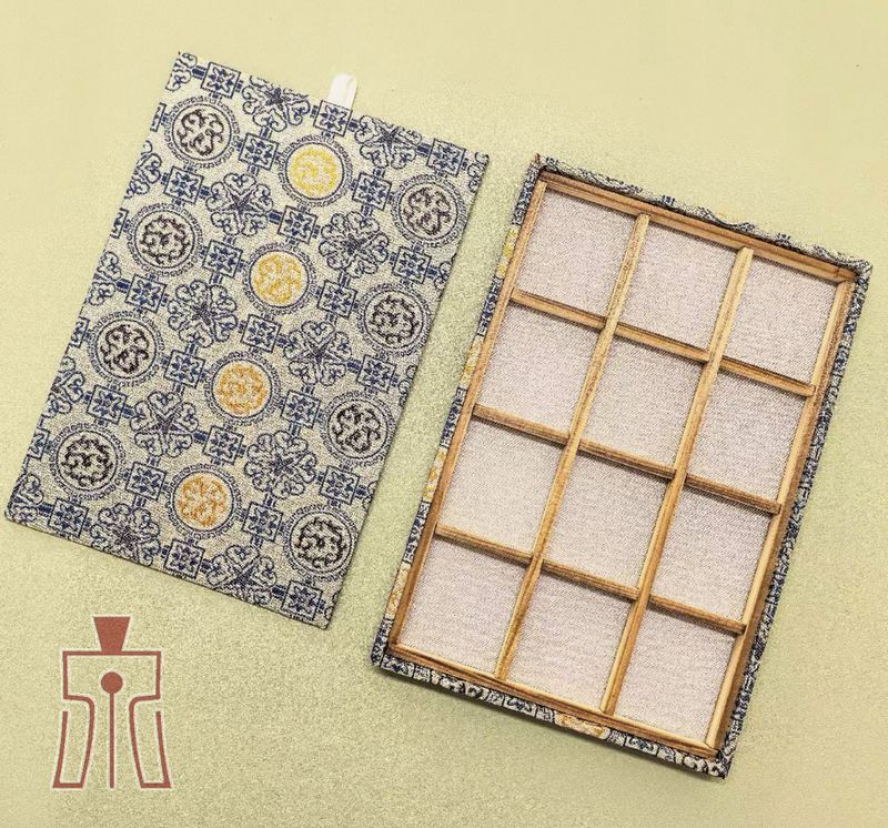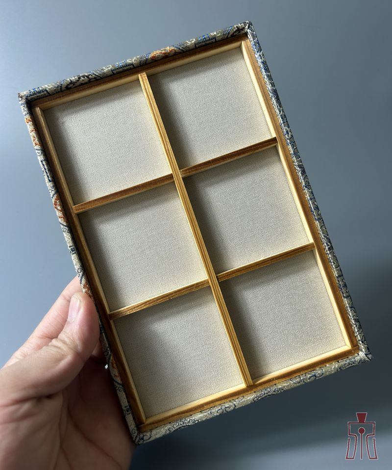 该托盘采用宋锦和实木材料制作,适合收纳钱币或小杂项,方便携带和展示,是储藏收纳和柜台展示的优选。