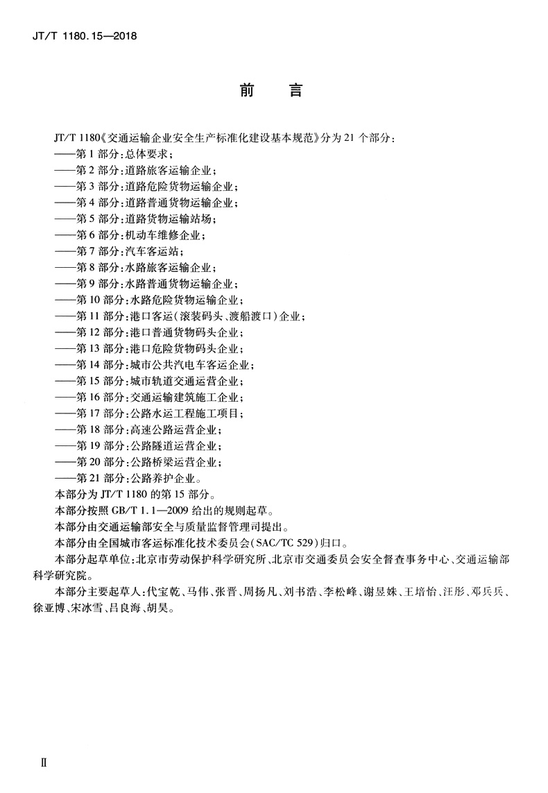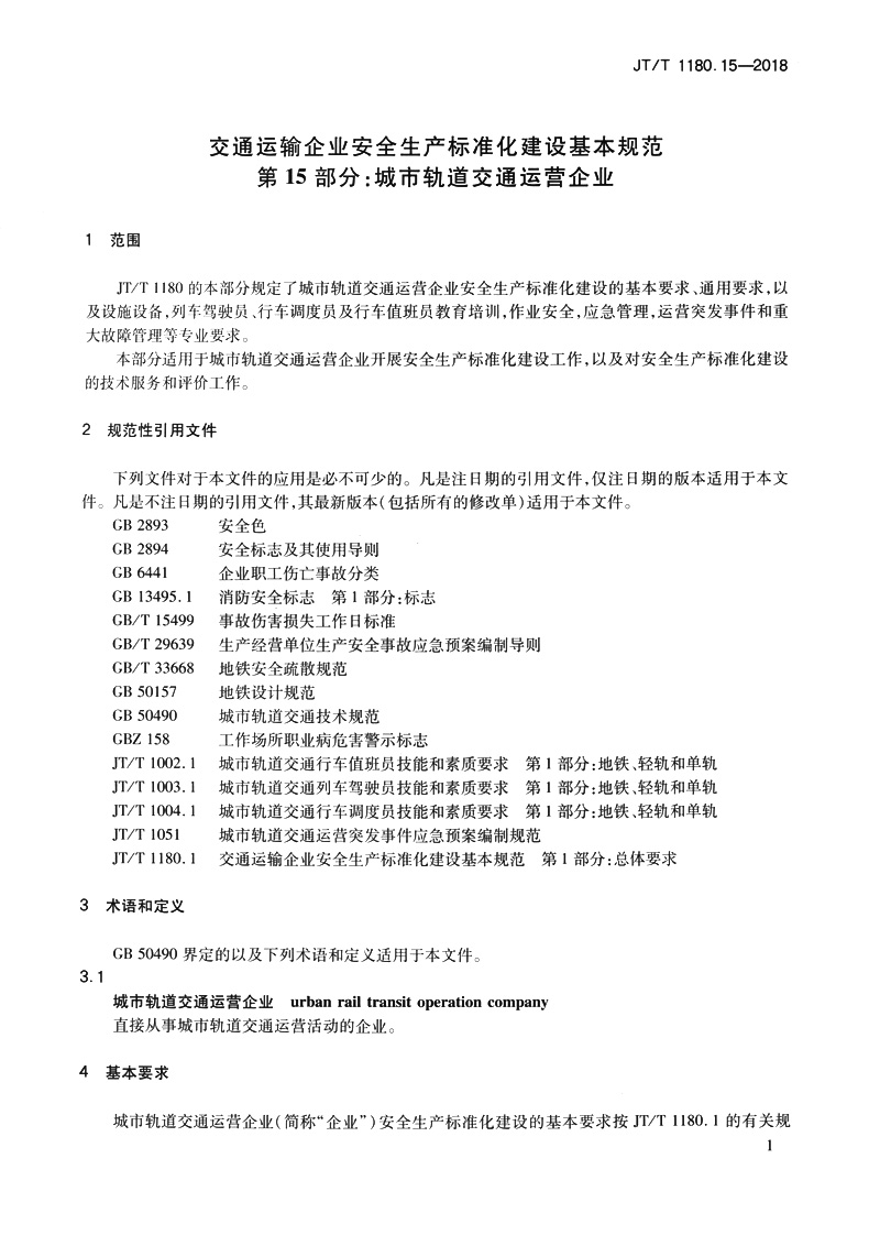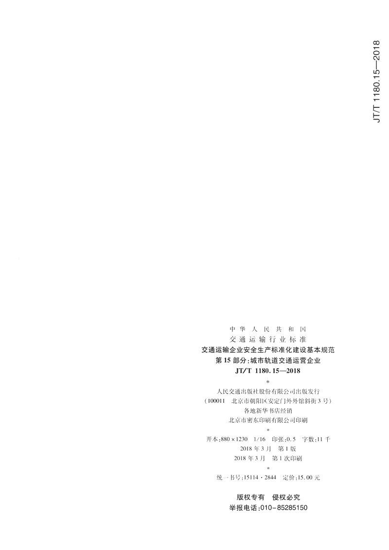 书名:交通运输企业安全生产标准化建设基本规范 第15部分:城市轨道交通运营企业(JTT 1180.15—2018)