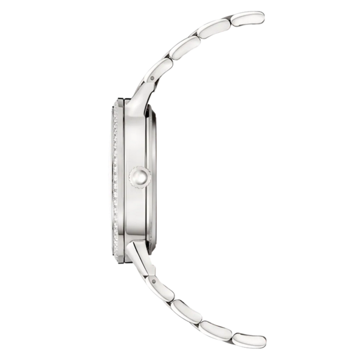镜面材质 | 蓝宝石水晶玻璃 | 表盘 | 精钢镶钻表壳,银色表盘 功能 : 时、分, 昼/夜显示, 秒 正面表盘指针:花形 宝石 : 钻石:~60 ~0.63 克拉 表盘 : 银色, 扭索饰纹, 移印数字和钻石小时刻度 透底 |