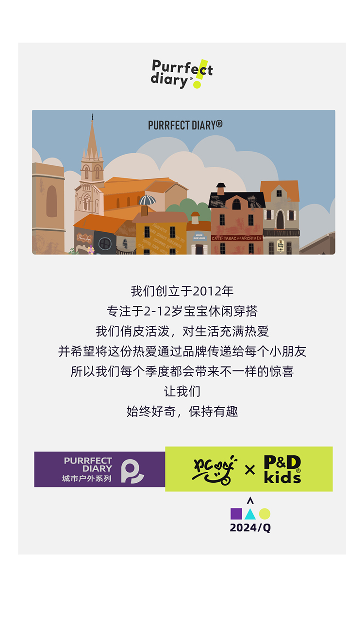 - Purrfect-Diary专注于贴近自然随性的穿着概念,轻奢平价的童装文化传播,在产品设计上更加注重婴童穿着的舒适性、安全性、更出众的国际化品牌,将欧美的育婴文化在中国进行深入的传播与推广。
