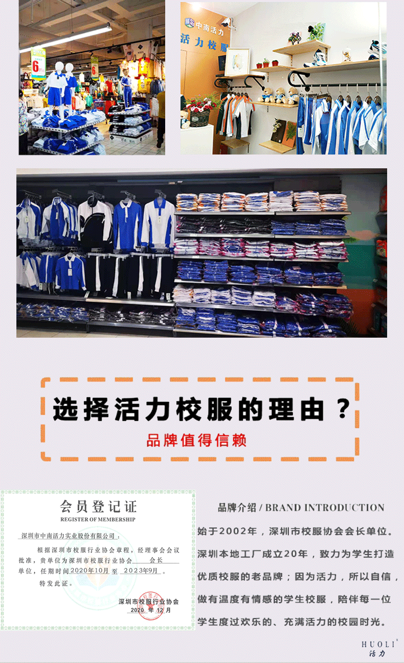 - 活力校服由深圳市中南活力实业股份有限公司创建的品牌,深圳二十一年老品牌,教育局中标企业;主营深圳校服、广州校服、东莞校服、佛山校服、肇庆校服、江苏校服、鞋袜、学生床上用品等学生课桌椅一站式教育领域产品