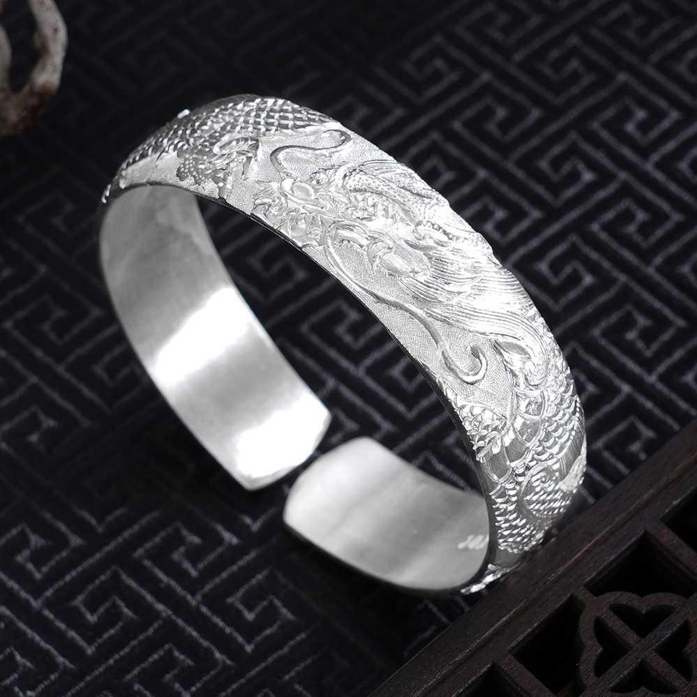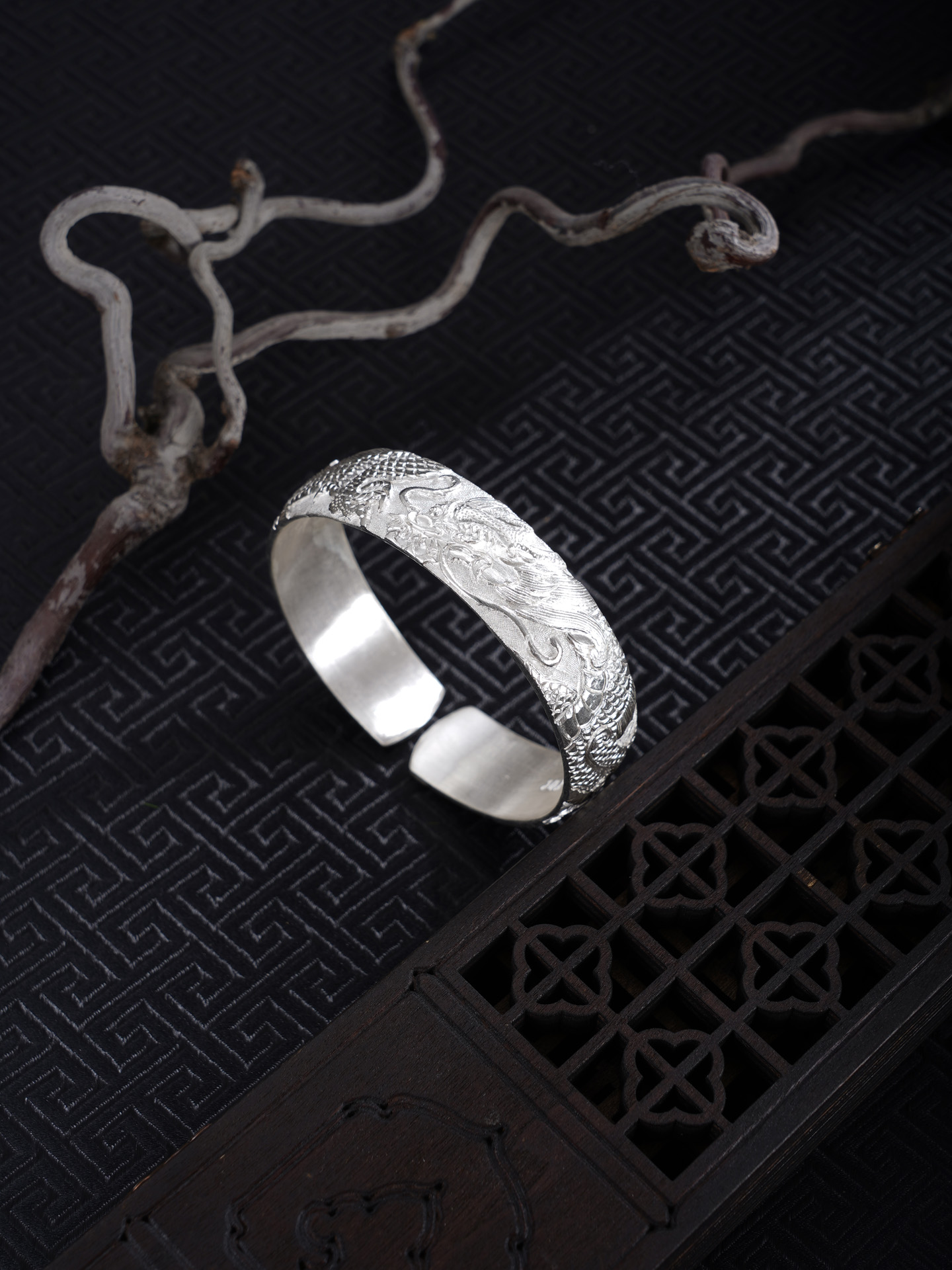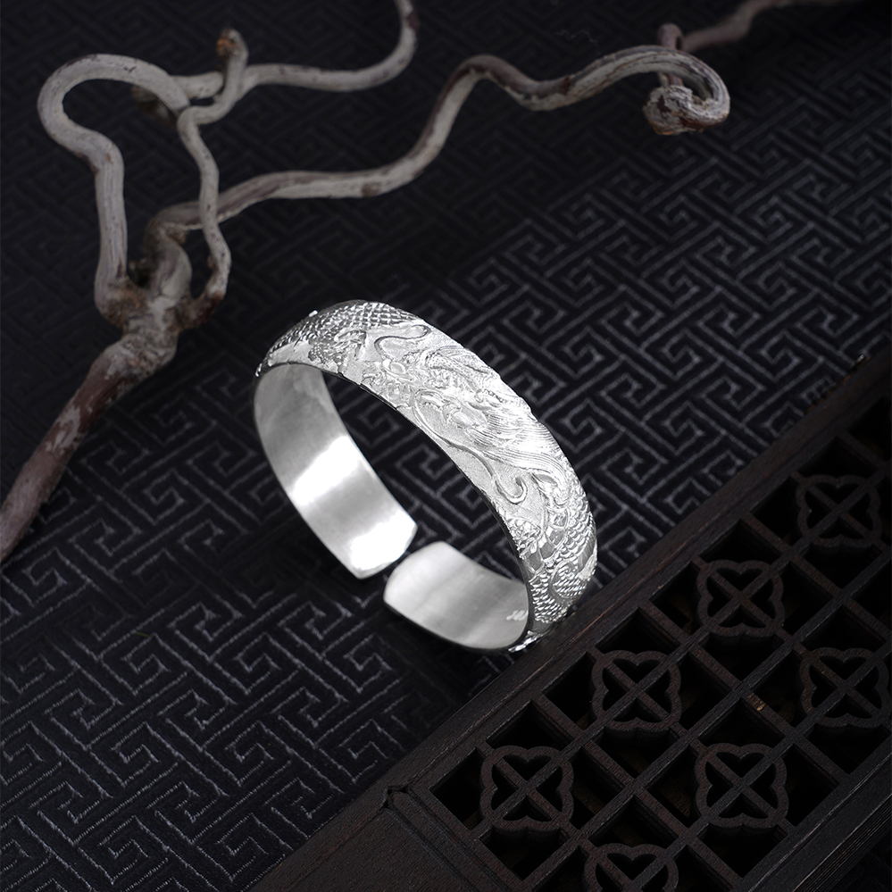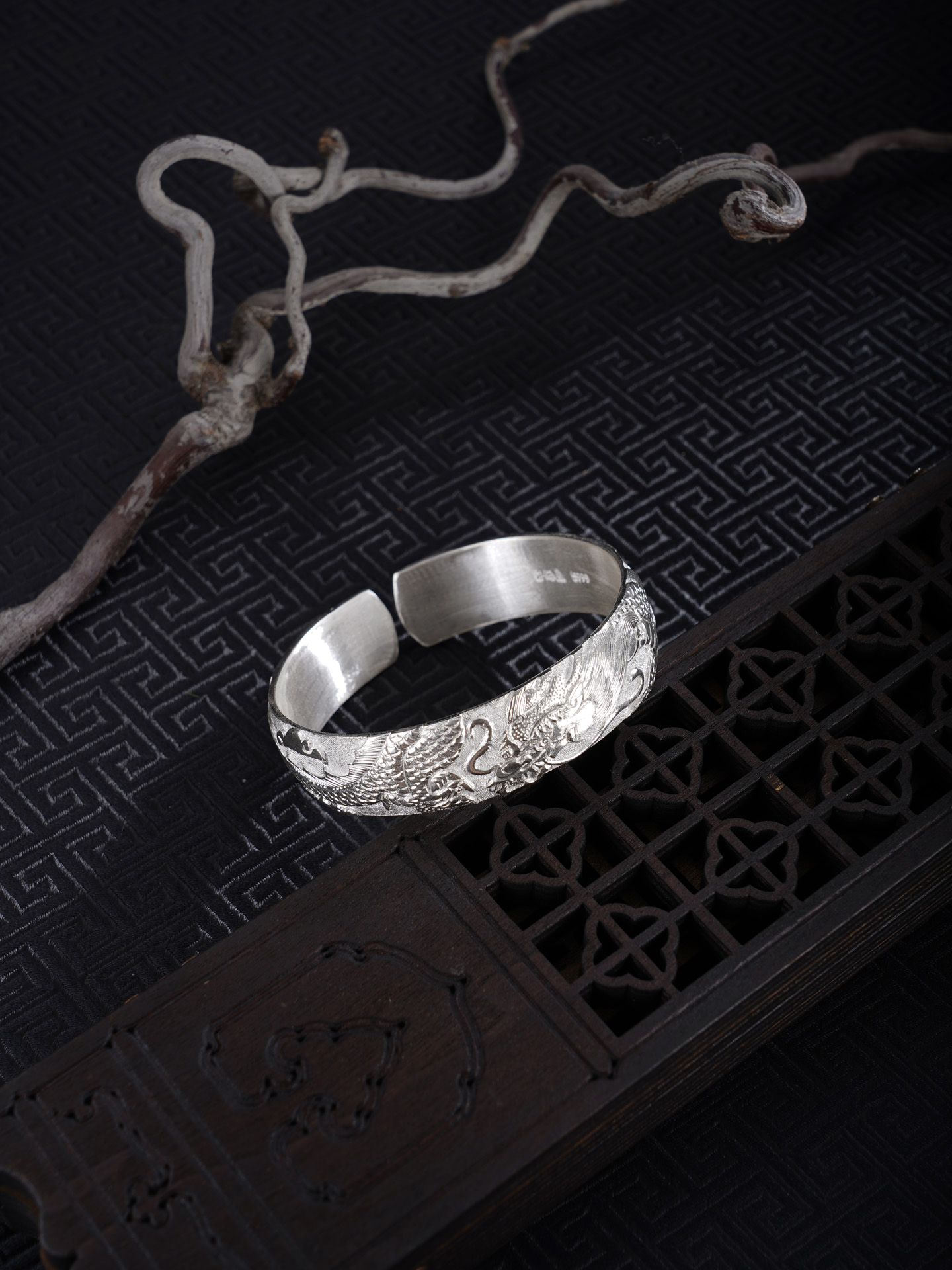 【寓意】:龙居九五之尊,乃四灵之首,象征无上权威与尊贵地位。作品以足银精铸,融合深浅浮雕与抛光工艺,塑造龙腾纹样,寄寓祖国繁荣富强,蒸蒸日上。