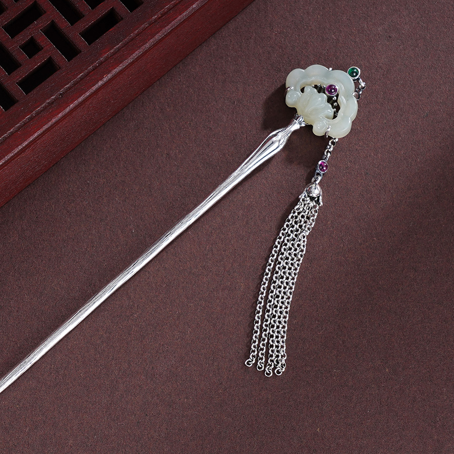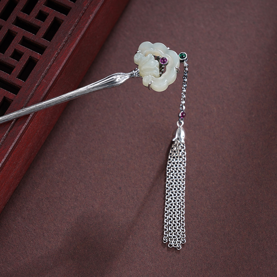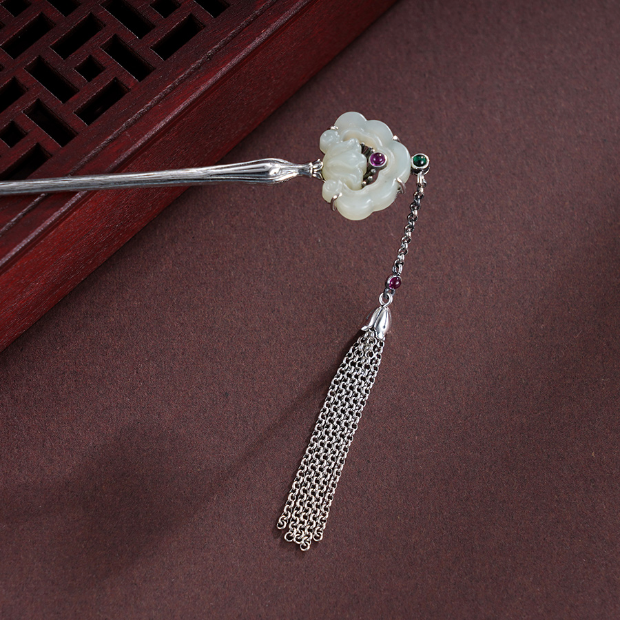【寓意】:和田玉雕琢出如意轮廓,搭配垂坠流苏,冷艳通透,灵动婉转,更添几分优雅韵味。