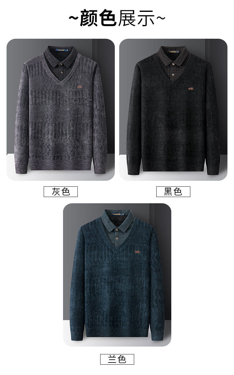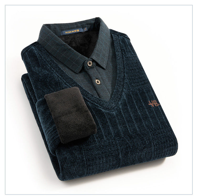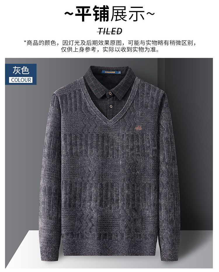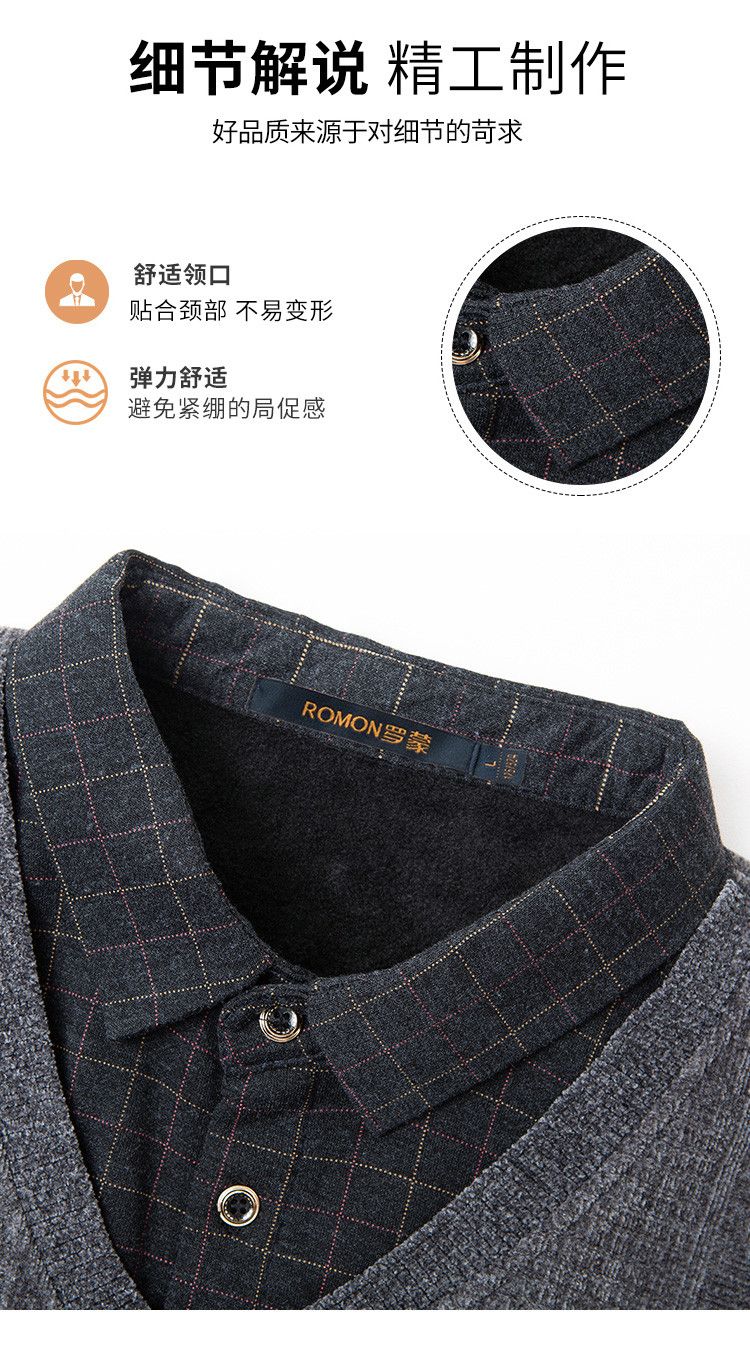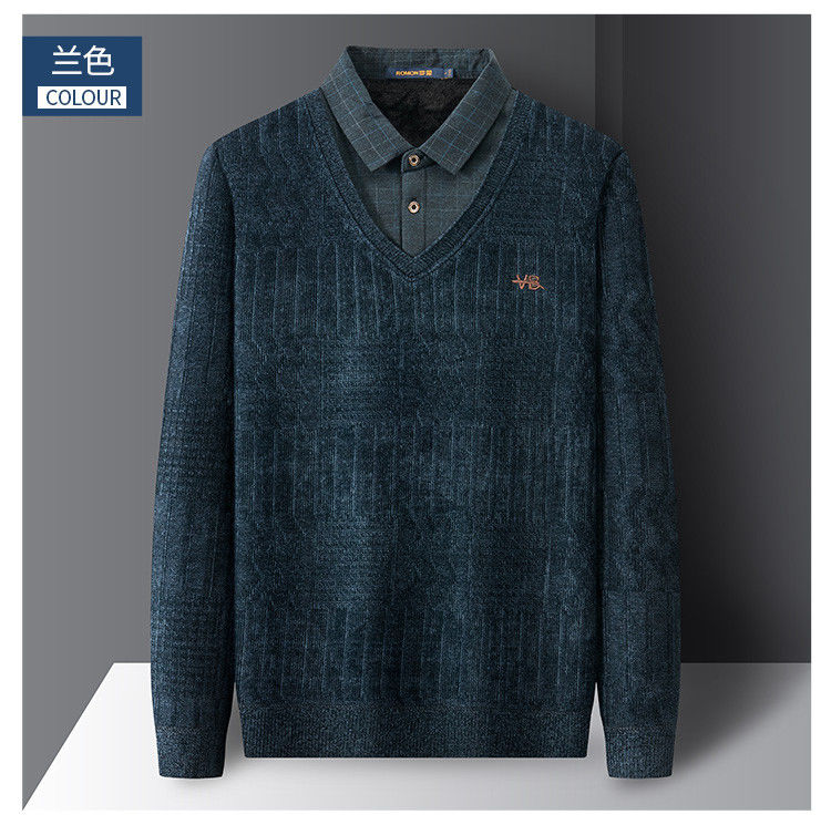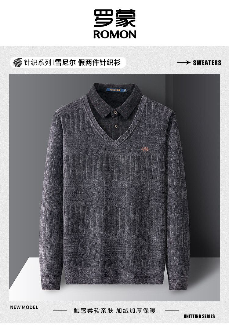 【加绒加厚】罗蒙秋冬雪尼尔假两件针织衫男士衬衫领商务毛衣男士针织衫
