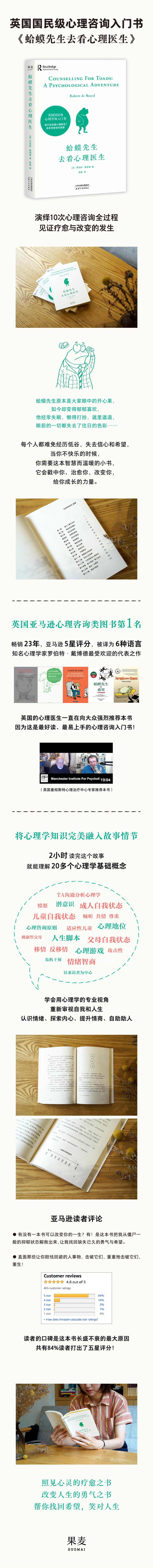 蛤蟆先生一向爱笑爱闹,如今却一反常态地郁郁寡欢,他一个人躲在屋里,连起床梳洗的力气都没有。朋友们很好担心他,建议他去做心理咨询。在10次心理咨询中,蛤蟆在咨询师苍鹭的带领下,勇敢地探索了自己的内心世界,也逐渐找回了信心与希望……为了向大众读者普及心理学知识,告诉大家心理咨询是怎么一回事,作者借用了英国文学经典《柳林风声》的故事主角,让蛤蟆先生和他的朋友们再次登场,演绎了这个关于心理咨询的故事。读者犹如亲临现场,体验心理咨询的每一个细节,见证疗愈和改变的发生。在这本书里,作者借由蛤蟆和心理咨询师苍鹭的互动,探索了蛤蟆抑郁的情绪与自卑、软弱、爱炫耀的个性究竟来源于何处,让读者看到童年经历的深刻影响,以及如何才能在心理上真正长大成.人,独立、自信、充满希望地生活。