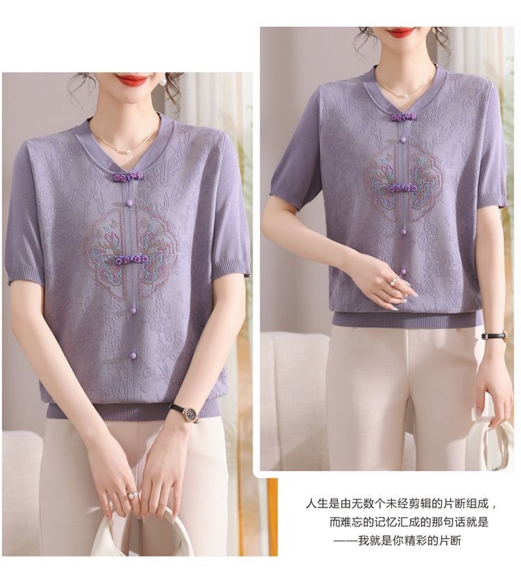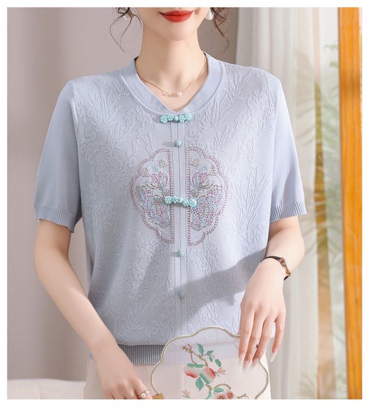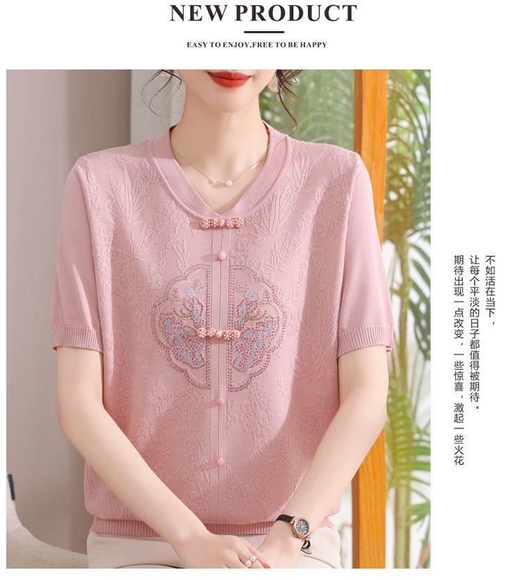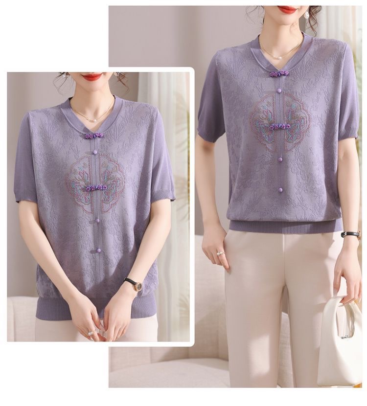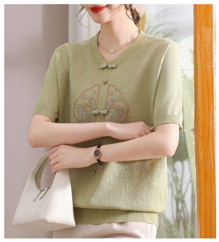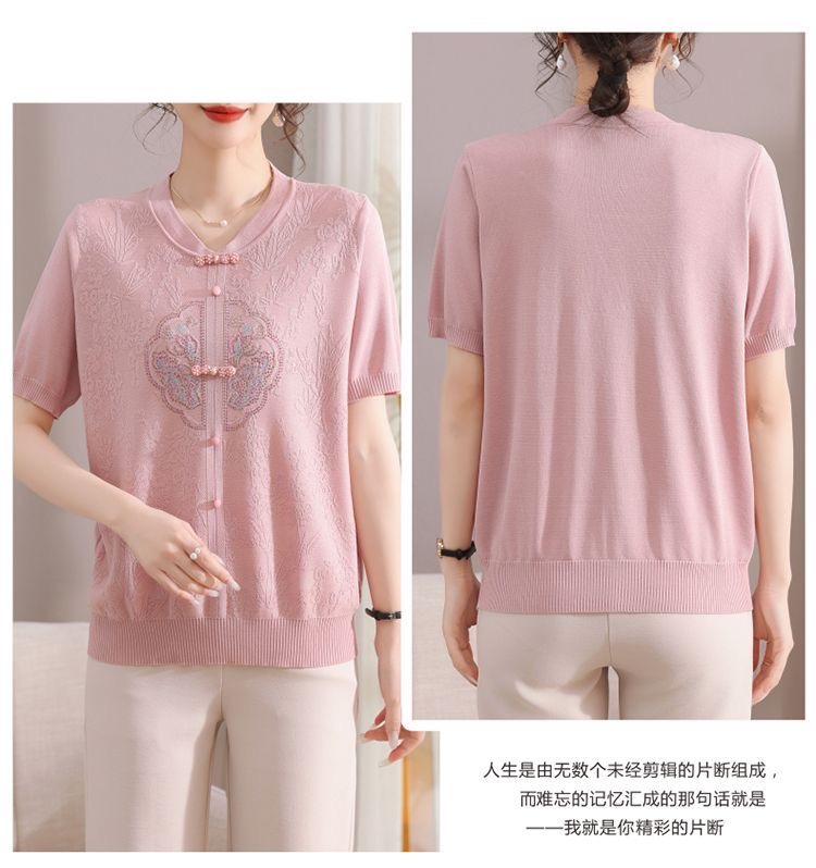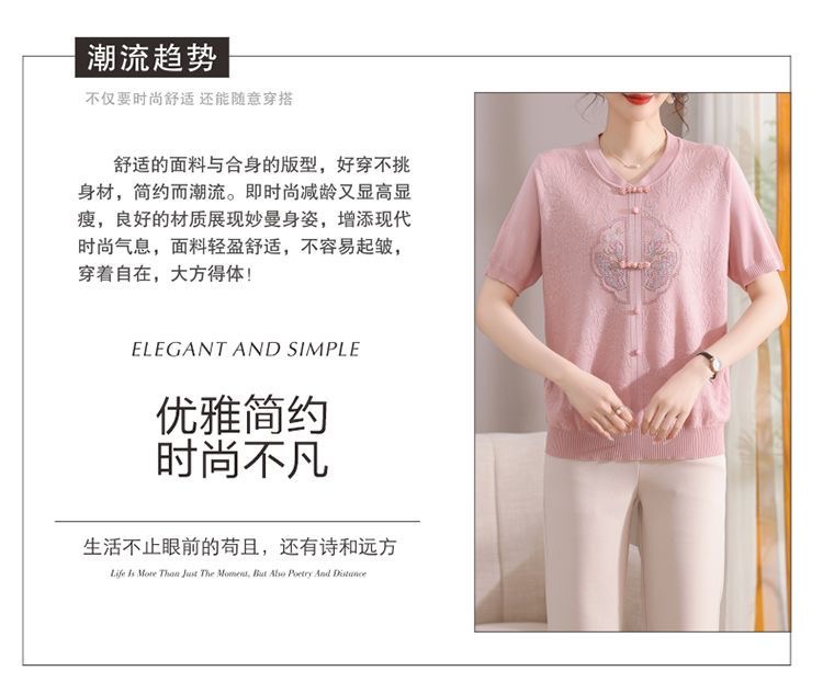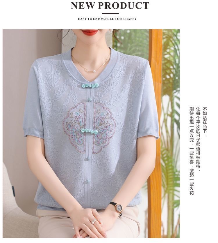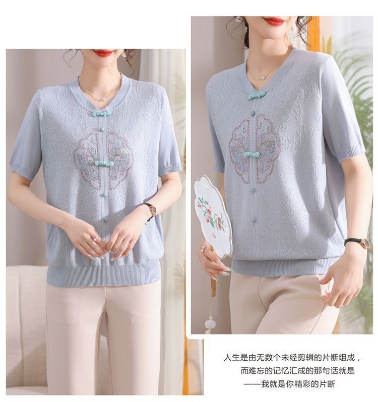 【YW】无忧购中老年妈妈新中式国风薄款针织冰丝透气短袖上衣2501(截单后7天发货)