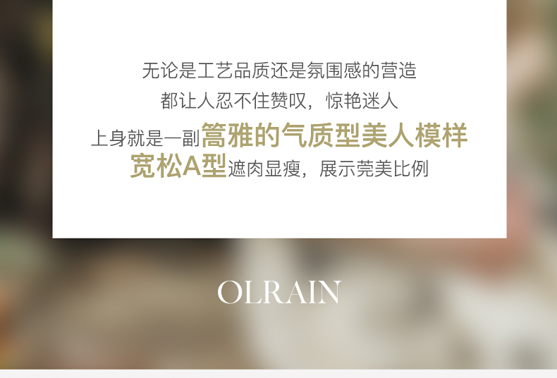 - “精致”是欧芮儿olrain品牌文化的核心,欧芮儿认为,精致的女人,不但要外在动人,更要内在迷人,内外兼修,有魅力、有气质、有内涵,自信而不自傲,优雅而不矫揉,自有万种风情而不轻浮,更不故作矜持。