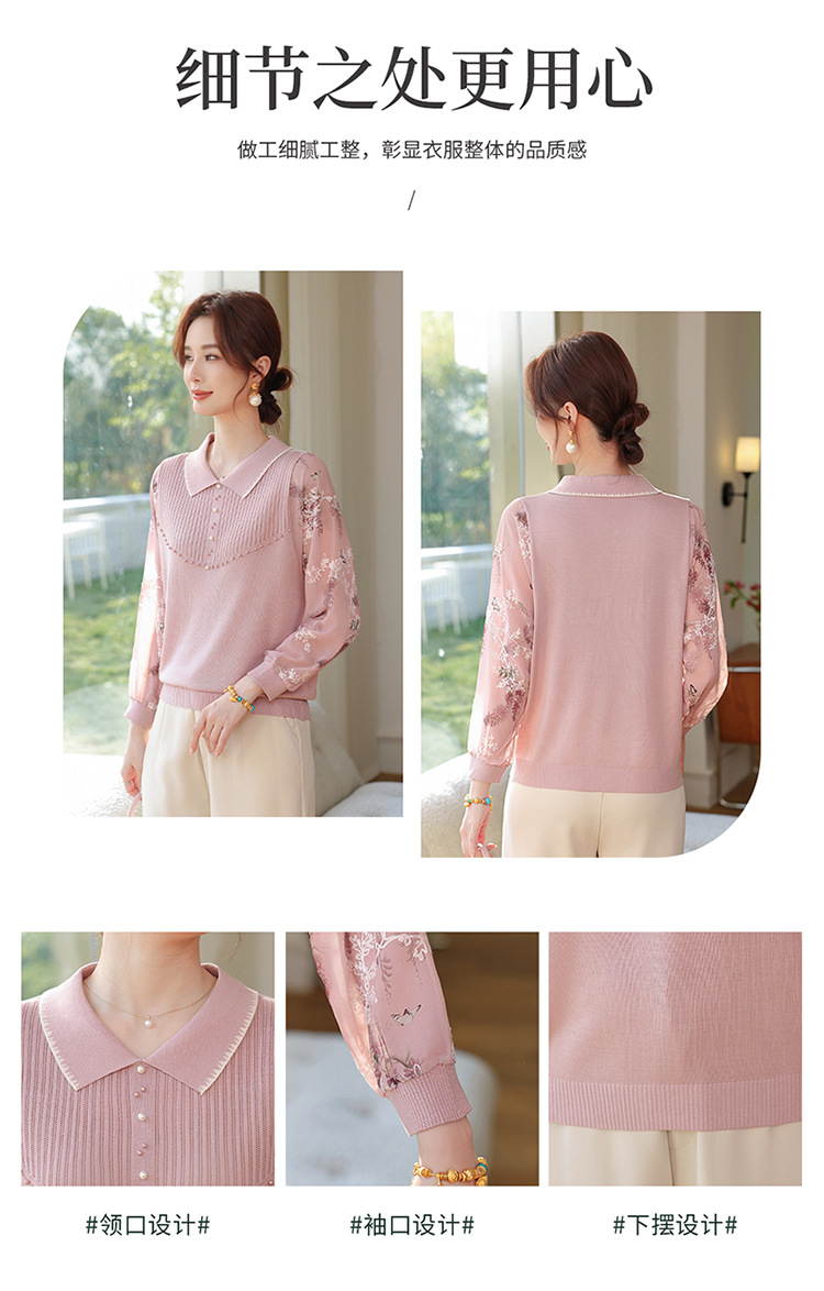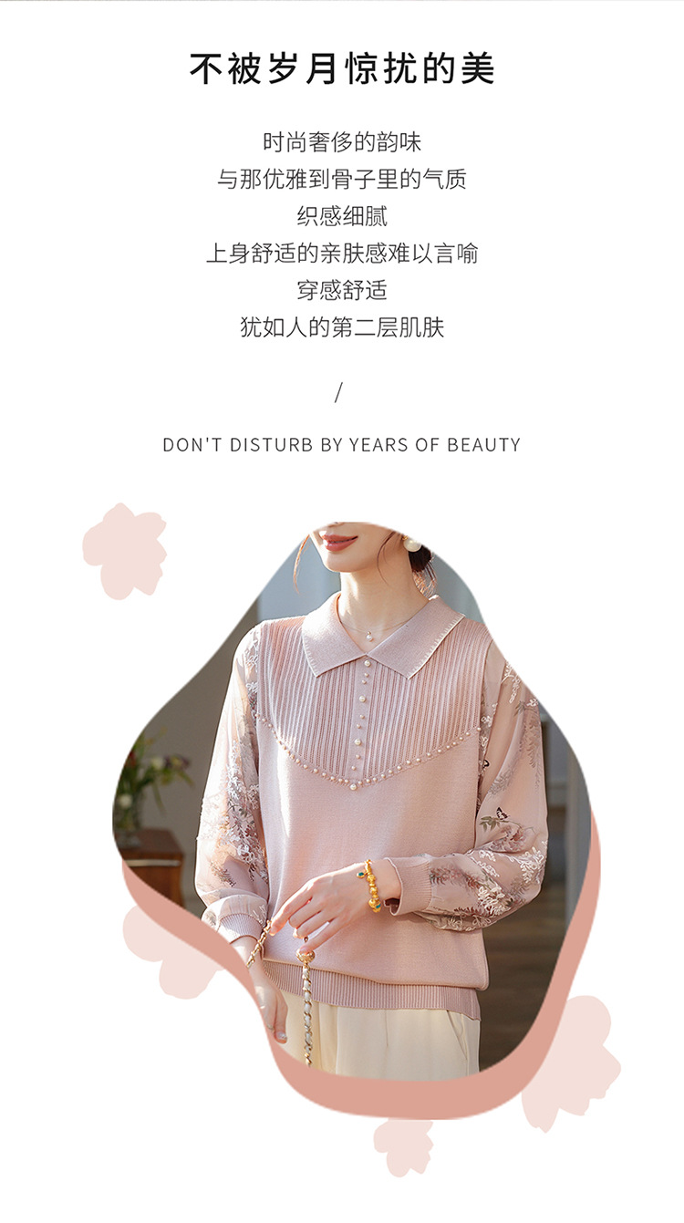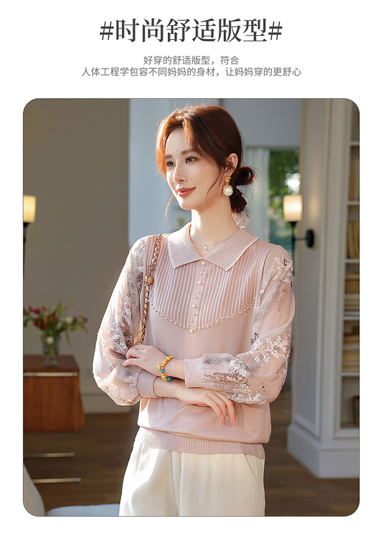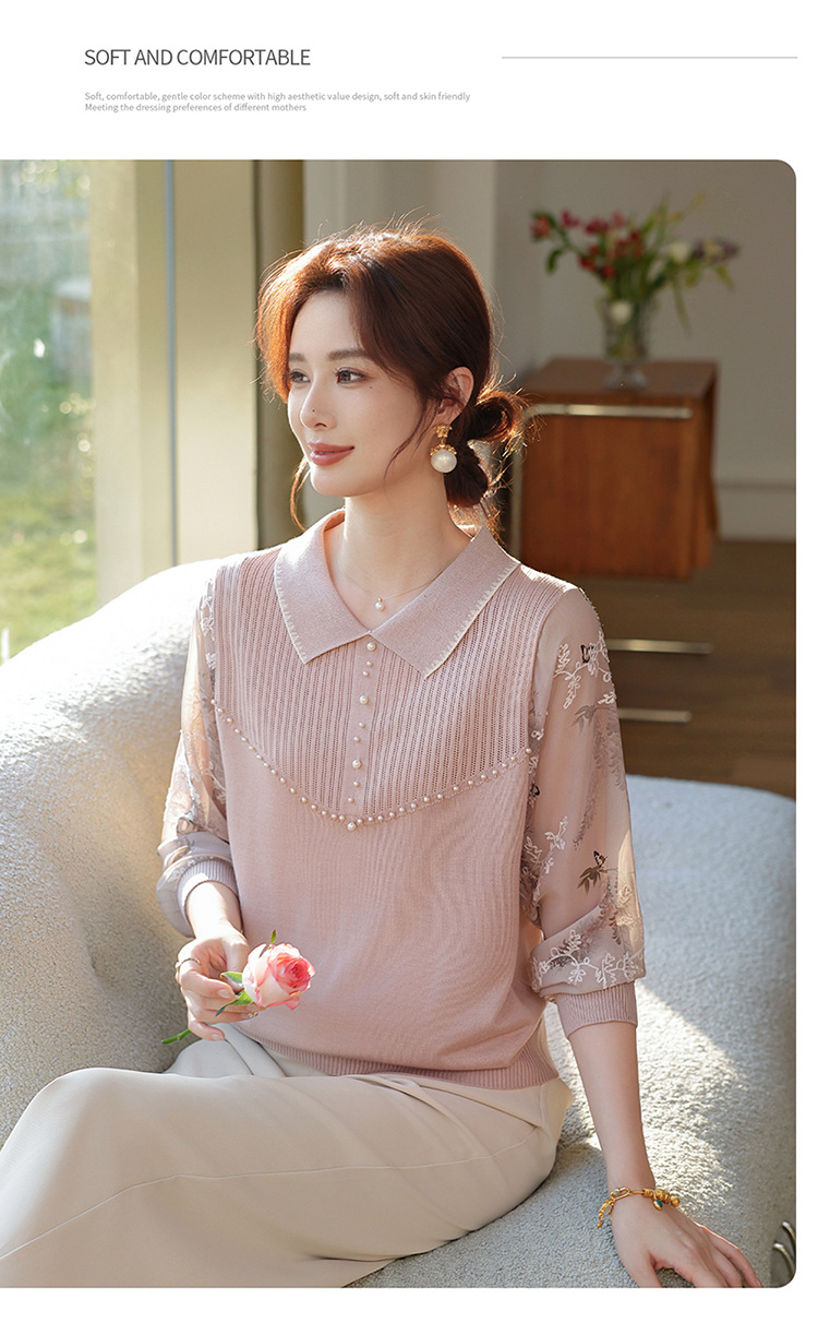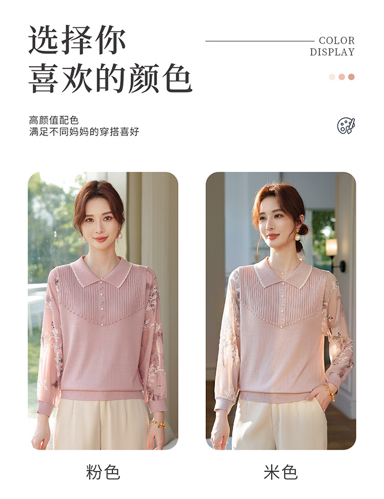 【妈妈春装新款】气质翻领纱袖针织衫 洋气春夏季T恤打底上衣 中老年女装