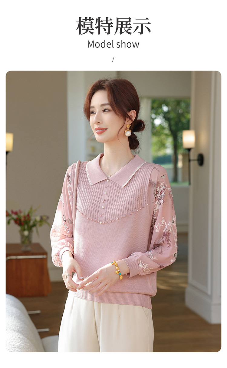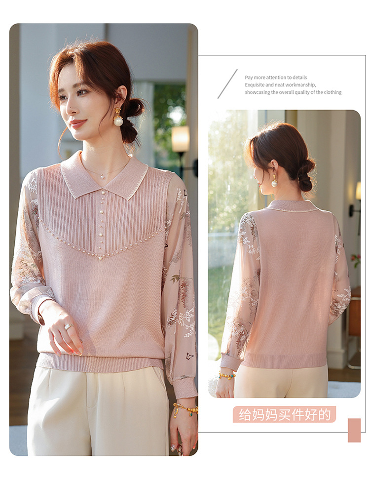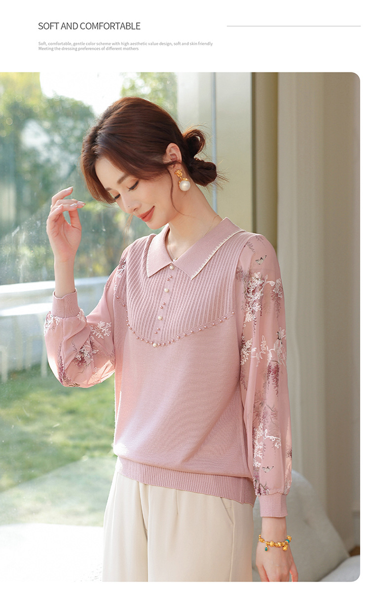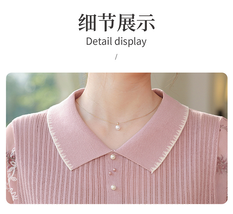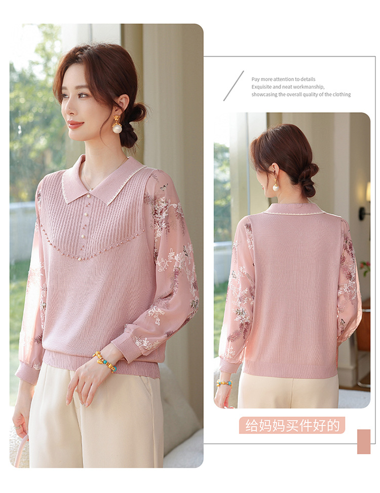 【妈妈春装新款】气质翻领纱袖针织衫 洋气春夏季T恤打底上衣 中老年女装