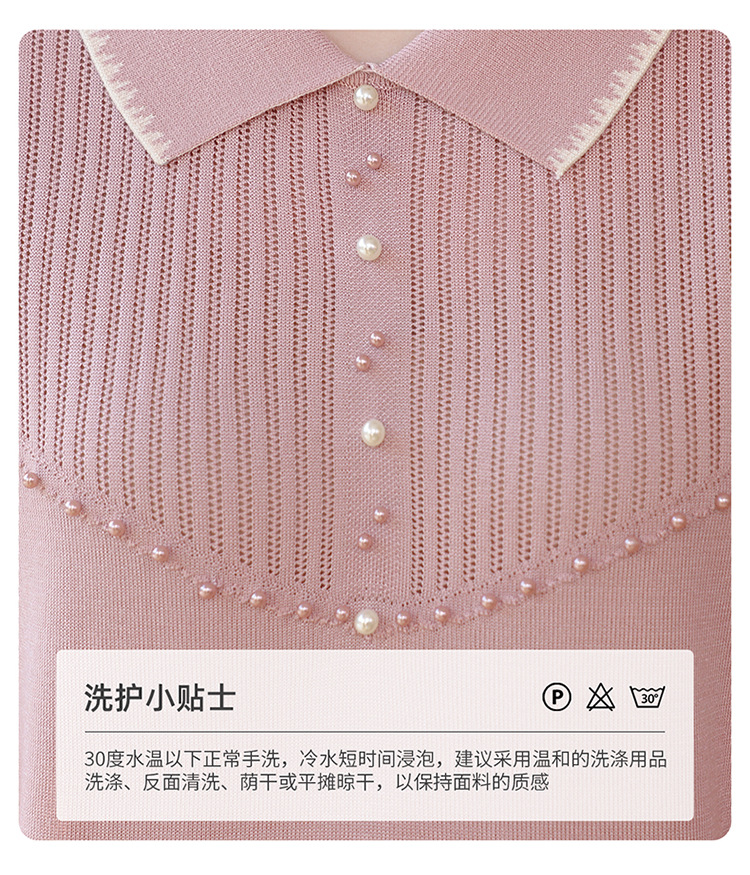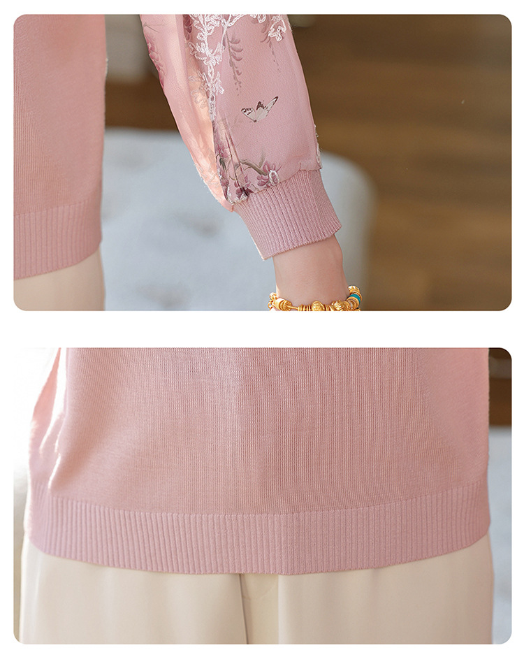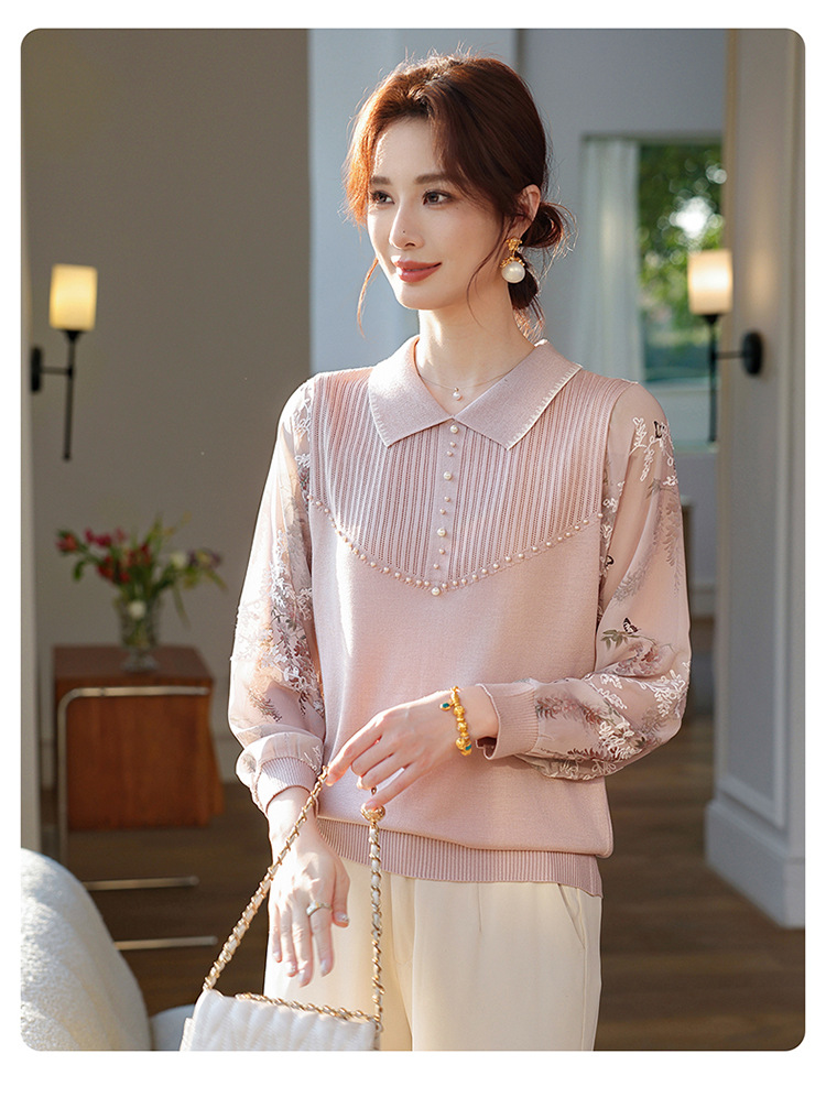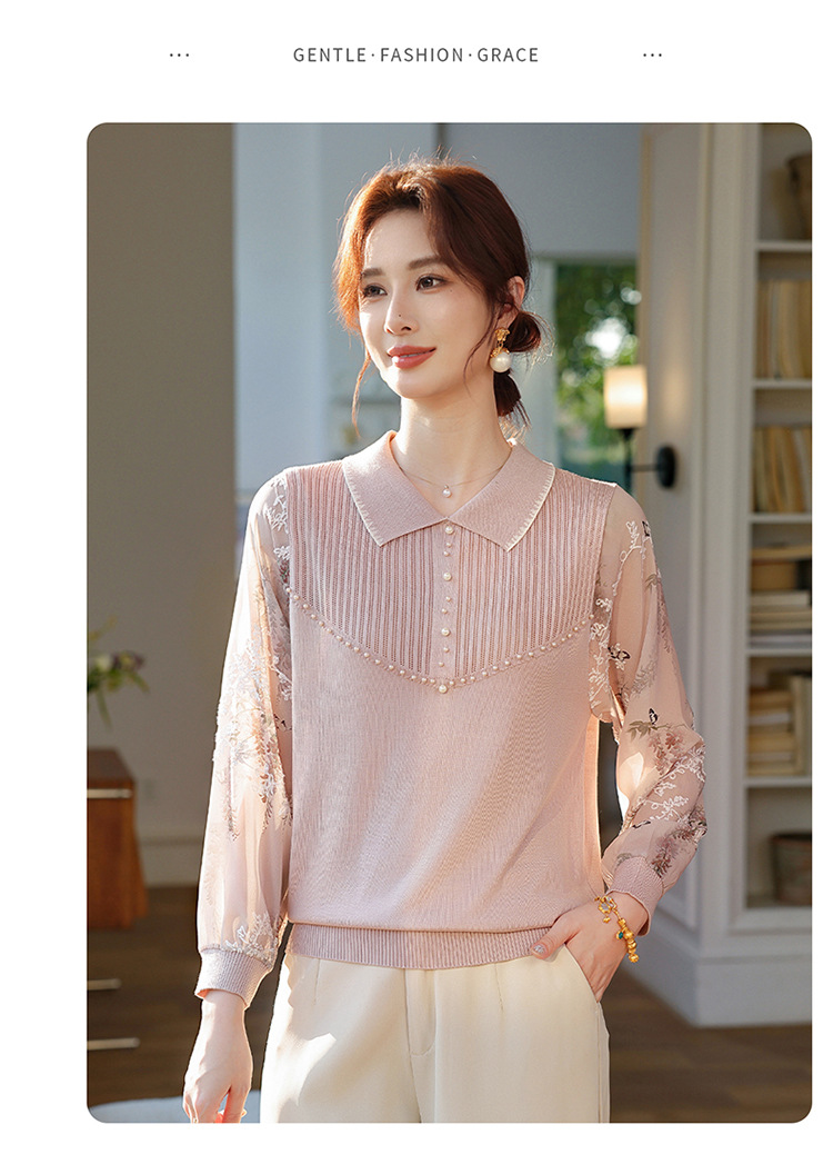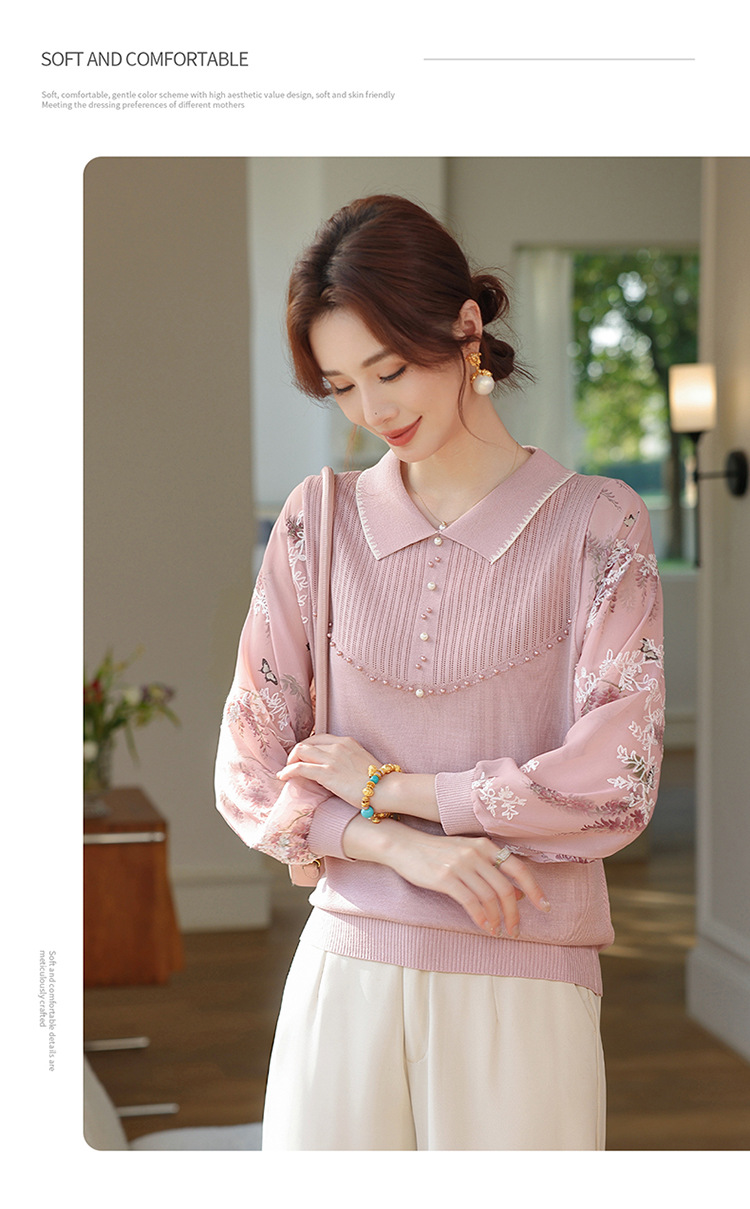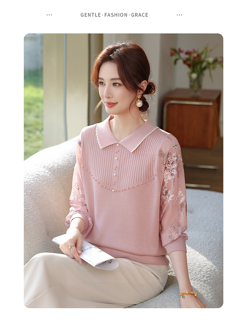 【妈妈春装新款】气质翻领纱袖针织衫 洋气春夏季T恤打底上衣 中老年女装