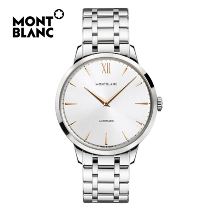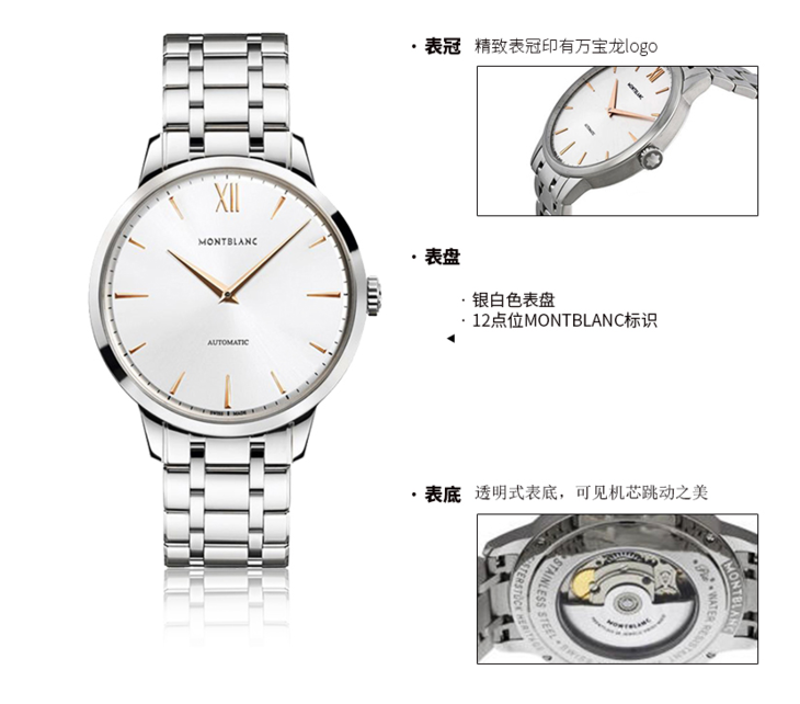 镜面 材质 | 蓝宝石水晶玻璃 | 表盘 | 精钢表壳 白色表盘,镀玫瑰金指针和数字刻度时标 银色精钢表冠镶嵌万宝龙星形标志 透底 |
