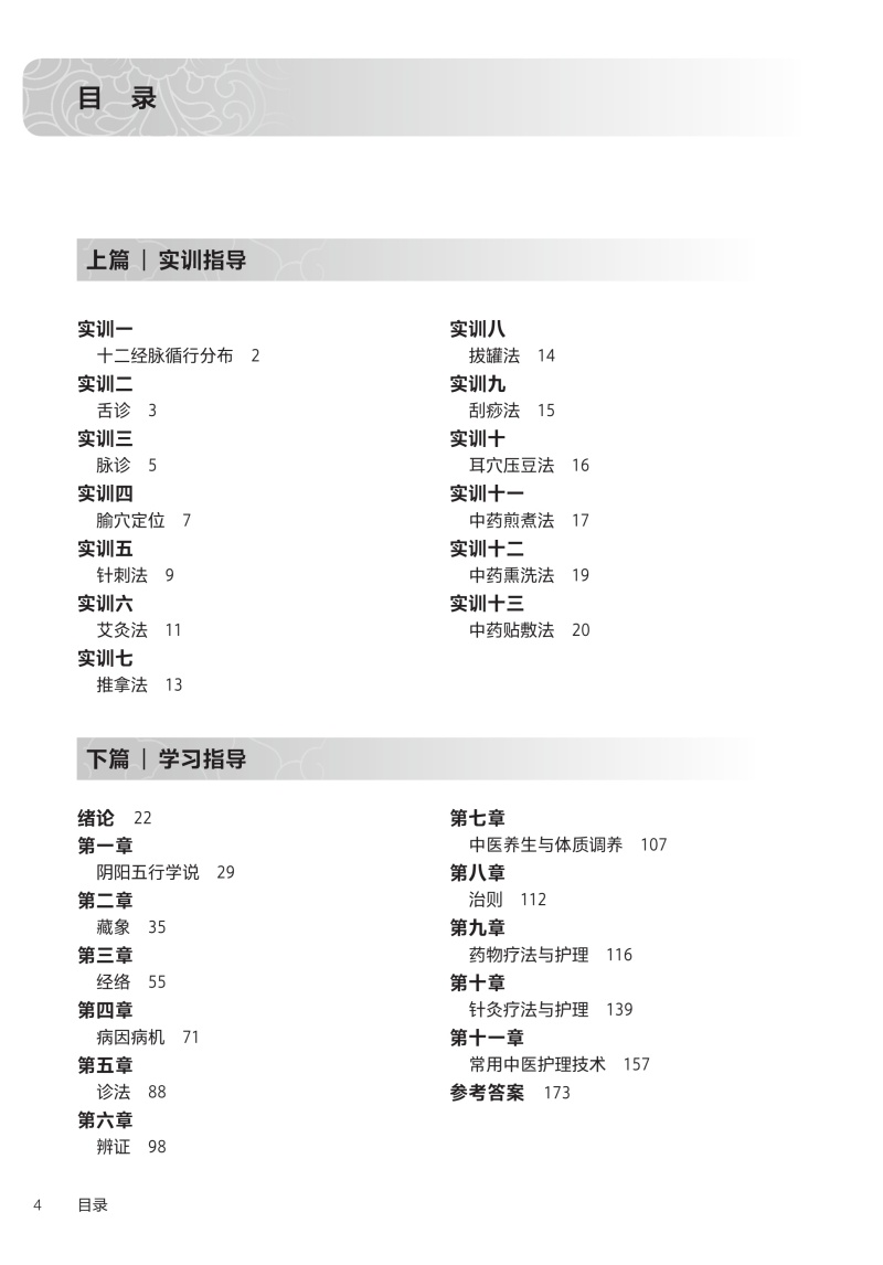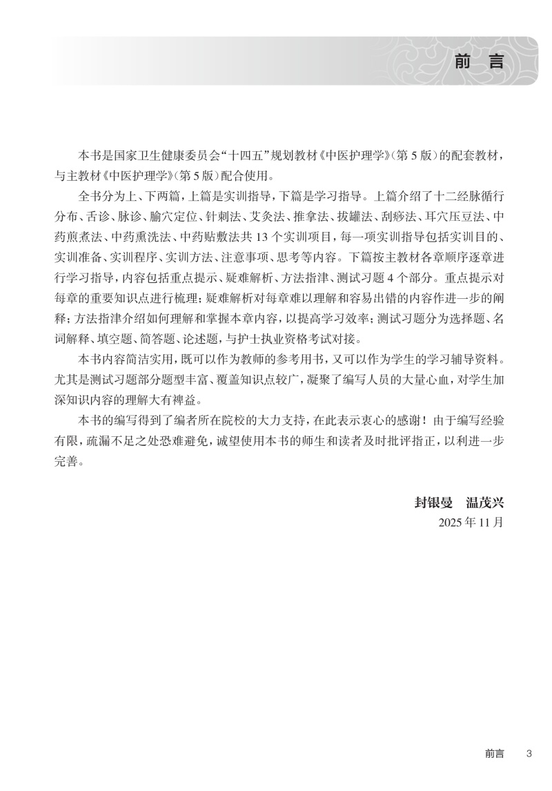 本书为高等职业教育专科护理类专业“十四五”规划教材配套教材之一,将突出目标意识,把教学目标作为编写的重点,做到目标明确,并把知识目标、能力目标和情感目标三者有机结合;强化实践性能,突出中医护理技术,以培养学生的创新精神和实践能力;拓展中医护理经典故事,传播中医药文化,坚定文化自信;融入思政教育和劳动教育,引导学生形成正确的人生观、世界观和价值观,树立劳动观念,培养爱国主义情怀,培养高尚的道德情操和良好的意志品质;教材与学材相结合,制作供学生学习的配套教材资源,实训指导和学习指导。