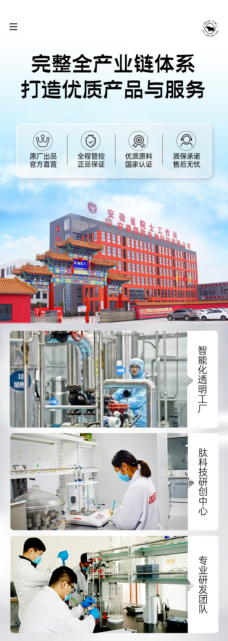 - 人民国肽秉承“全心全意为大众健康服务” 的品牌主张,携手全球前沿科研力量,以严谨的科学精神,打造更安心更卓效的小分子活性肽系列产品,成就追求健康生活人士的美好理想。