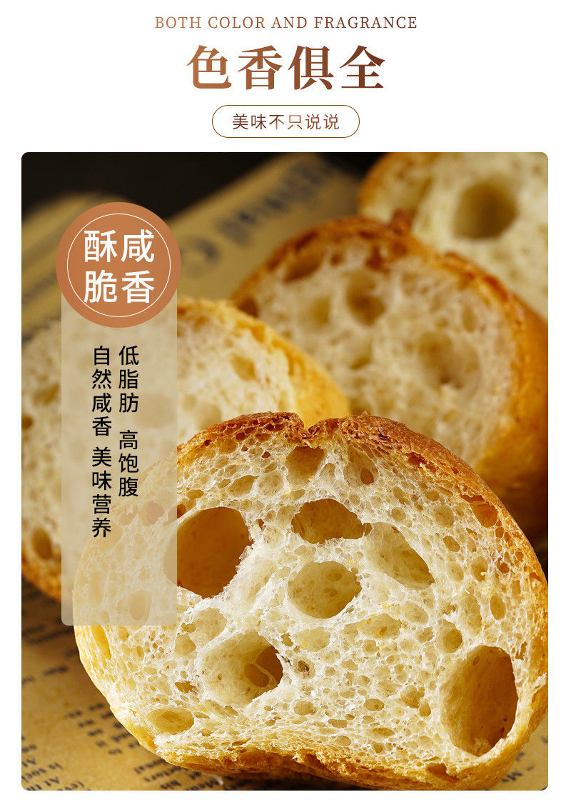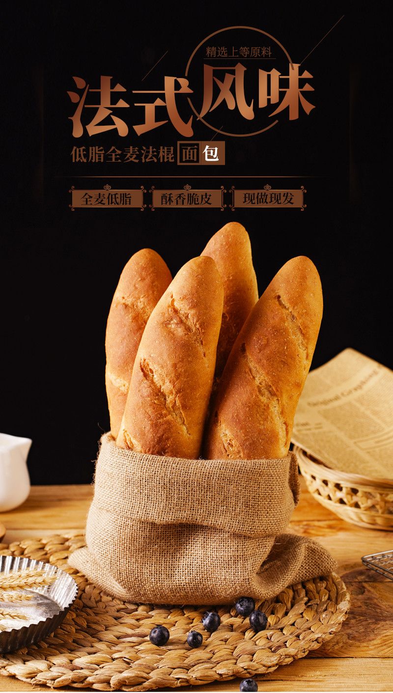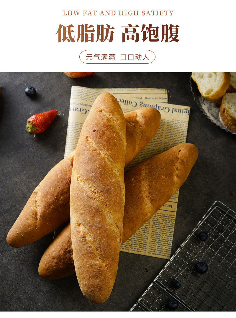 无蔗糖低脂全麦法棍面包 锻炼健身饱腹代餐法式风味全麦面包