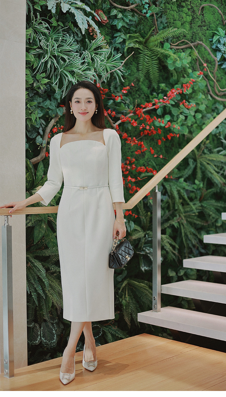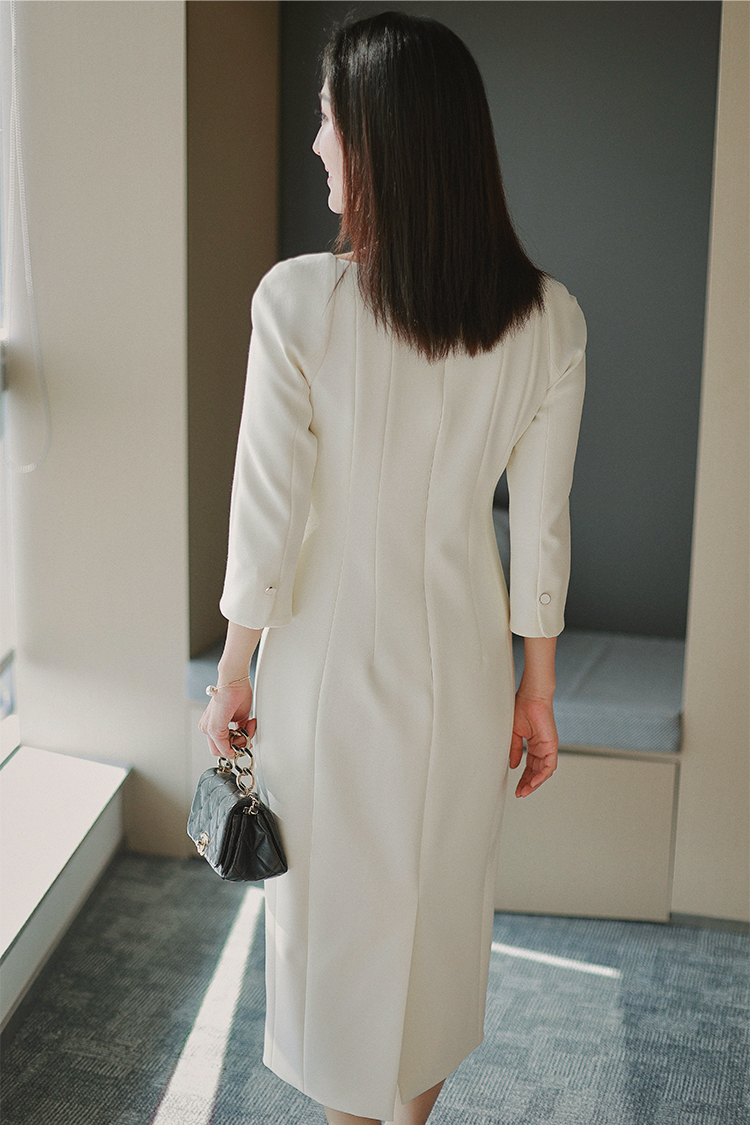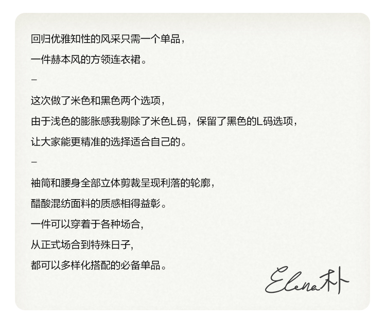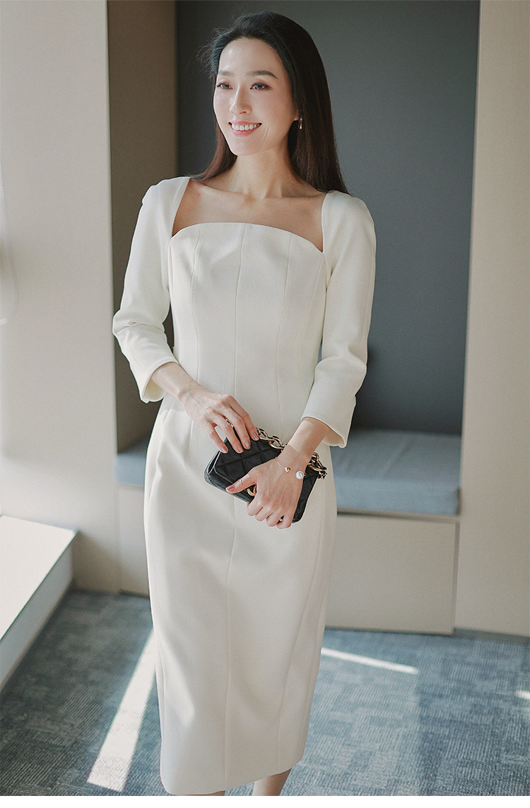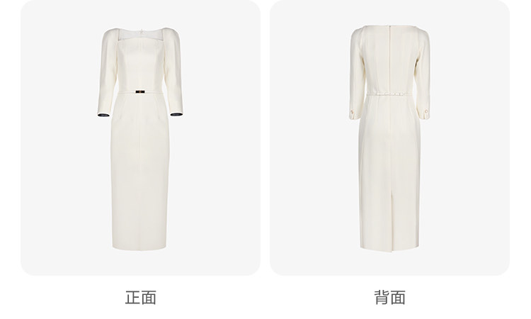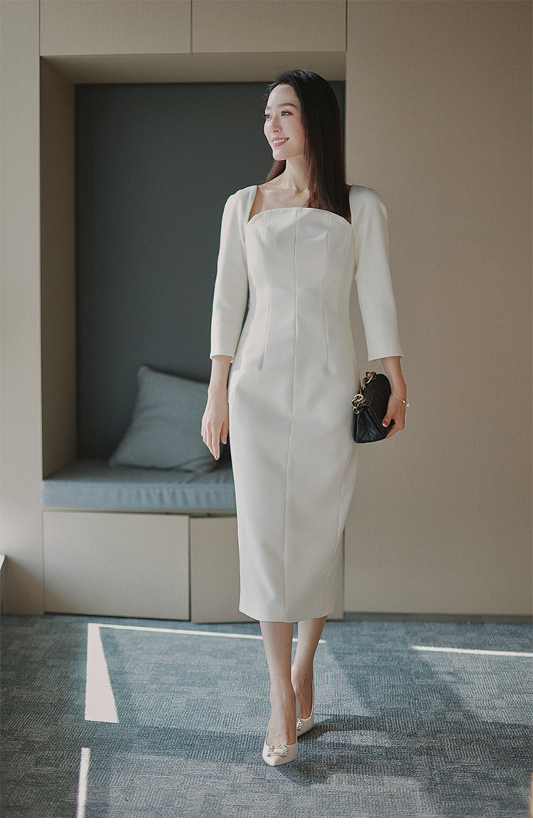 “赫本衣橱”质感通勤 花瓣方领设计 七分袖连衣裙