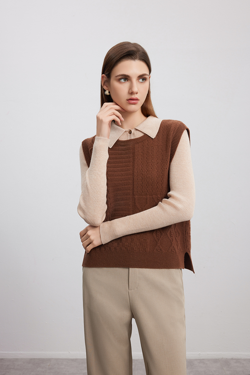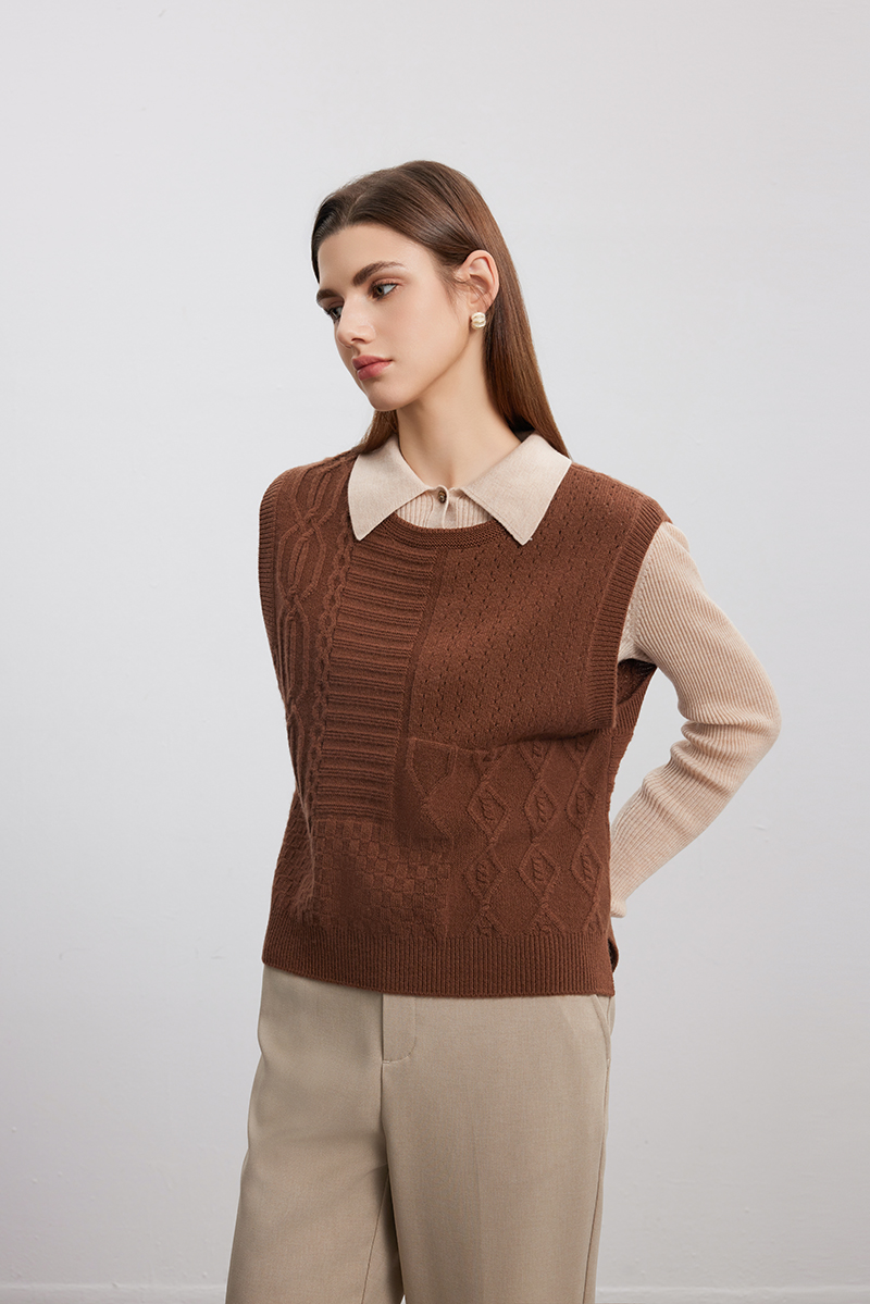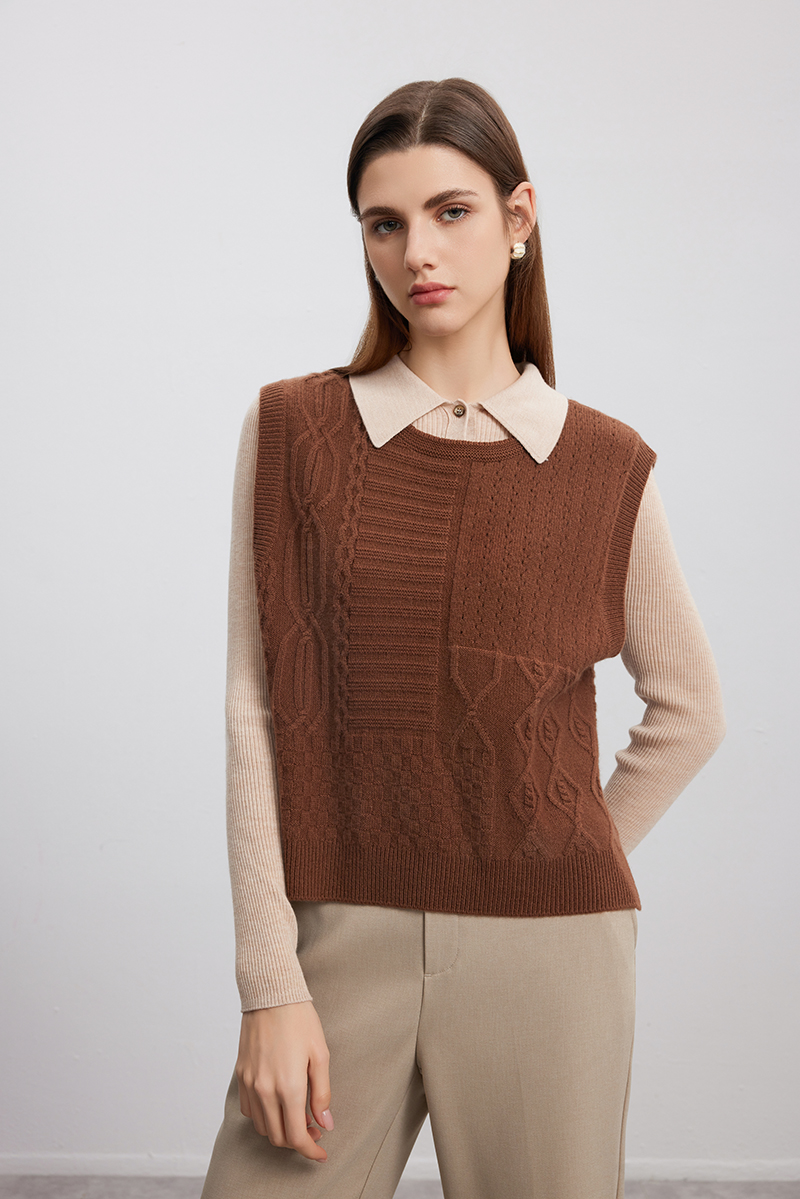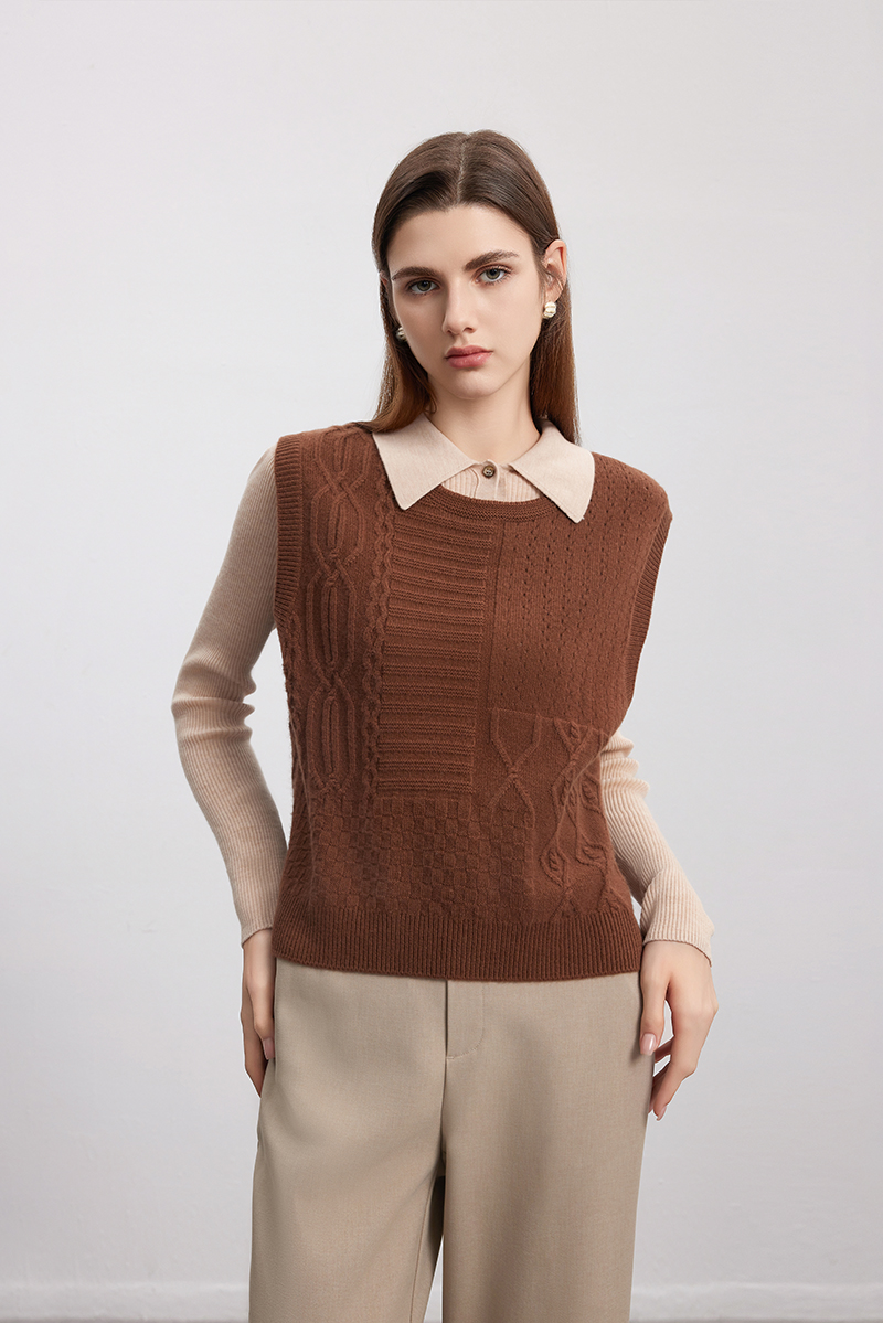【无袖绞花针织马甲】羊绒世家秋冬新品女士100%山羊绒圆领套头针织衫