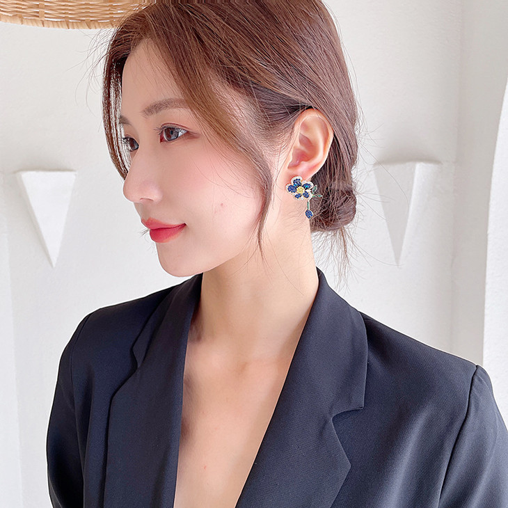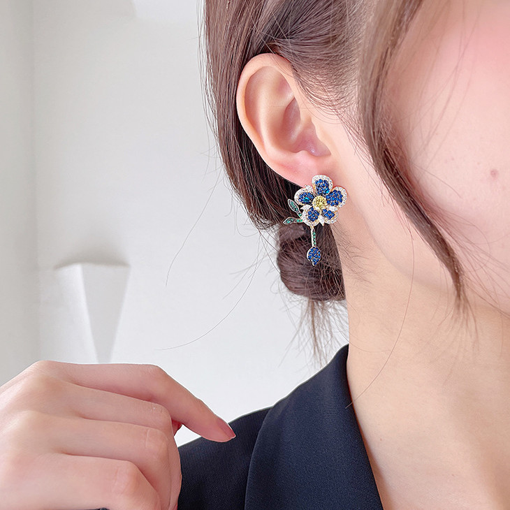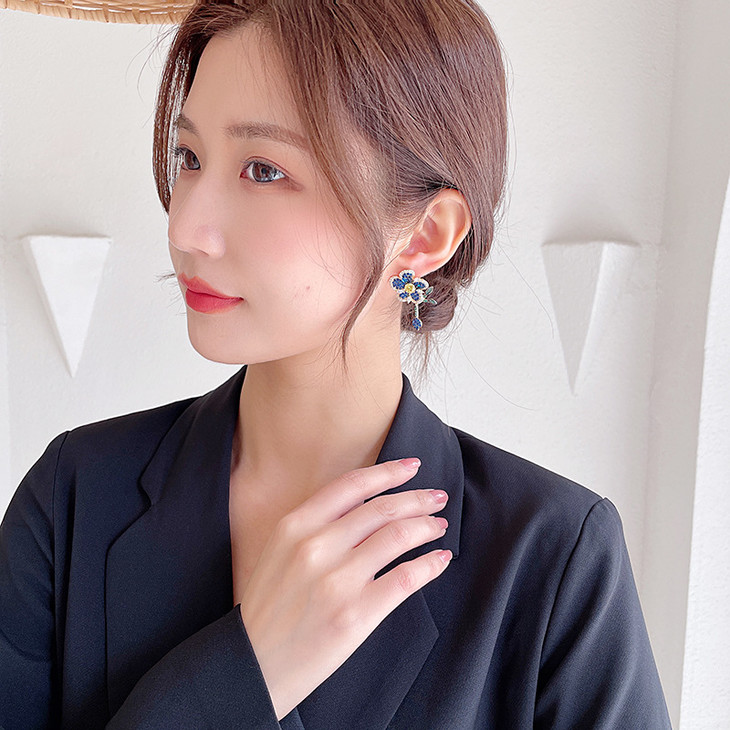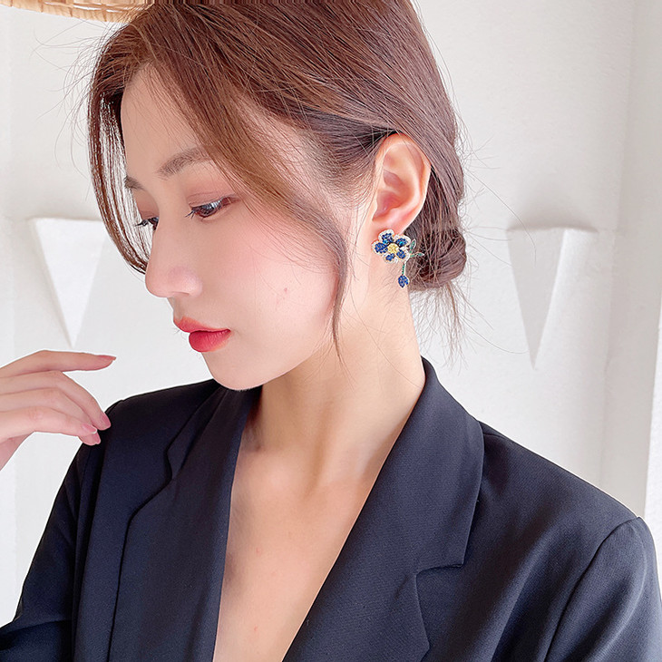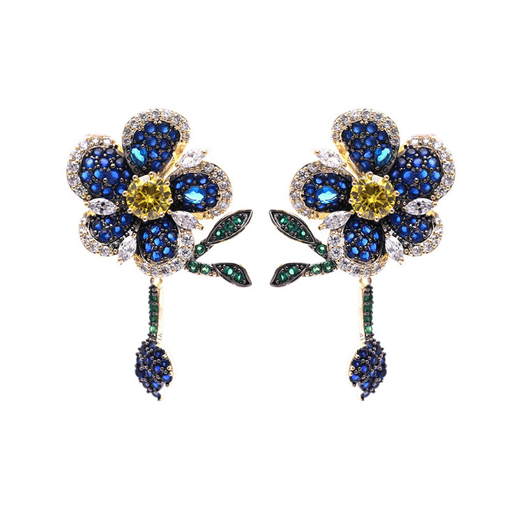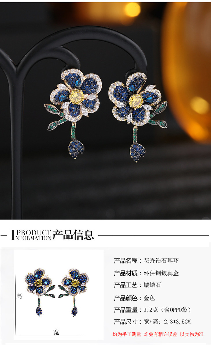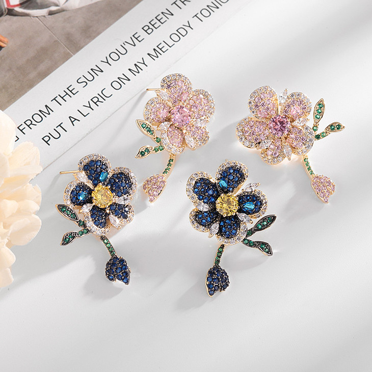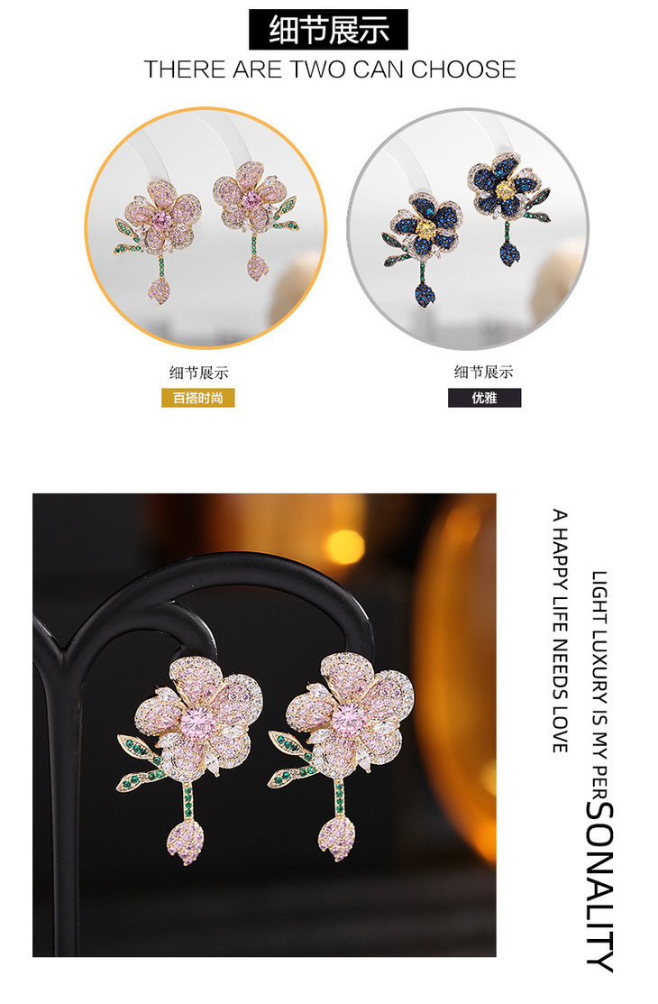 重工微镶彩色锆石灵动叶子气质耳钉,925银针立体花朵耳环LY-086