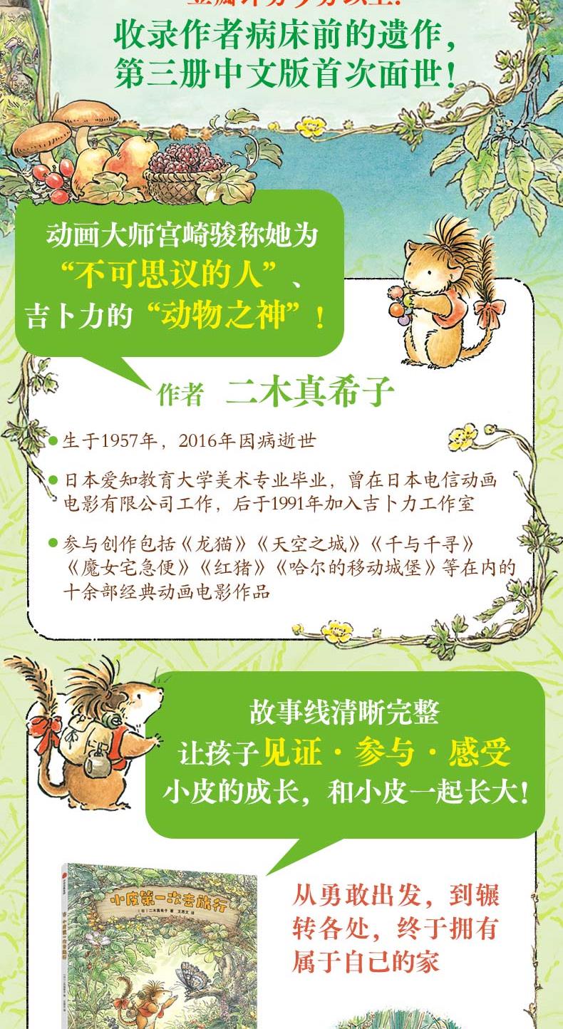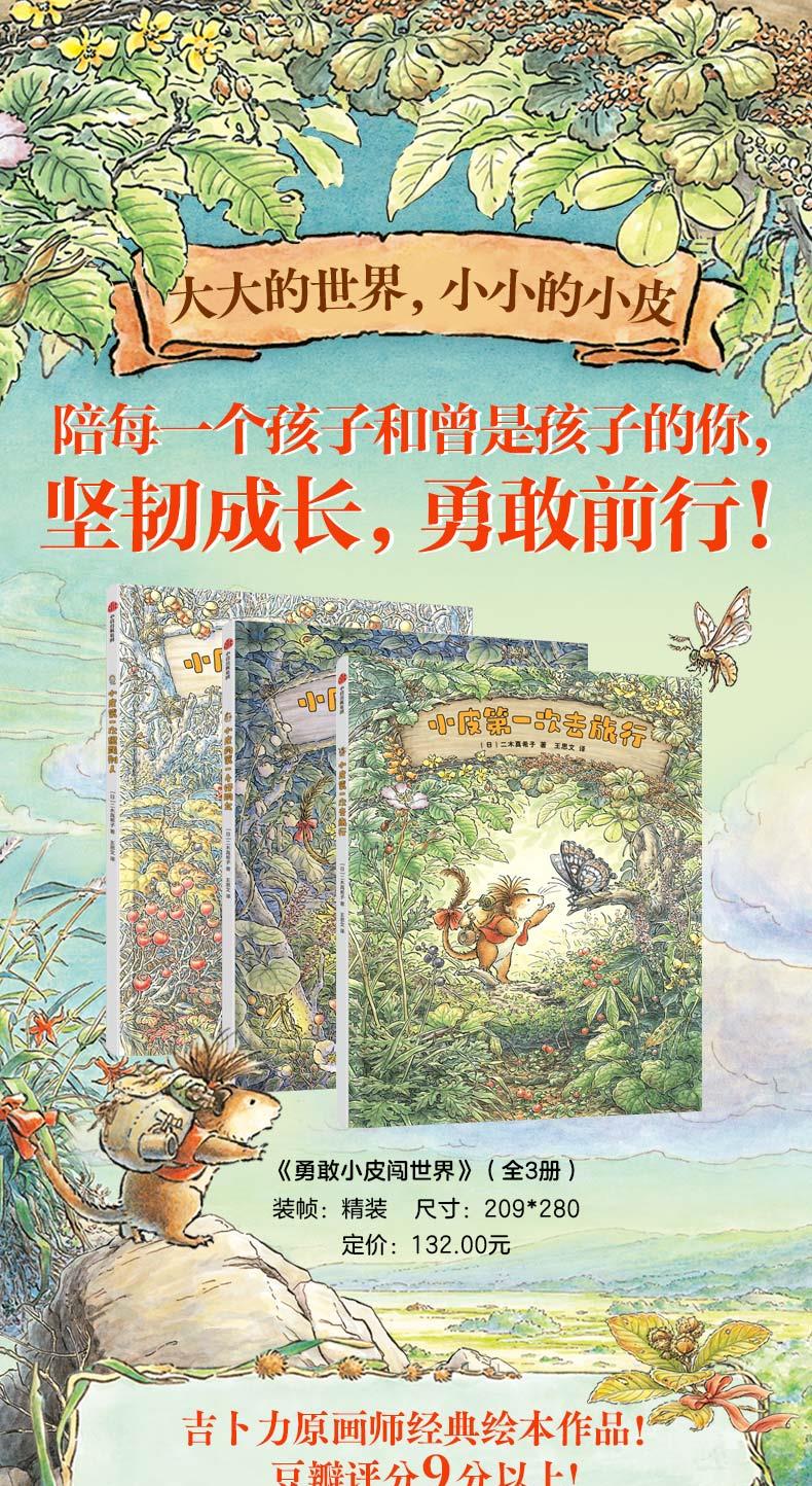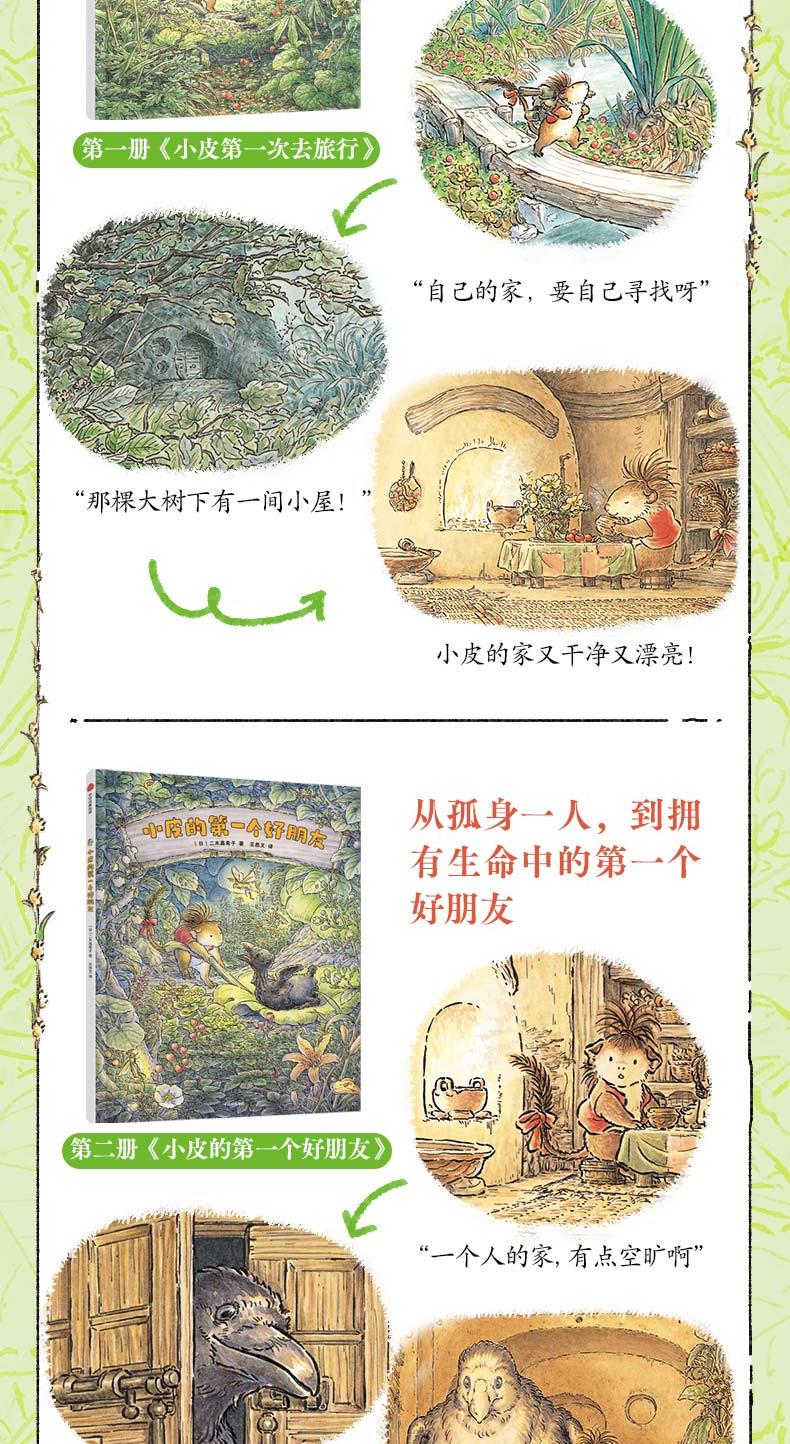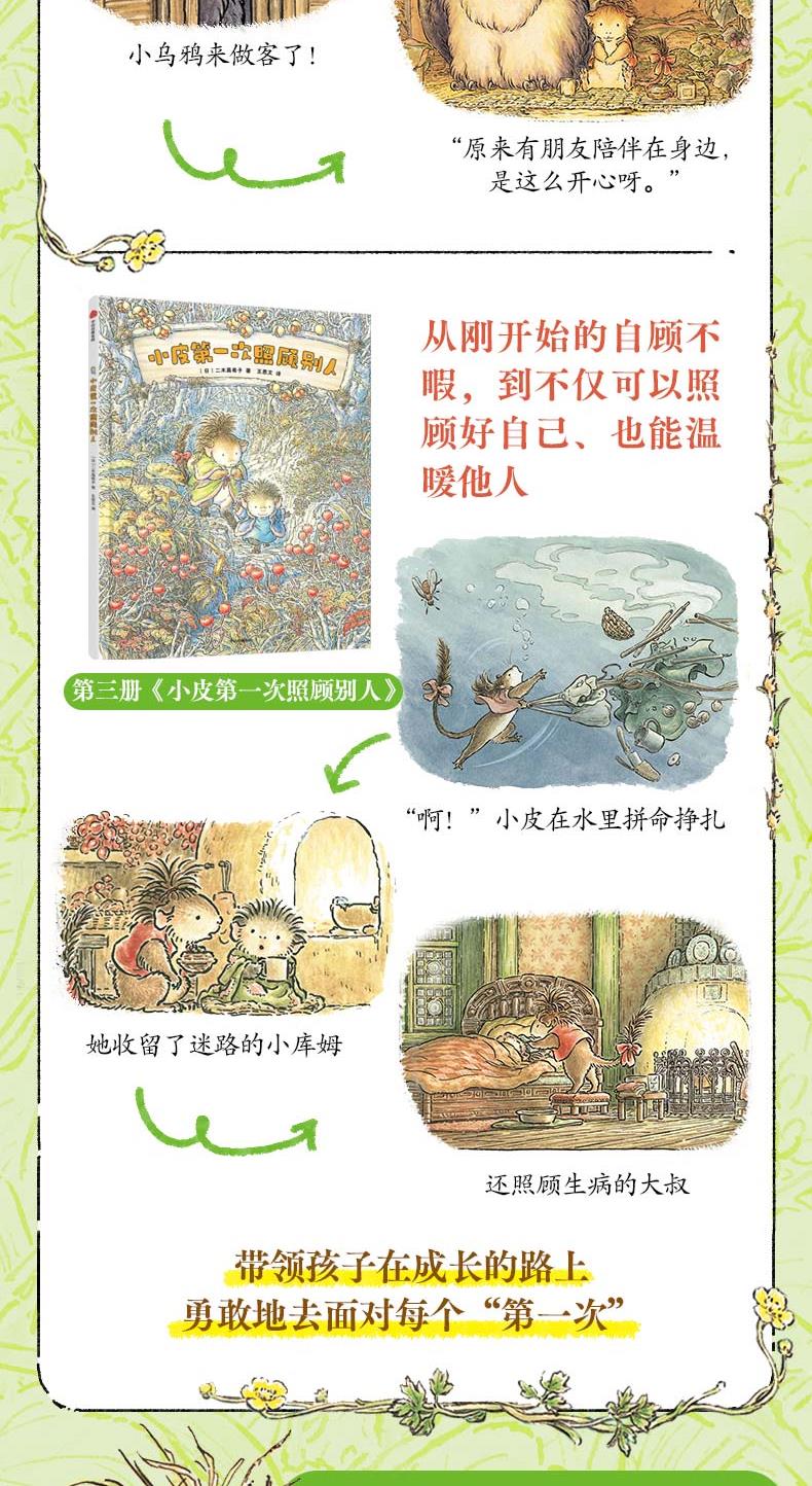 这套书共有3册,分册书名为《小皮第一次去旅行》《小皮的第一个好朋友》《小皮第一次照顾别人》。 《小皮第一次去旅行》 初夏时节,一个阳光明媚的早上,小皮和父母道别,背上背包出门远行。在茂密森林中跋涉,在繁华城市里穿梭,小皮想要寻找属于自己的家。 她经过了好多地方:高高的岩石上视野很好,小皮决定在岩石缝隙里支起帐篷,可是风太大了;河边的洞穴看起来也不错,可是小皮一个不小心滚落进了水里; 最后,历经一番周折,小皮终于找到了属于自己的家,她把小家收拾得井井有条,温暖又温馨。 小皮是一个勇敢、独立的小姑娘,她离开父母,独自踏上了成长的旅途,就像每个孩子的成长一样,有艰难险阻,有温暖感动,经历过每个“第一次”,然后渐渐长大。 《小皮的第一个好朋友》 一天,小皮来到卡兹先生的杂货店,想要购买一些过冬的物品,她在杂货店的角落里看到了一块特别漂亮的彩色花纹玻璃,十分喜欢,她想用这块玻璃装饰自己的家。可这块玻......