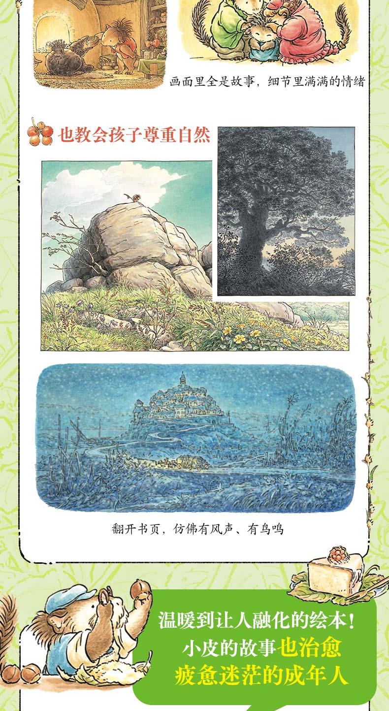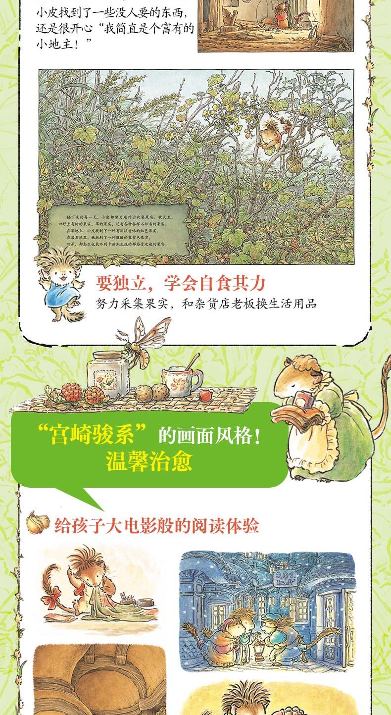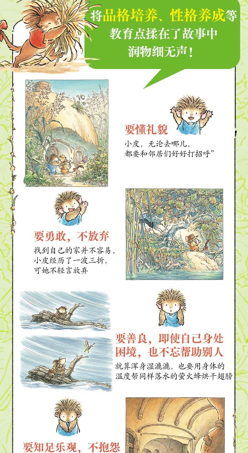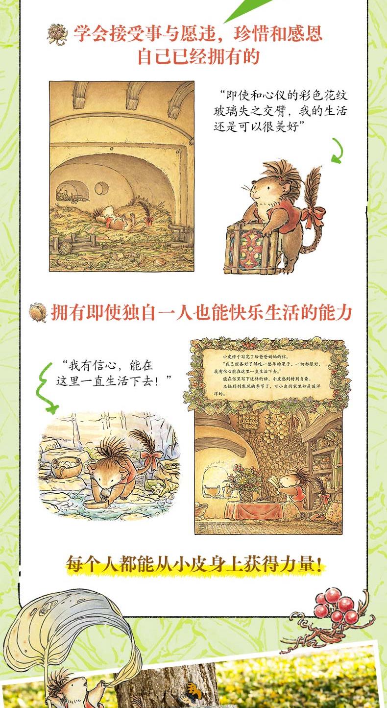 这套书共有3册,分册书名为《小皮第一次去旅行》《小皮的第一个好朋友》《小皮第一次照顾别人》。 《小皮第一次去旅行》 初夏时节,一个阳光明媚的早上,小皮和父母道别,背上背包出门远行。在茂密森林中跋涉,在繁华城市里穿梭,小皮想要寻找属于自己的家。 她经过了好多地方:高高的岩石上视野很好,小皮决定在岩石缝隙里支起帐篷,可是风太大了;河边的洞穴看起来也不错,可是小皮一个不小心滚落进了水里; 最后,历经一番周折,小皮终于找到了属于自己的家,她把小家收拾得井井有条,温暖又温馨。 小皮是一个勇敢、独立的小姑娘,她离开父母,独自踏上了成长的旅途,就像每个孩子的成长一样,有艰难险阻,有温暖感动,经历过每个“第一次”,然后渐渐长大。 《小皮的第一个好朋友》 一天,小皮来到卡兹先生的杂货店,想要购买一些过冬的物品,她在杂货店的角落里看到了一块特别漂亮的彩色花纹玻璃,十分喜欢,她想用这块玻璃装饰自己的家。可这块玻......