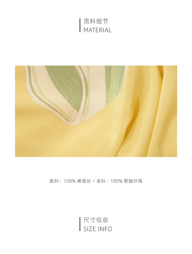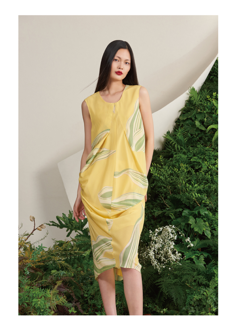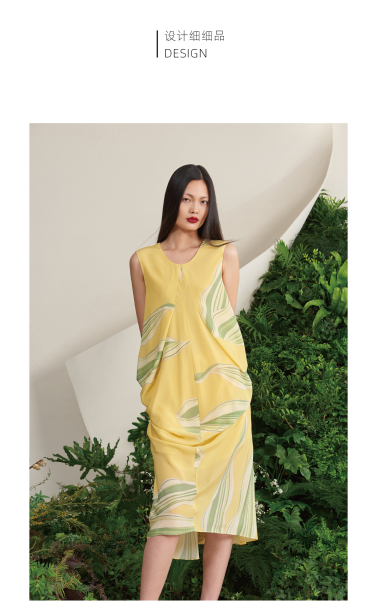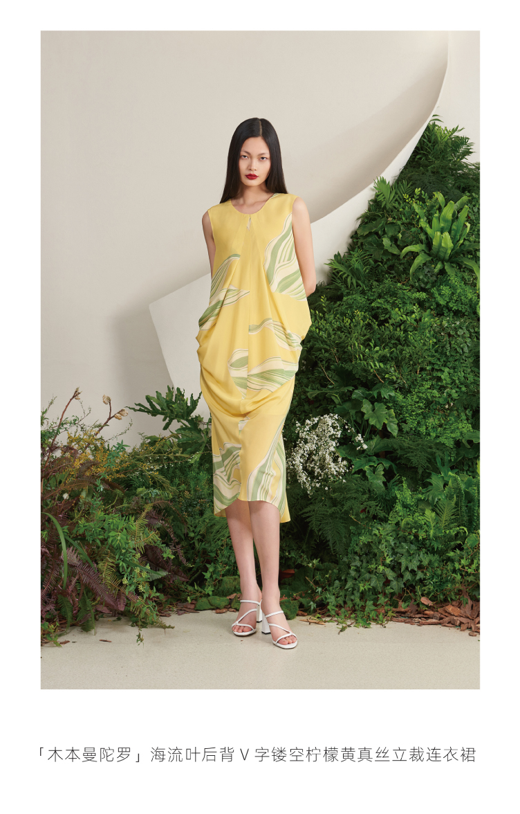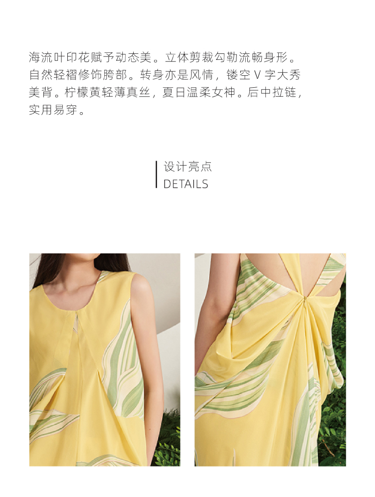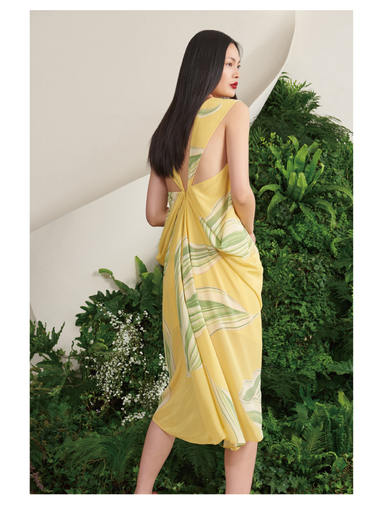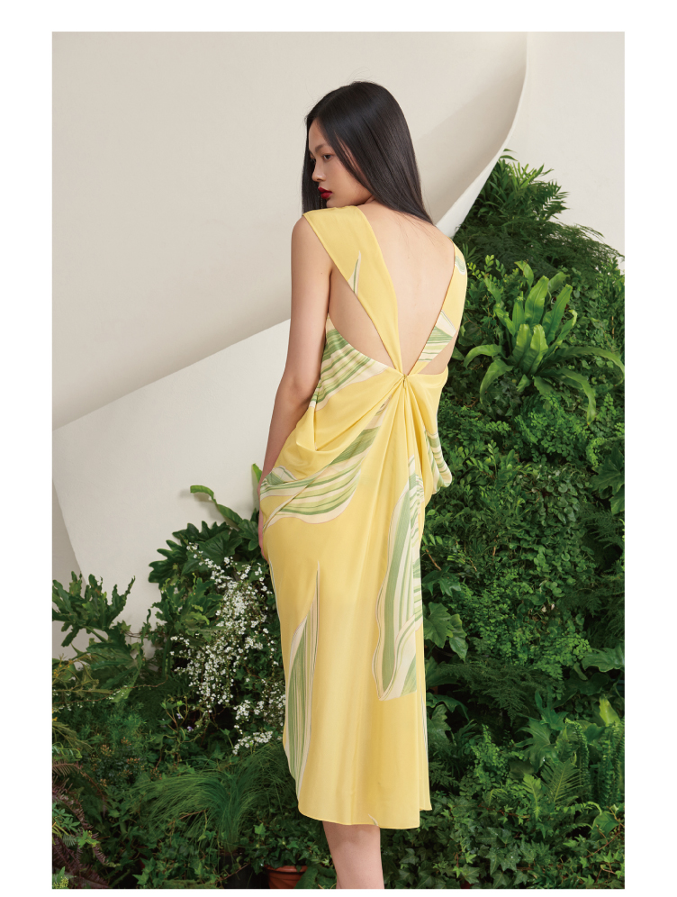 【木本曼陀罗】海流叶后背V字镂空柠檬黄真丝立裁连衣裙/0000659E