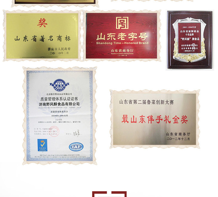 - 济南野风酥食品有限公司是一家从事绿色无公害农产品深加工,生产山东特产食品的企业。职工总人数586人,其中高中级技术人员56人。2007年济南野风酥食品有限公司被山东省人民政府授予省级农业产业化经营重点龙头企业。我公司生产的糖酥煎饼等系列产品曾连续获农业部、山东省优质产品奖,被人民大会堂定为国宴用品。“九顶塔”牌商标获得“省优”“部优”商标称号。全国著名的营养学家于若木曾来厂视察并亲笔题词,姜春云、苏毅然等国家、省级领导先后来厂视察。“野风酥”被中国食品协会评为“优秀民族食品”,获得“中华名吃”称号。产品连续获得国家级食品展销会的畅销产品奖,成为山东省的特色食品,省、市旅游局的十佳旅游商品。“山东煎饼”和“山东烧饼” 被认证为绿色食品。