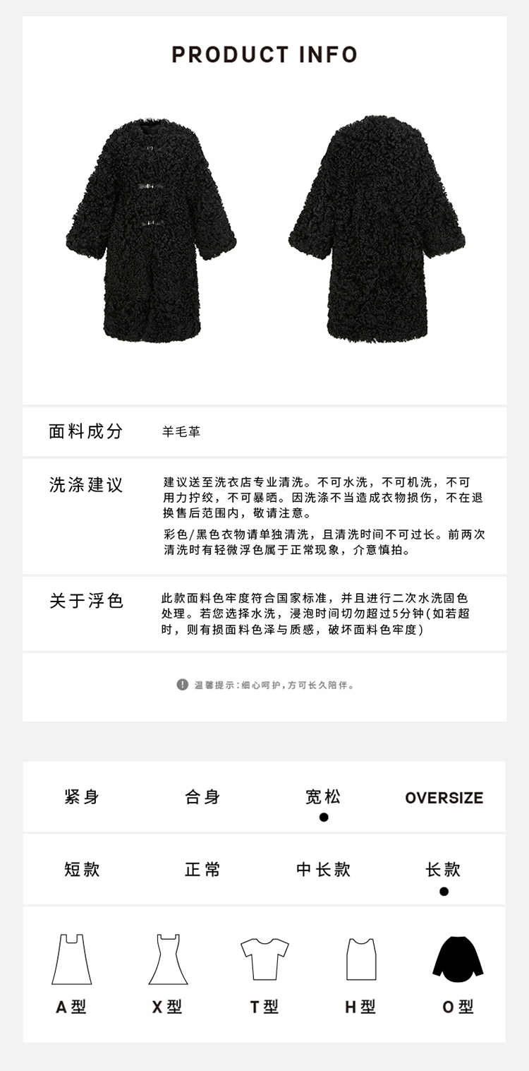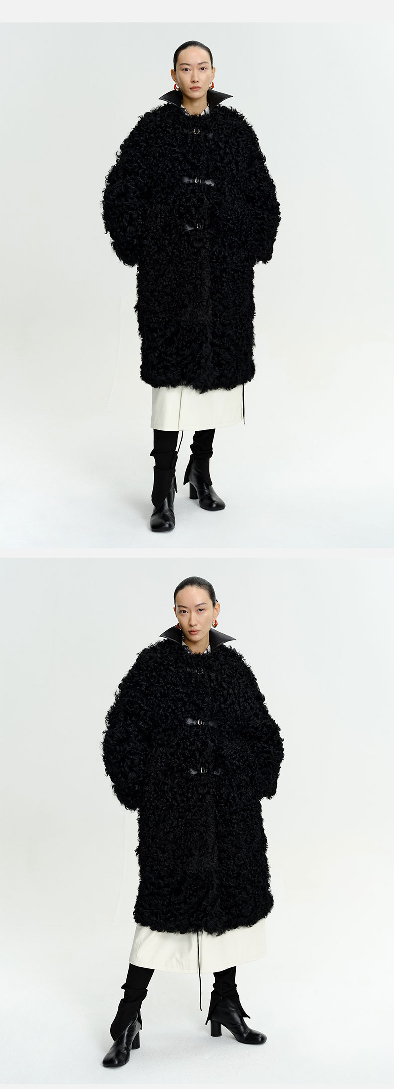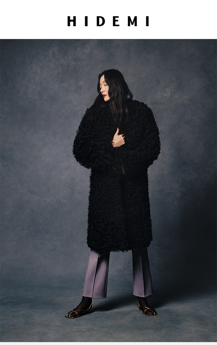 HIDEMI 西班牙皮毛一体黑色长款廓形皮扣大衣外套