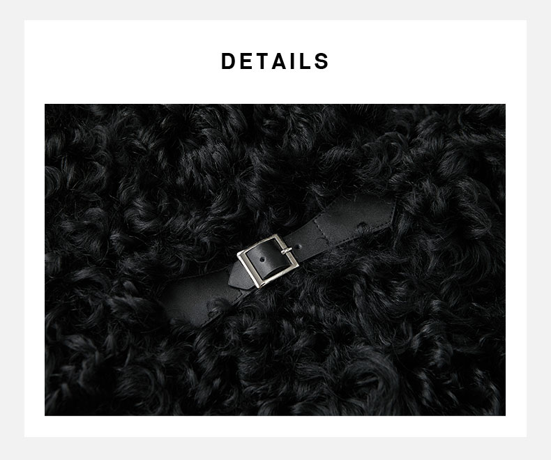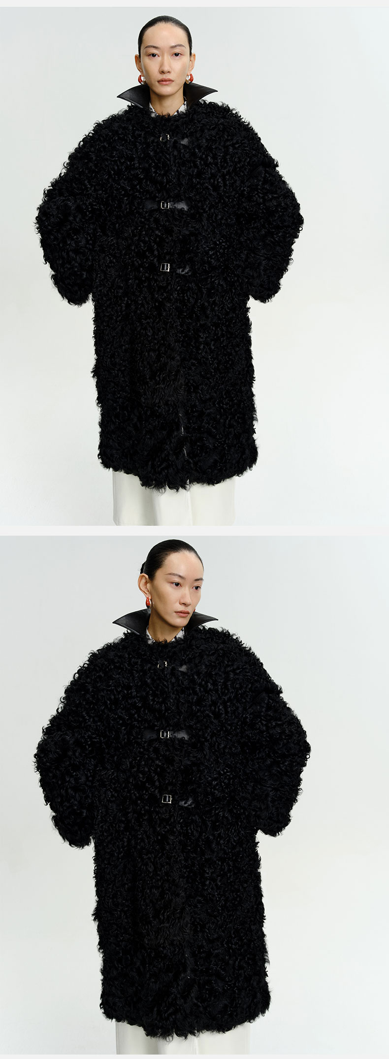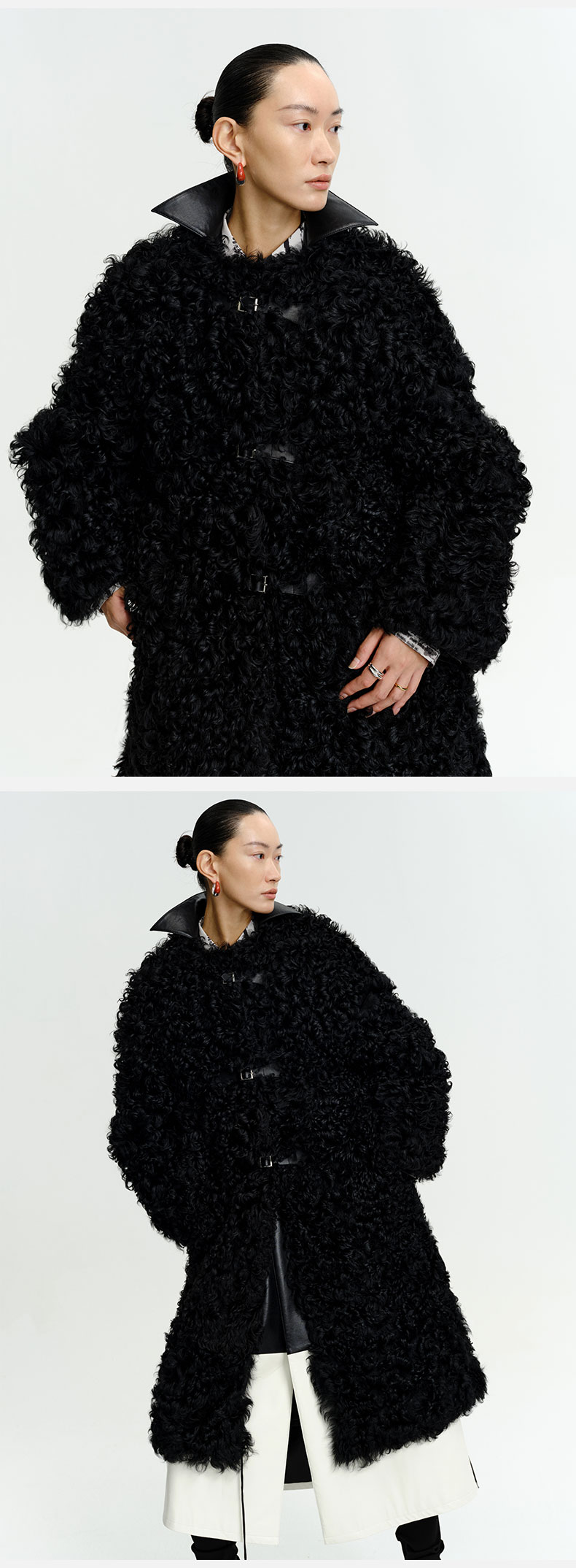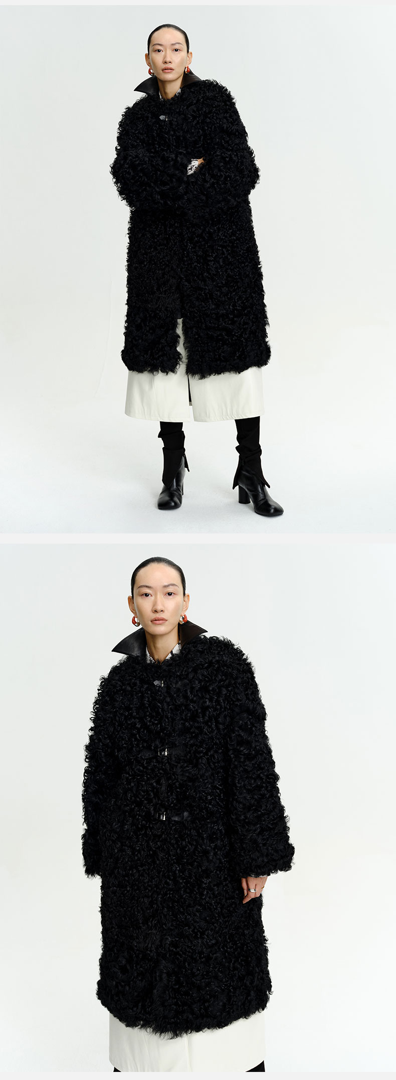HIDEMI 西班牙皮毛一体黑色长款廓形皮扣大衣外套