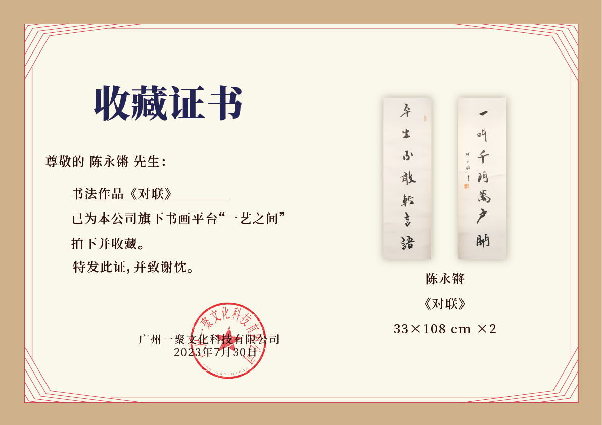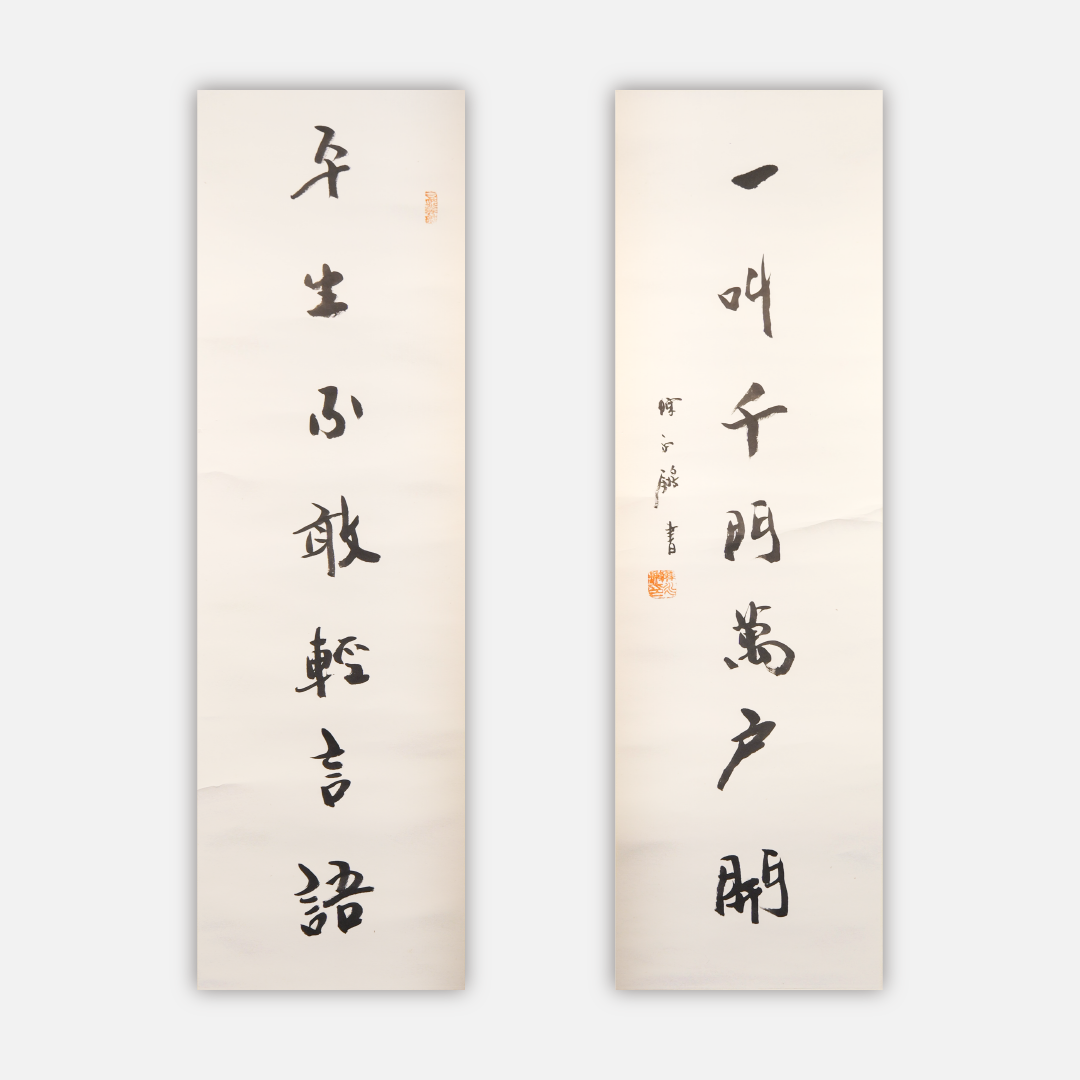 陈永锵书法108x33CM《平生不敢轻言语,一叫千门万户开》6.42平尺手写纸本宣纸对联[原作编号:SF0421]