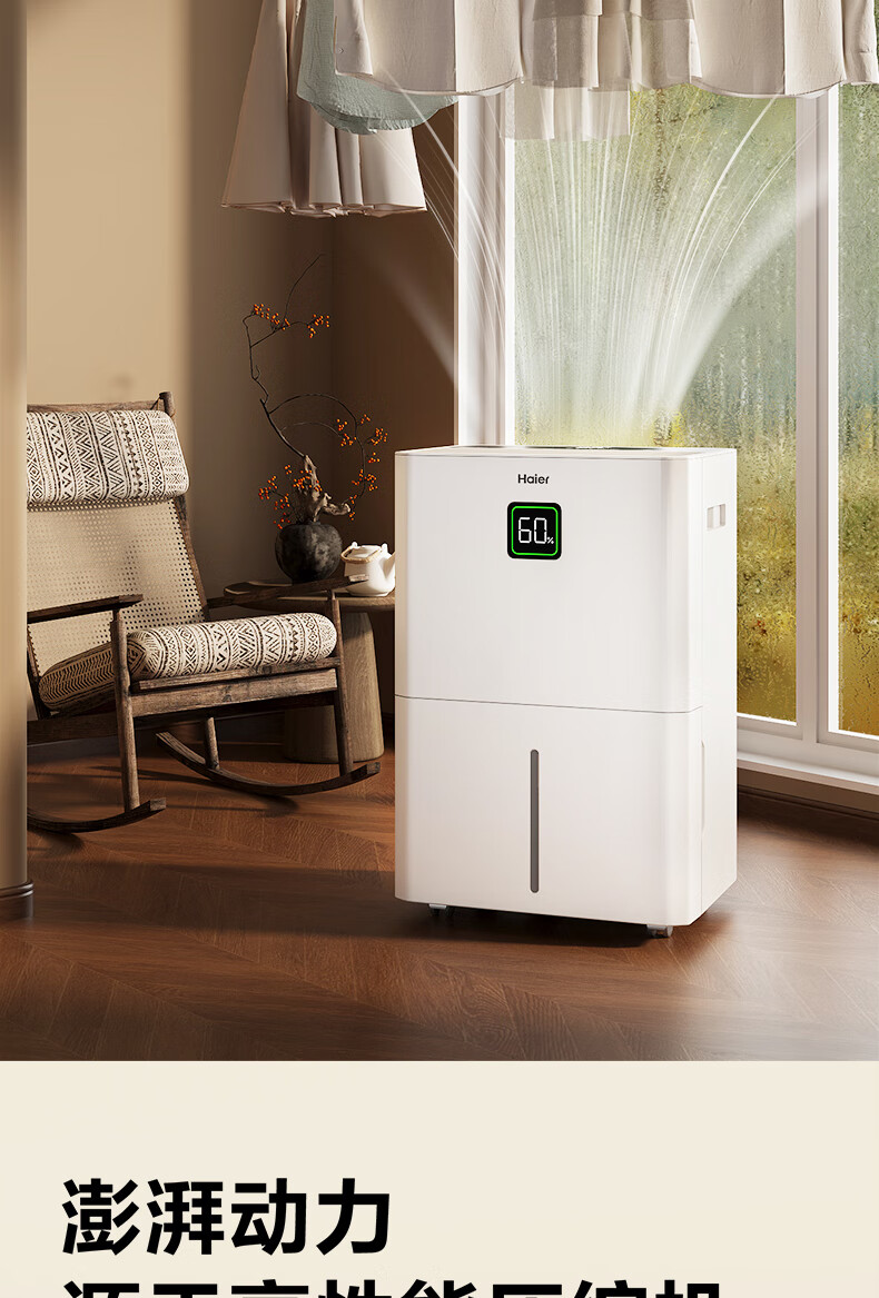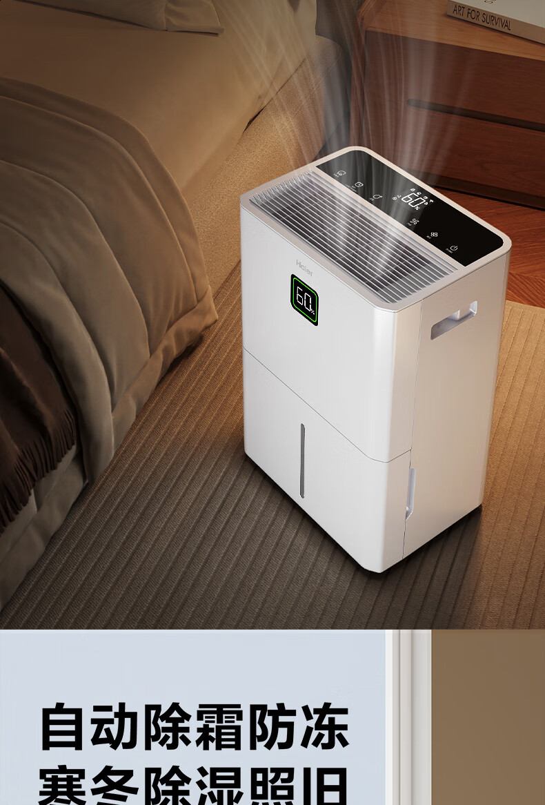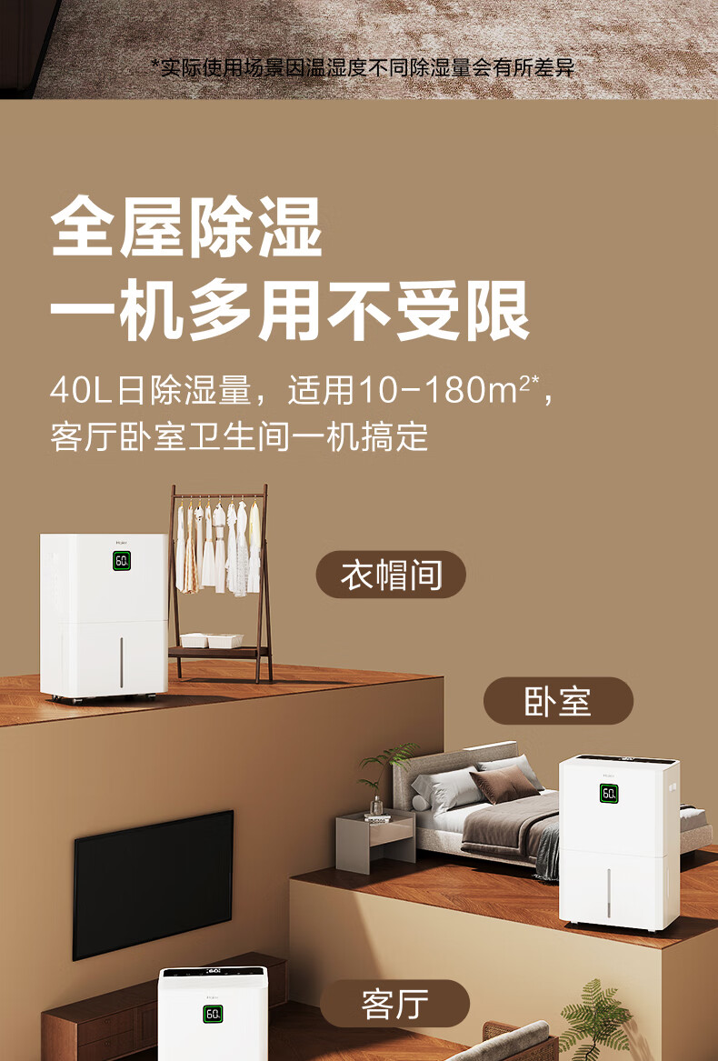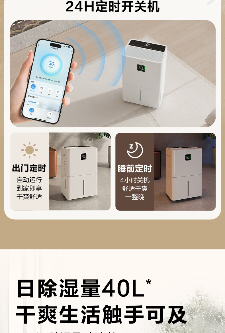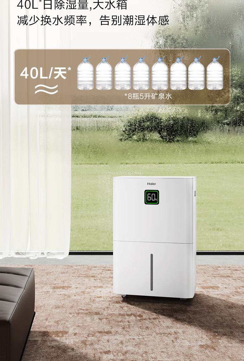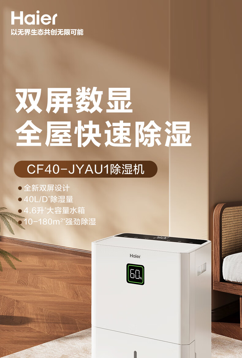 海尔(Haier)除湿机家用地下室带水管排水室内低音可净化干衣压缩机式智能app操控大功率吸湿器CF40-JYAU1