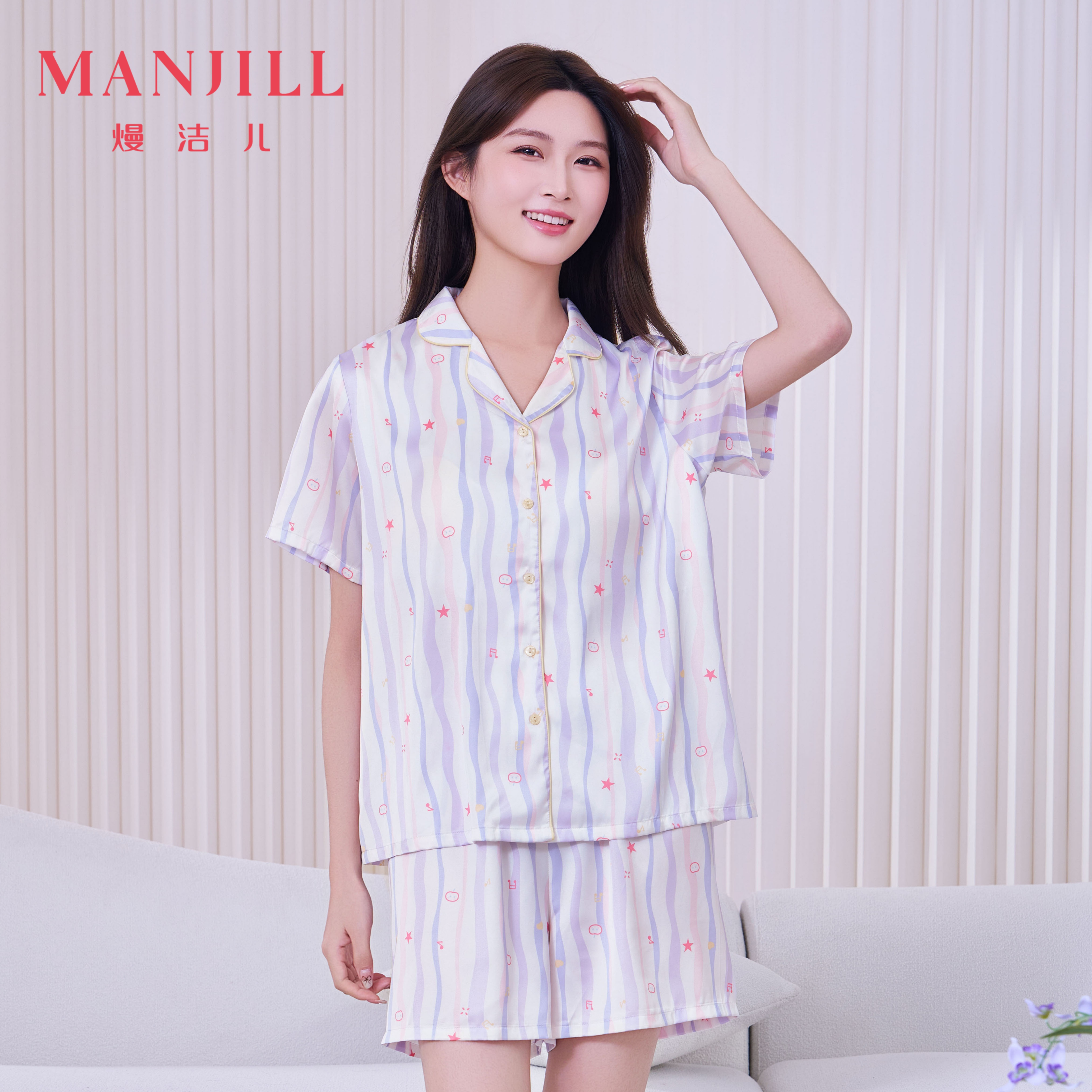 【商场同款】熳洁儿 带杯垫冰雪丝家居服夏日多巴胺条纹短袖开衫套装26203107