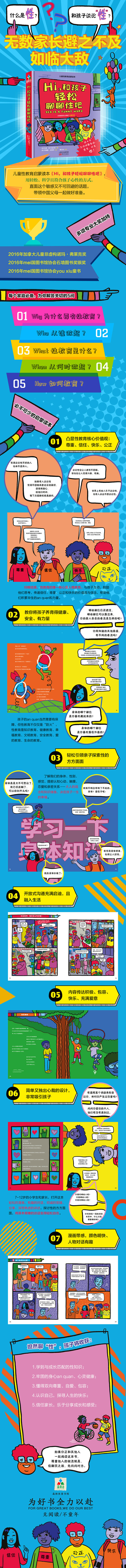 孩子学习性和相关知识,《Hi,和孩子轻松聊聊性吧》是一本全新的奇妙之书,独出心裁、包罗广泛又充满启迪! 颜色明快、内容巧妙,书中的主要人物仔仔、库珀、米米和奥马尔给孩子们鼓舞,尝试各种方法探索自身感觉,勇于提问,懂得成为自己。在性教育中,本书将多样性和公正放在核心位置——这正是它应有的位置!