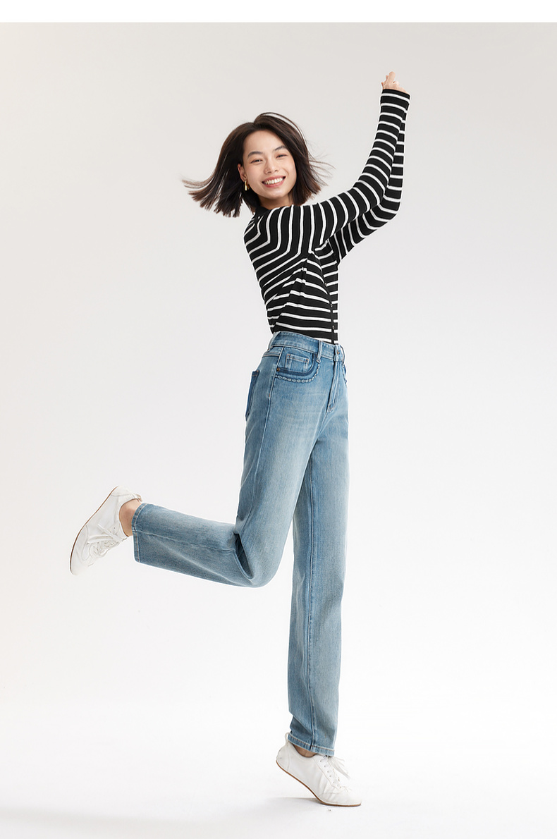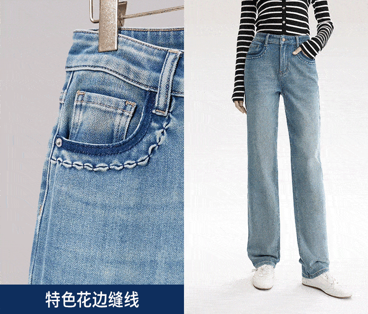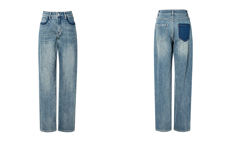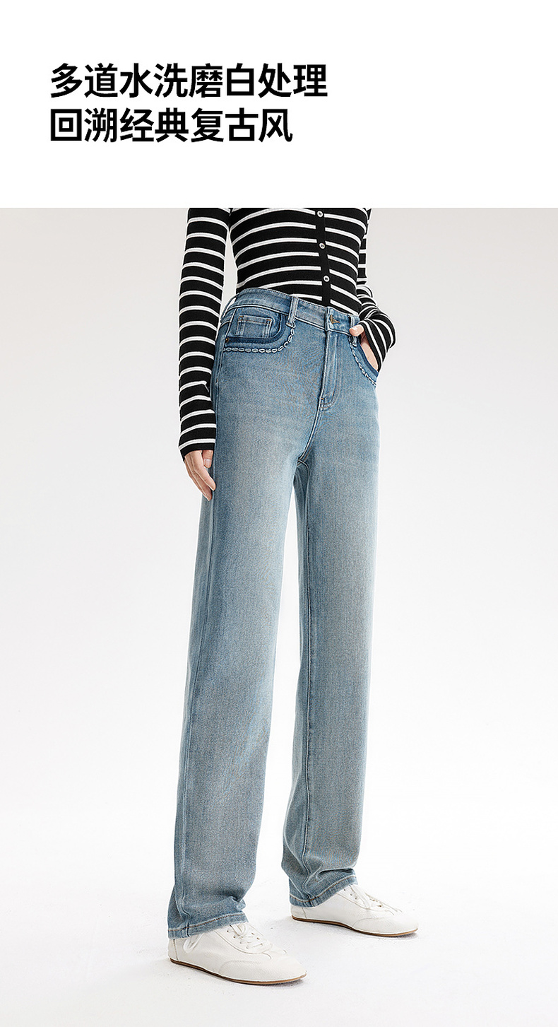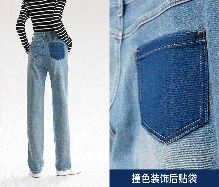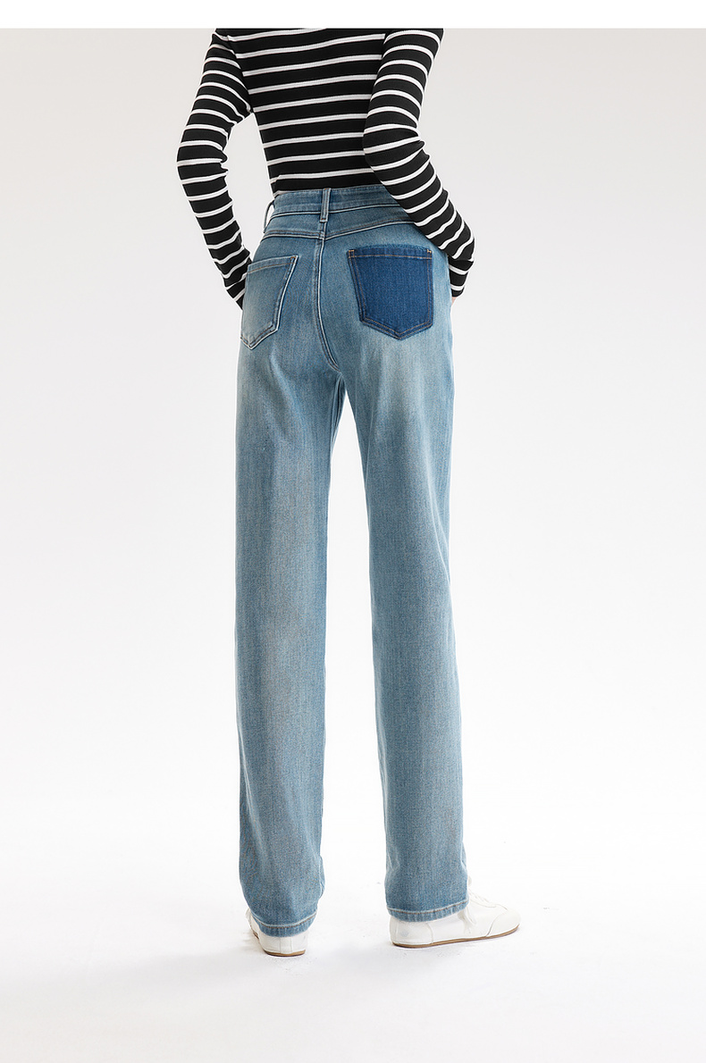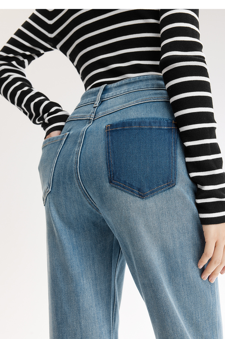 【严选】伊芙丽万向弹口袋撞色设计老爹牛仔裤女2024秋装新款显瘦百搭裤子1F7951271
