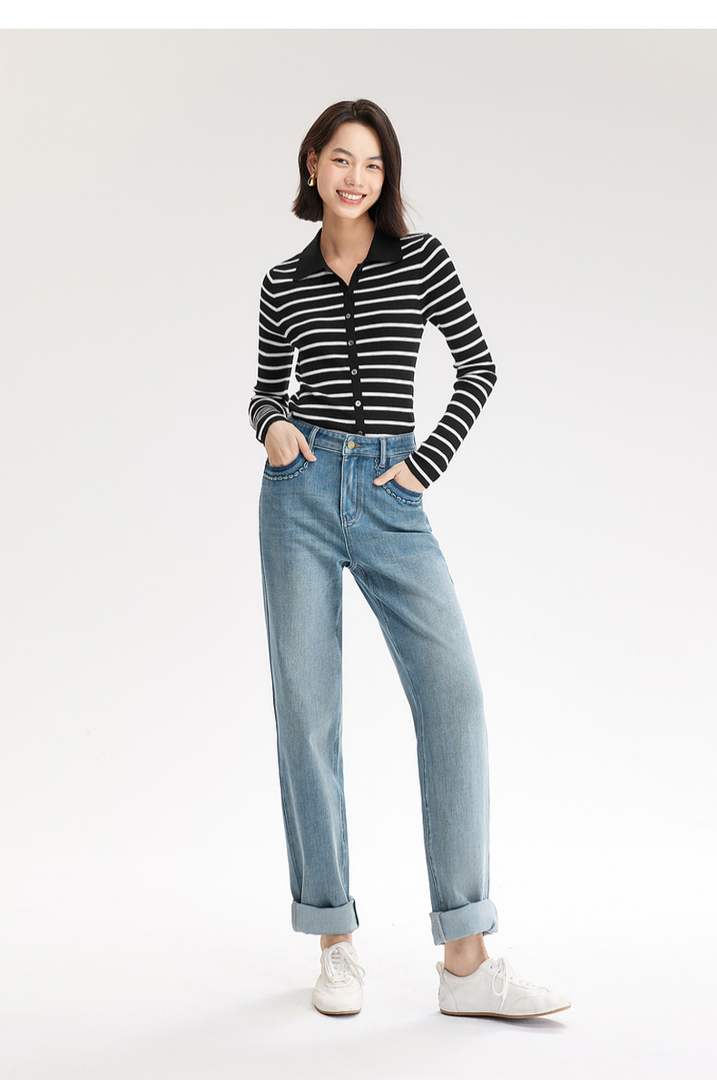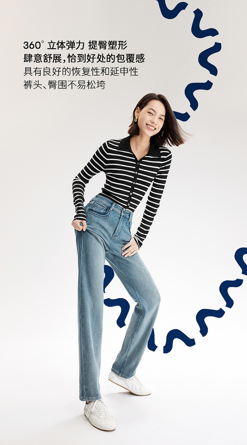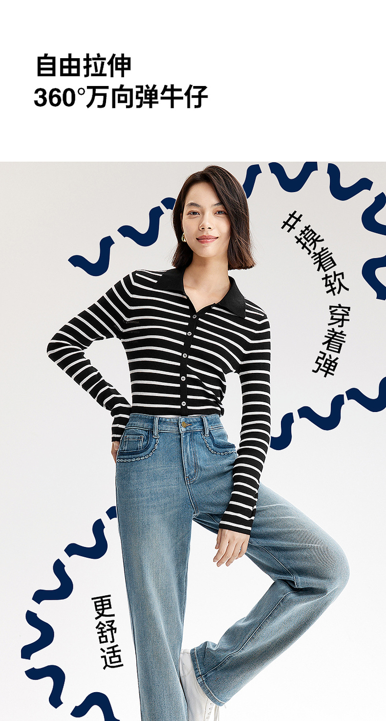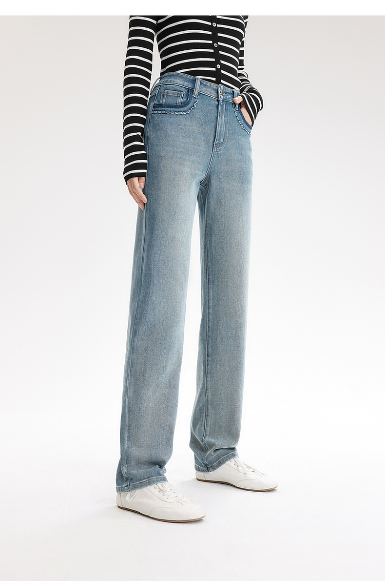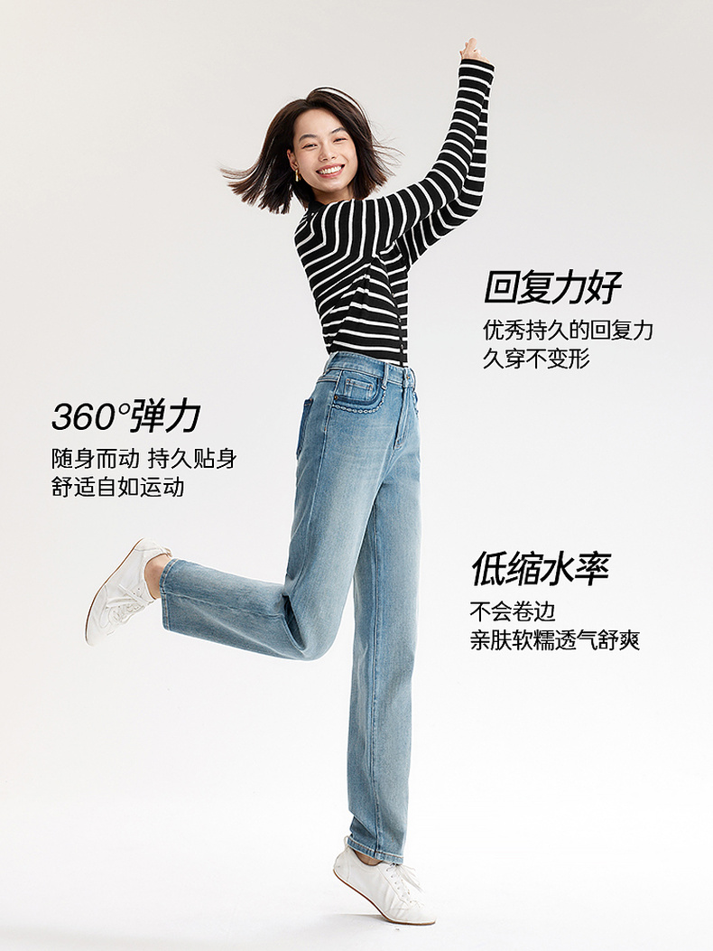 【严选】伊芙丽万向弹口袋撞色设计老爹牛仔裤女2024秋装新款显瘦百搭裤子1F7951271