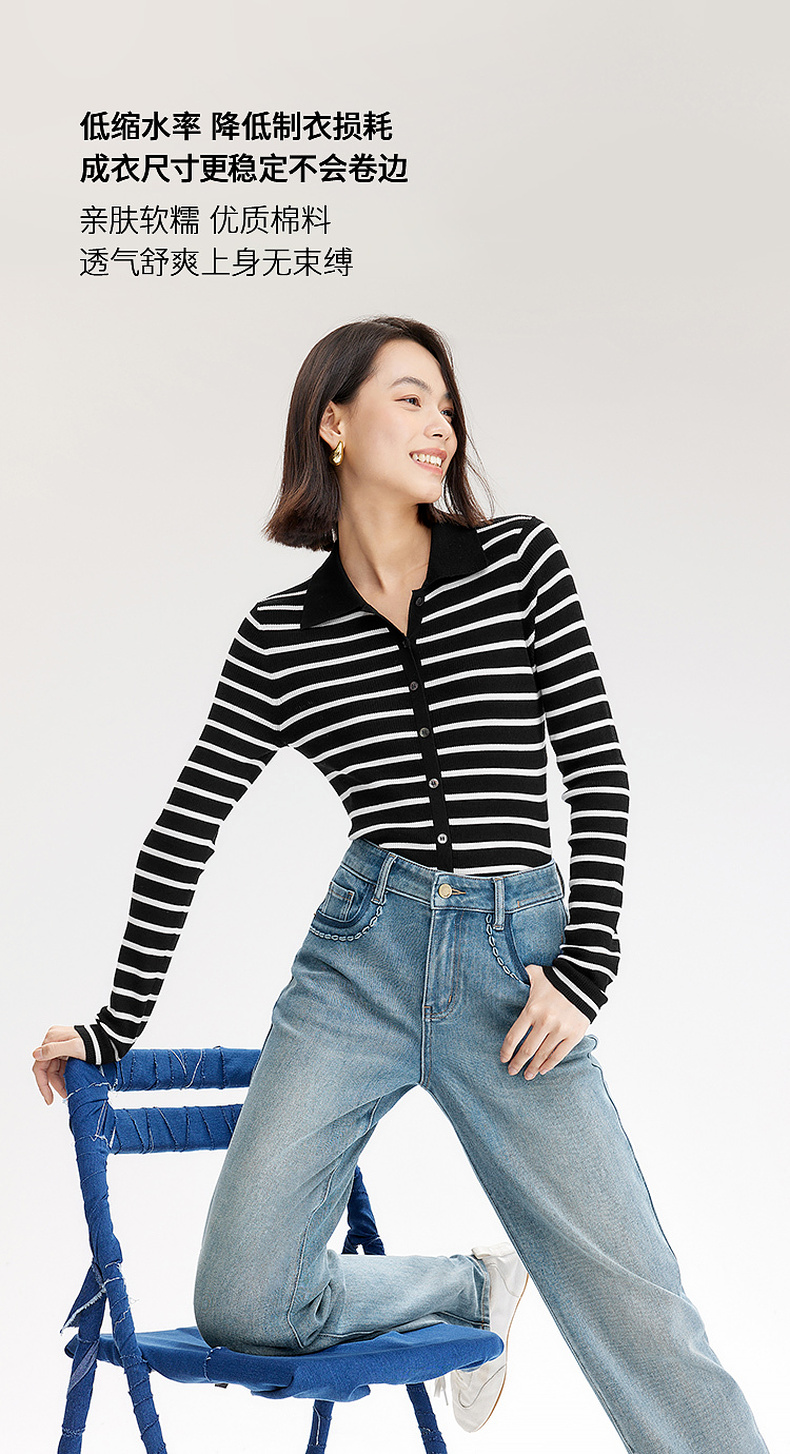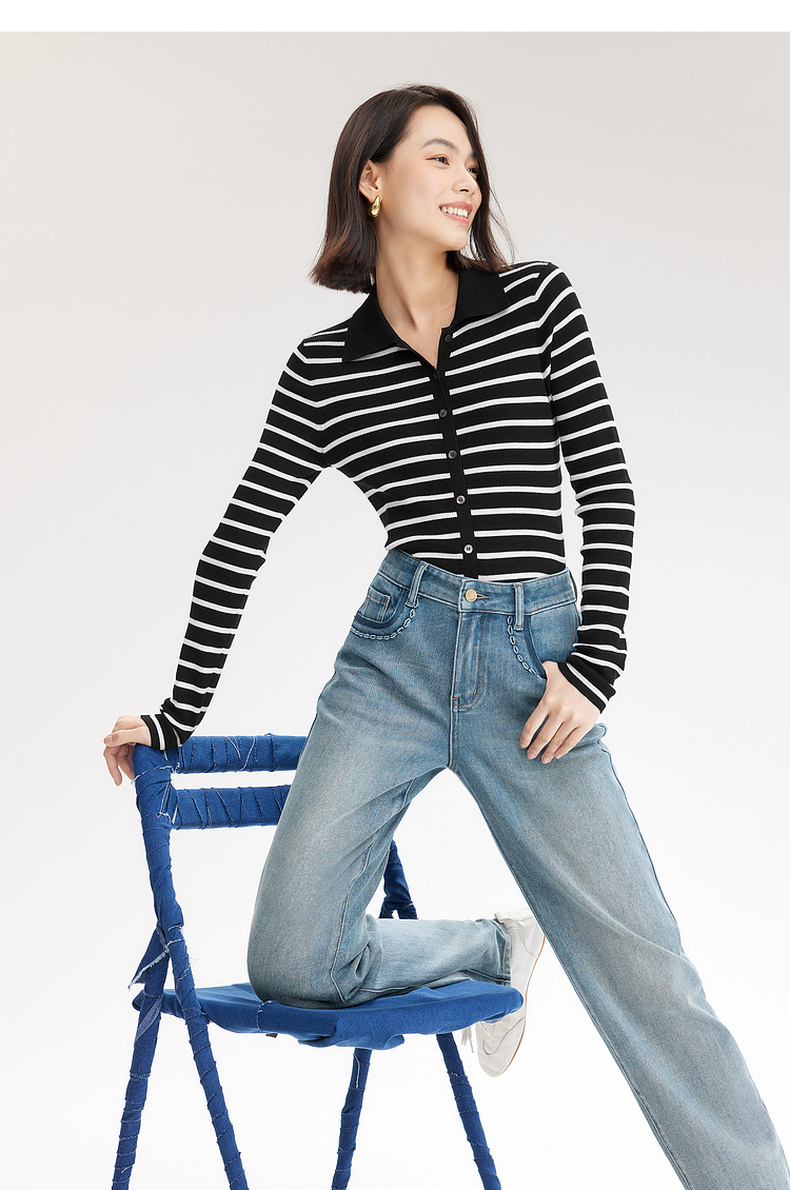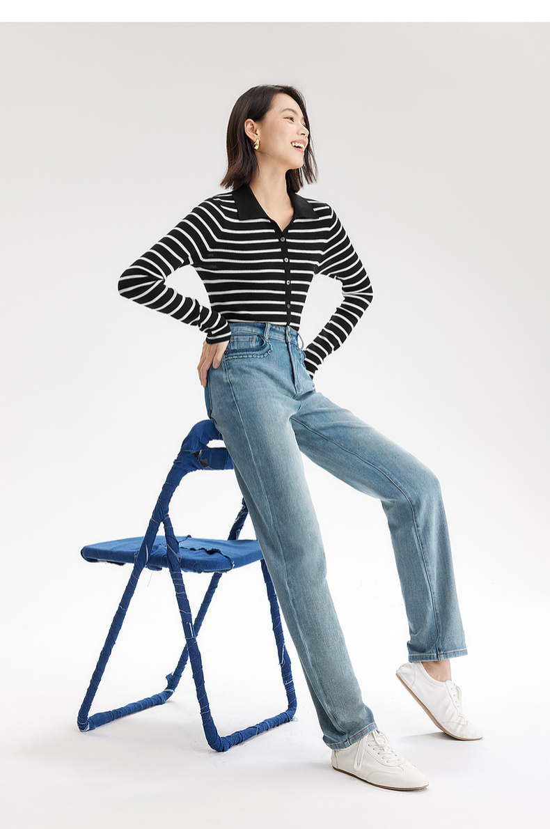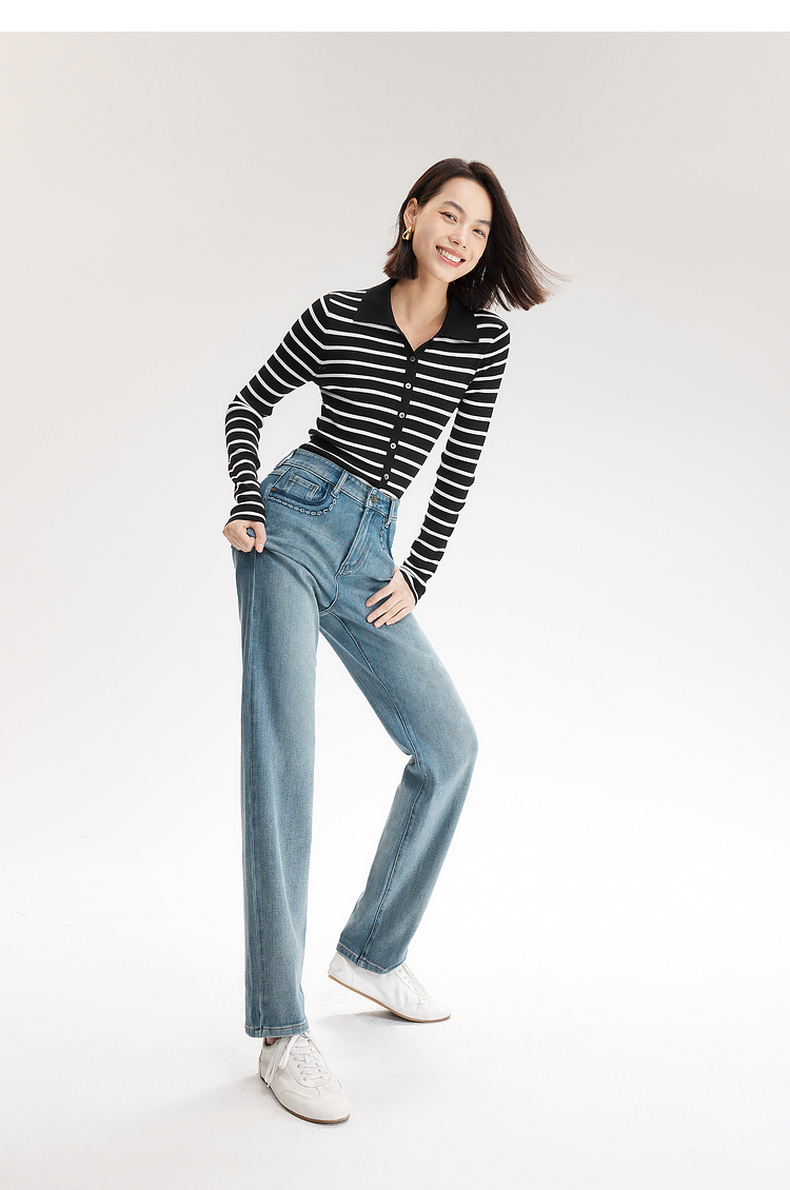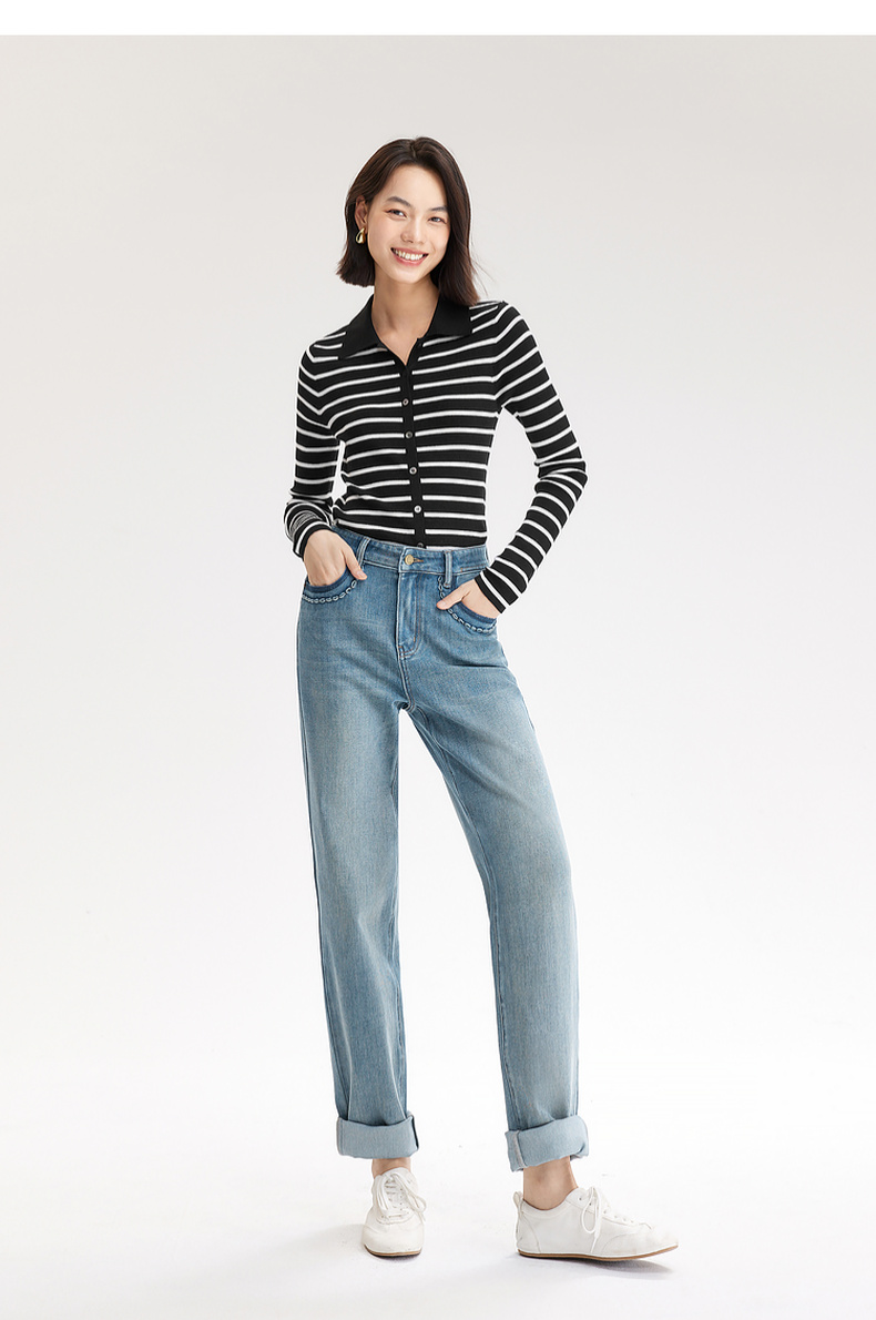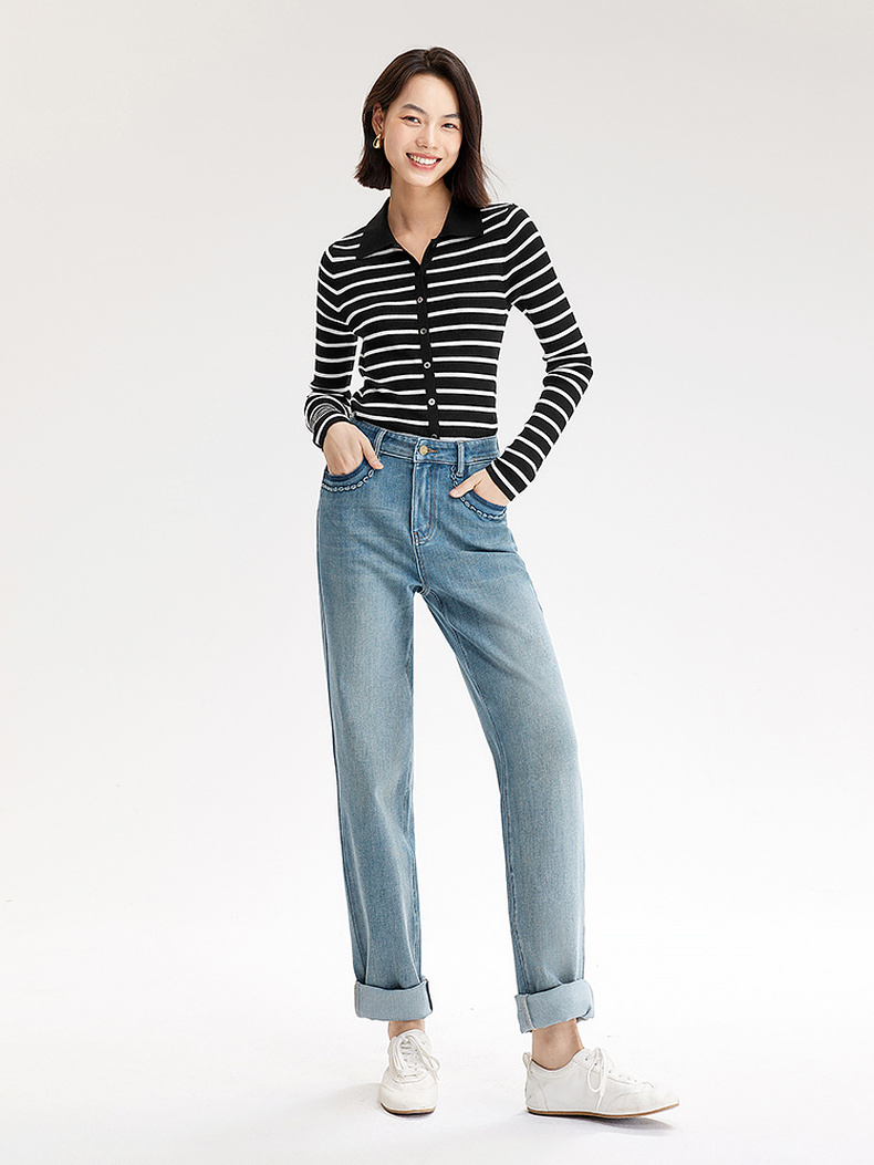 【严选】伊芙丽万向弹口袋撞色设计老爹牛仔裤女2024秋装新款显瘦百搭裤子1F7951271