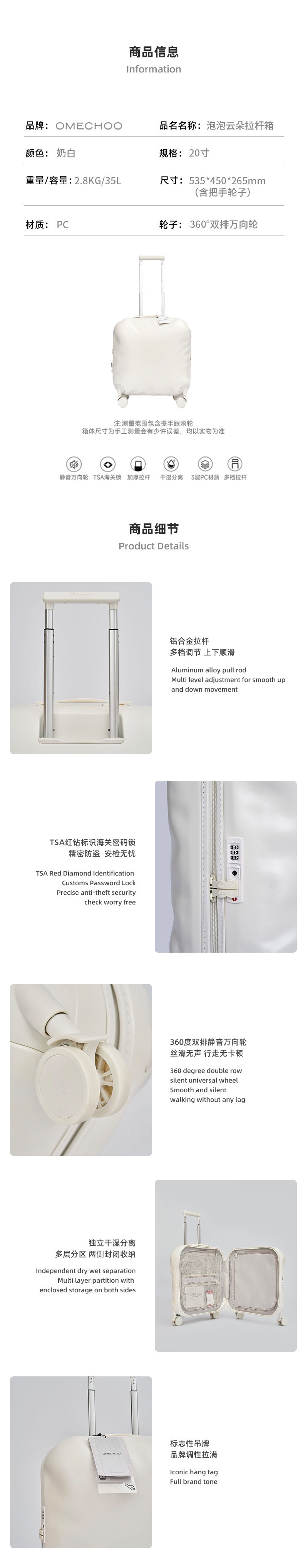 20寸小小的可以带上飞机很方便👍裸箱超轻,单手拎毫无压力;内里干湿分离,干净卫生;超静音万向轮,石板路和机场斜坡也能丝滑过去☁️云朵造型拍照📷超级出片,短途假期轻松出门旅行必备!