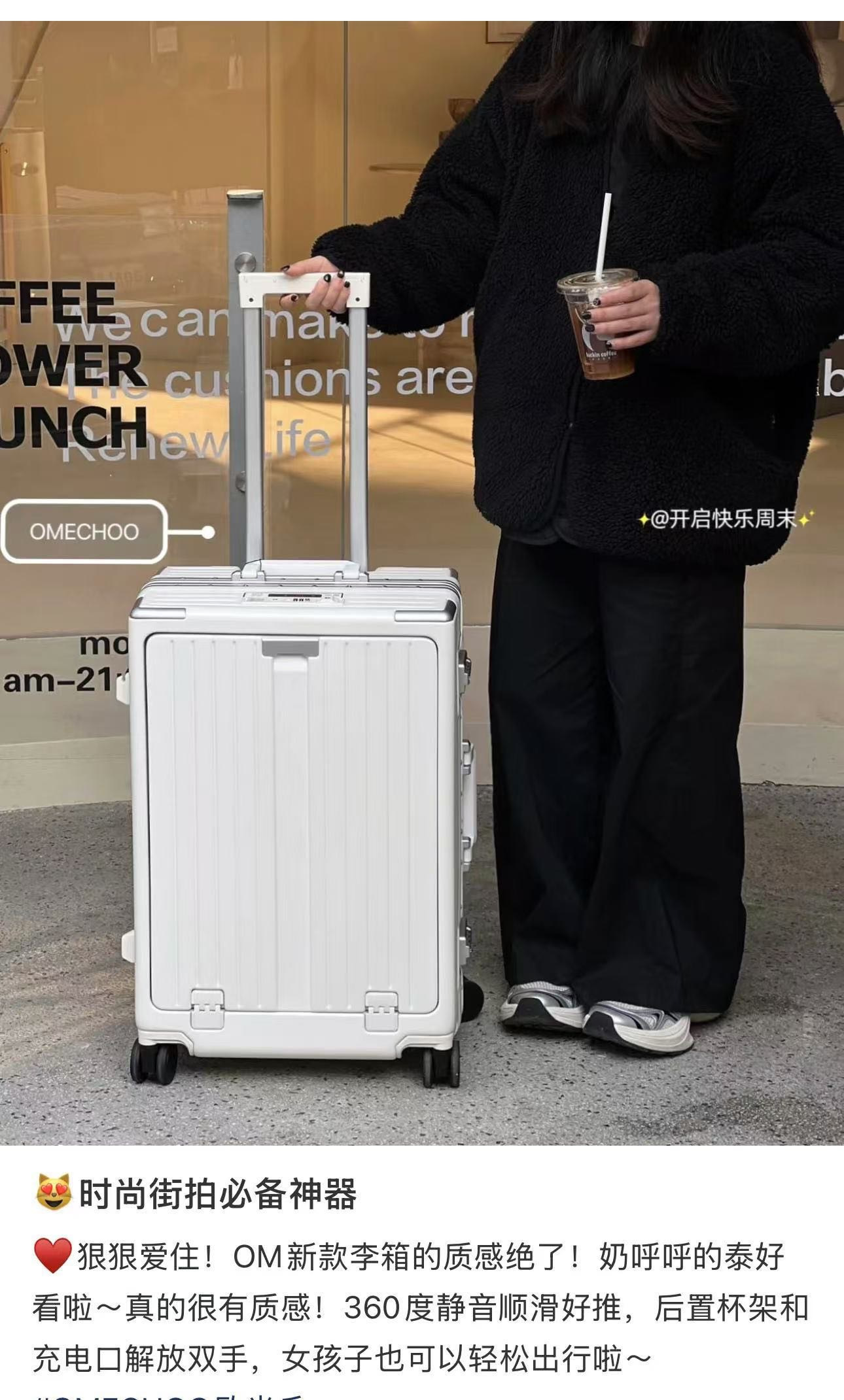 终于挖到一款颜值和质量都在线的行李箱了😭OM这个行李箱,前开扣设计,常用的东西都可以装进去随意拿取超方便👍360度静音顺滑好推,后置杯架和充电口解放双手~很适合短途旅行