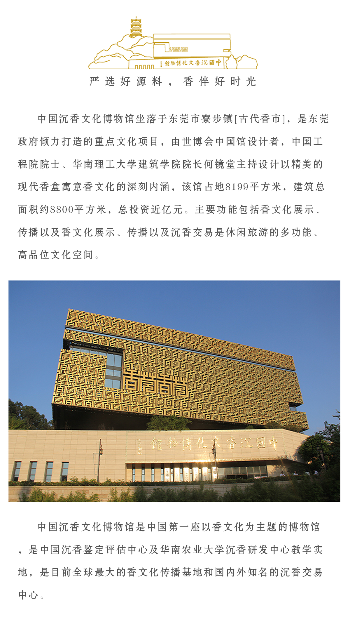 中国沉香文化博物馆坐落于古代[香市]东莞市寮步镇,是东莞政府倾力打造的重点文化项目,由世博会中国馆设计者,中国工程院院士、华南理工大学建筑学院院长何镜堂主持设计,以精美的现代[香盒]寓意香文化的深刻内