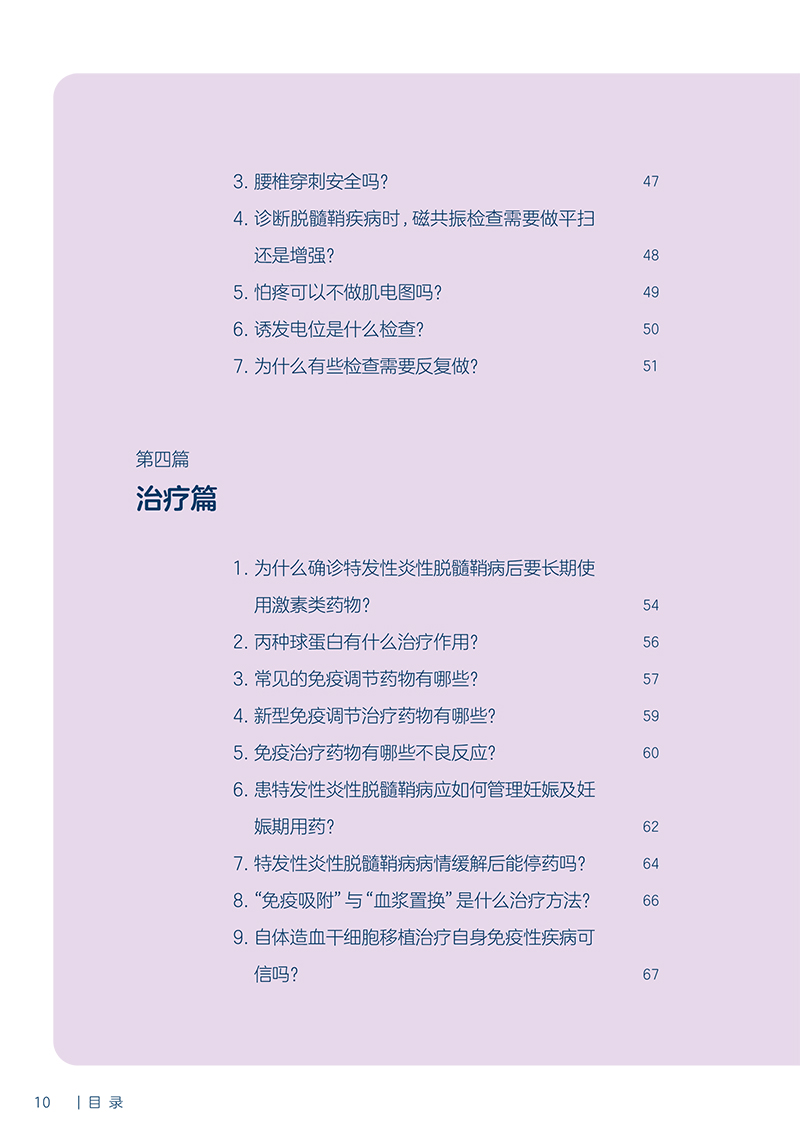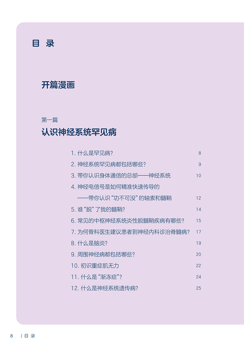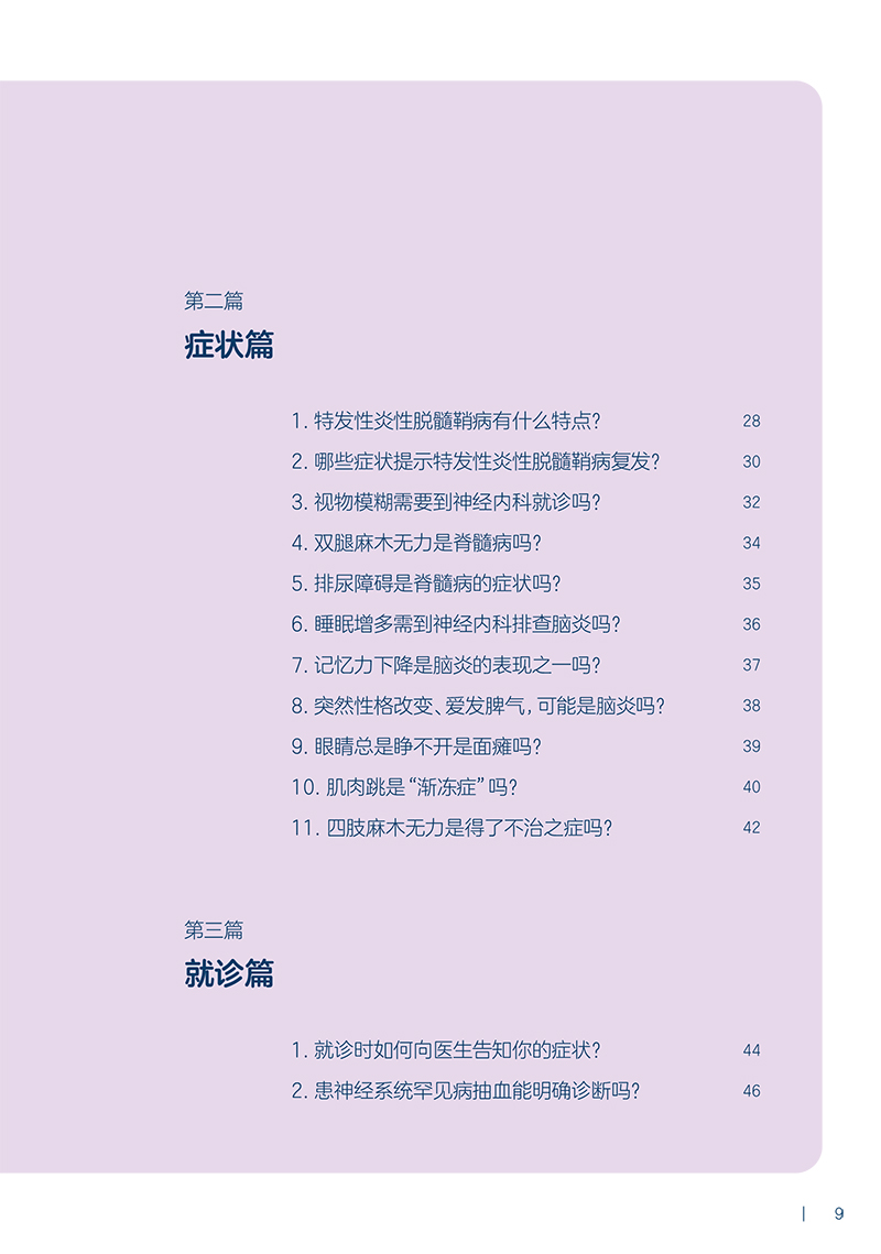 认识篇通过简明扼要的方式,涵盖了神经系统疾病的基础知识,包括疾病的定义、病因、病理生理过程等。读者可以从这些基础知识中了解疾病的本质和发展机制,为后续的内容理解打下基础;症状篇针对不同神经系统疾病,详细介绍常见的症状表现及紧急处理应对方法,以便读者能够及时发现潜在的疾病。通过对症状的了解,读者可以及早就医,提高治疗效果;就诊篇和治疗篇以简洁明了的方式解释复杂的医学术语和过程,帮助读者理解疾病的诊断和治疗过程,并提供了一些针对特定疾病的常用药物和治疗方法的介绍;照护篇则侧重于疾病康复和照护方面的指导。内容包括生活照顾、心理支持、康复训练等方面的技巧和方法,帮助患者及家属保持良好的心态和生活状态,更好地应对疾病的治疗及后续问题;预防篇详细介绍了预防神经系统疾病的方法和技巧,如健康生活方式、饮食管理、运动建议等。同时,针对特定人群或风险因素的筛查也得到重点关注,帮助读者尽早发现潜在问题并采取适当的措施。