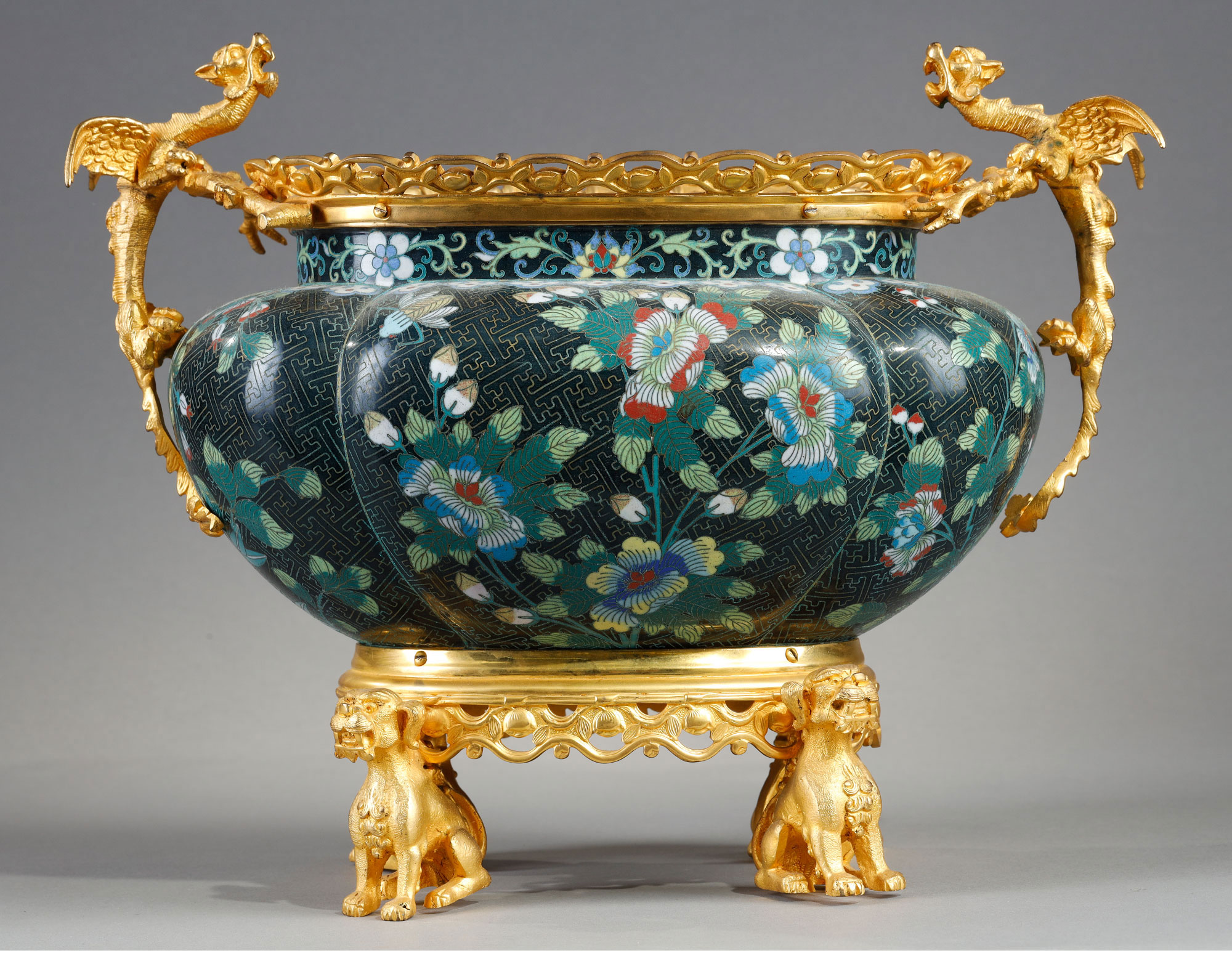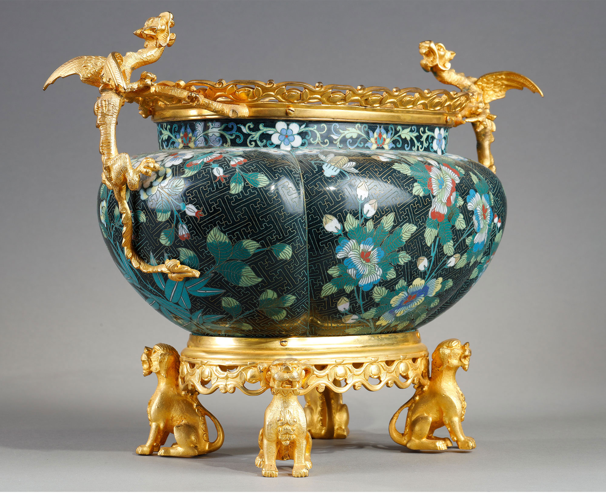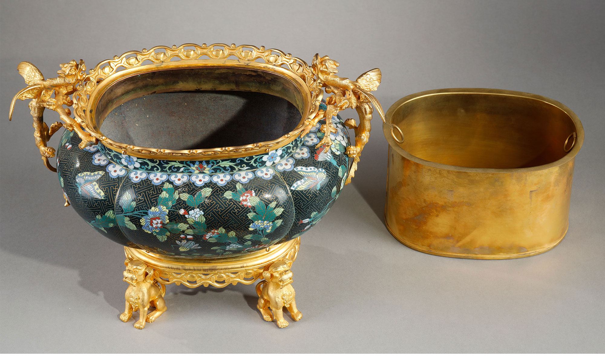 1880年代法国出品铜鎏金精雕铜胎掐丝珐琅缠枝莲纹花卉主题瓜棱型花盆