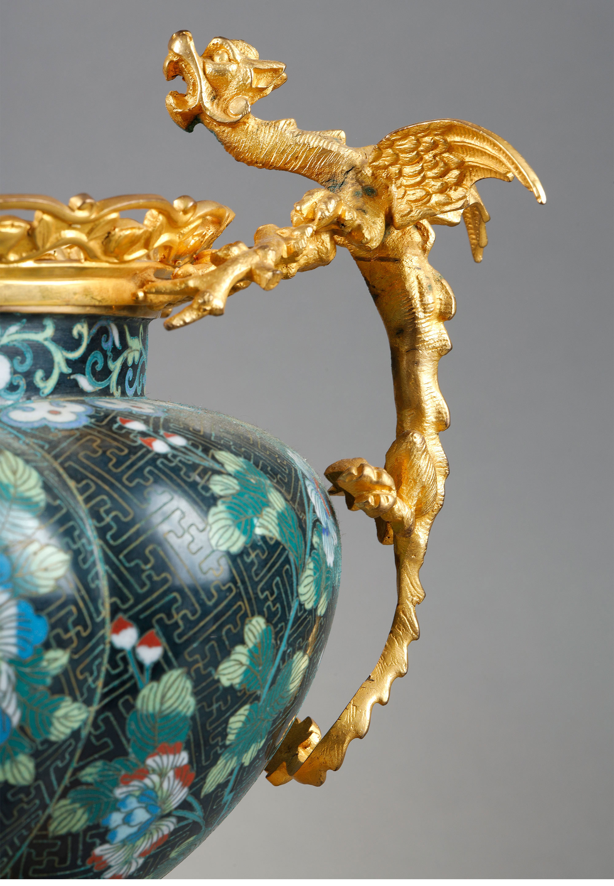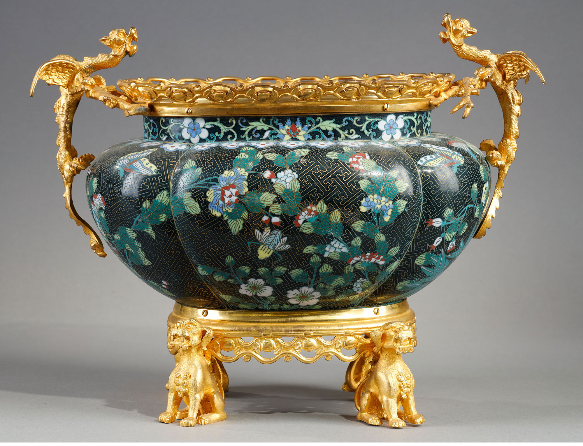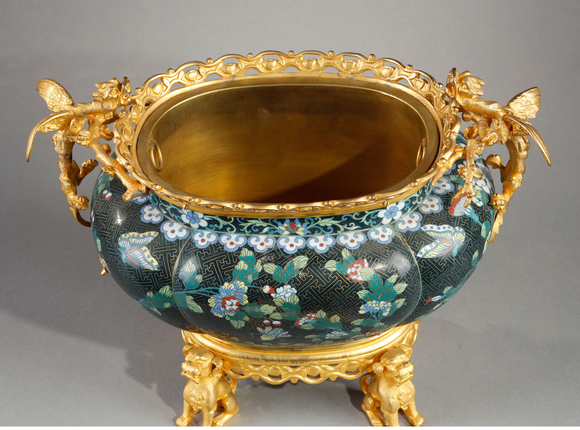 1880年代法国出品铜鎏金精雕铜胎掐丝珐琅缠枝莲纹花卉主题瓜棱型花盆