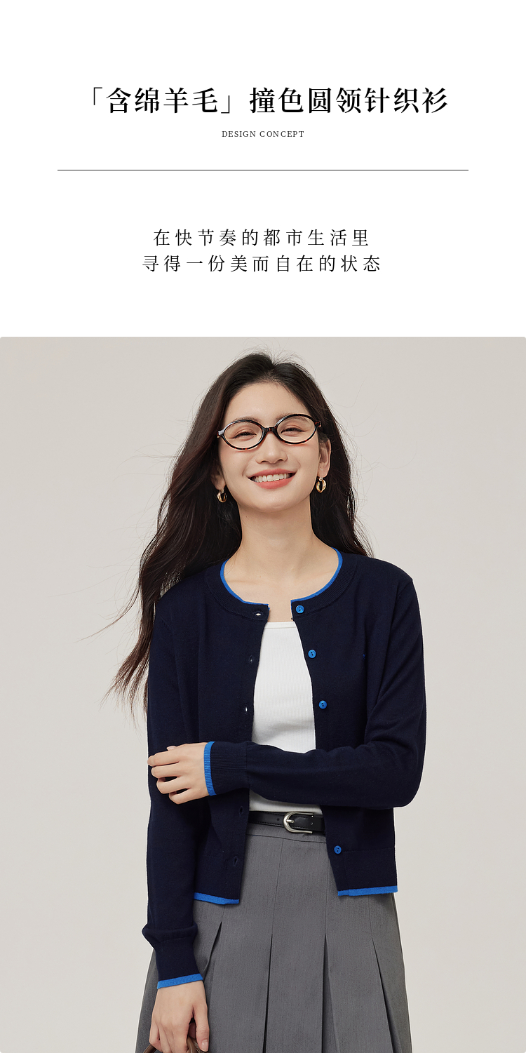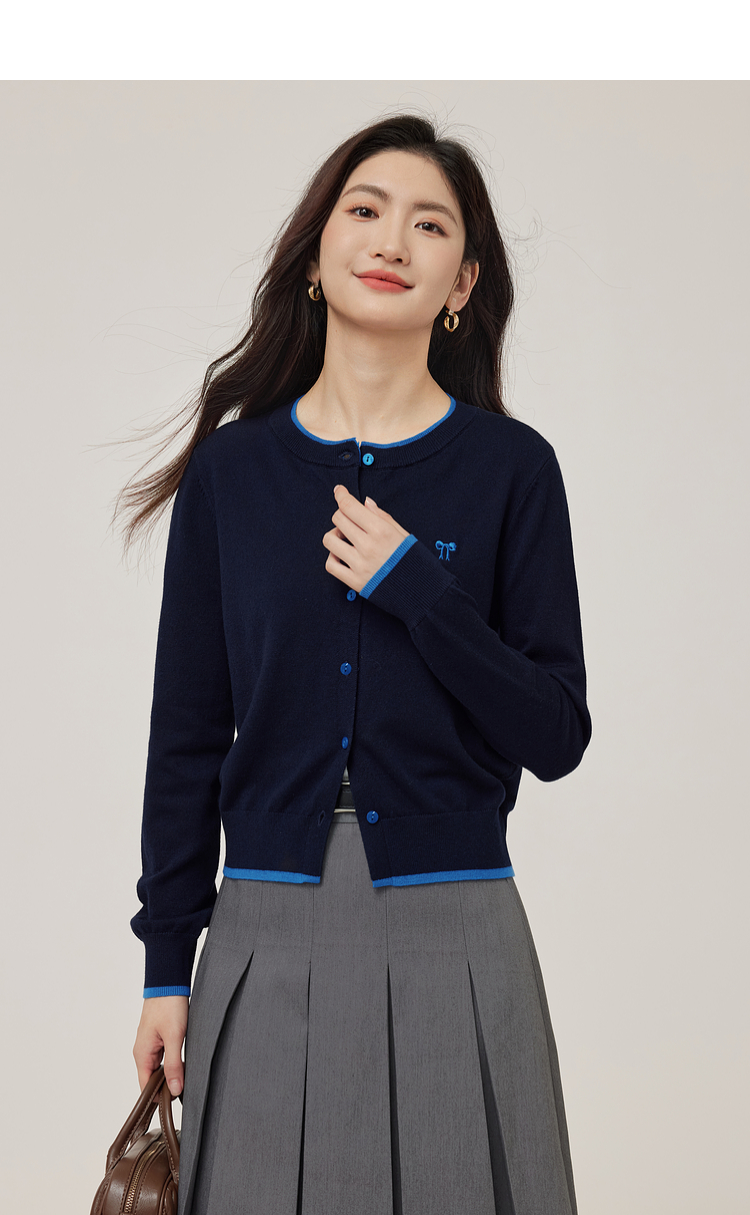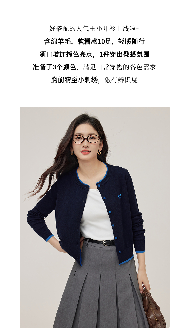 【08/27新品】熙世界绵羊毛撞色圆领针织开衫女2025秋季新款刺绣长袖毛衫短外套
