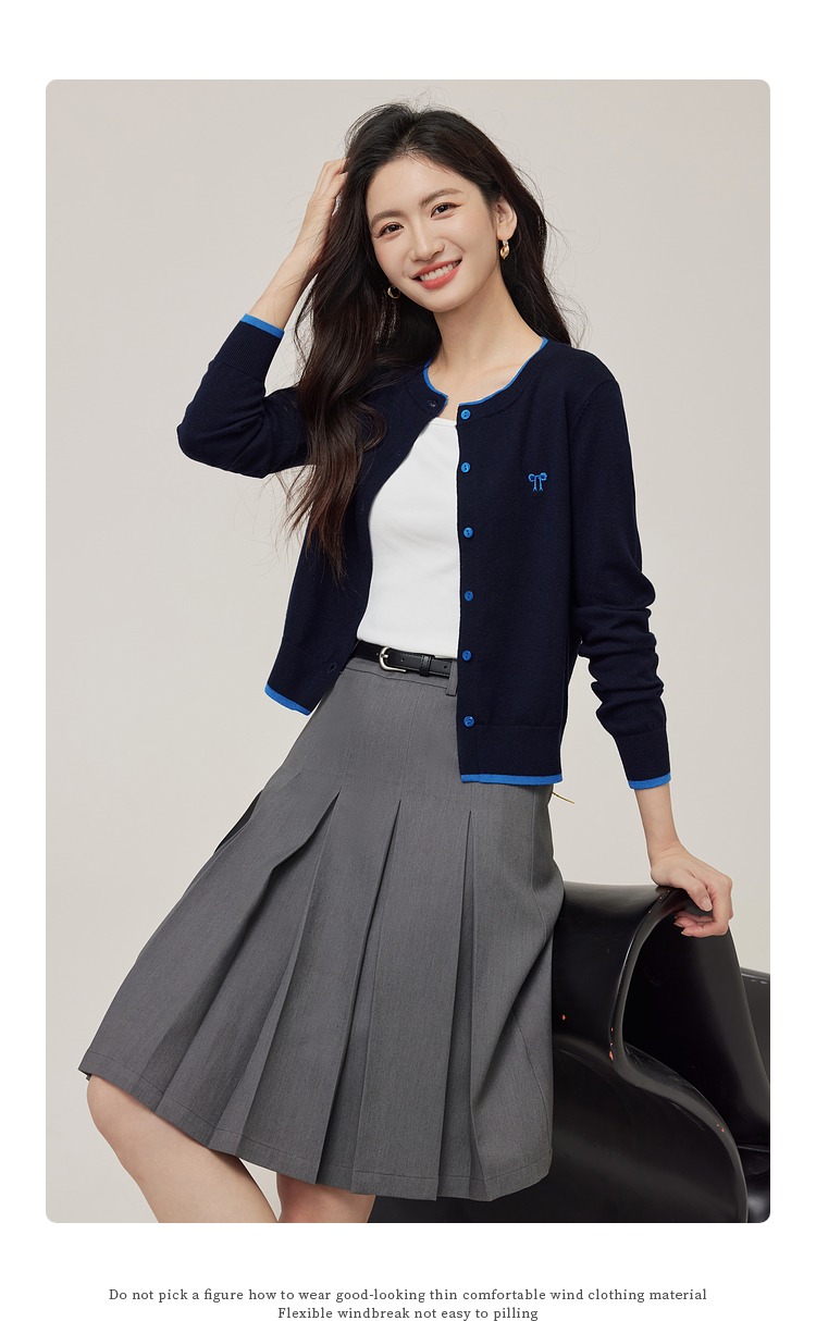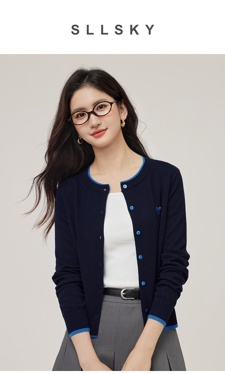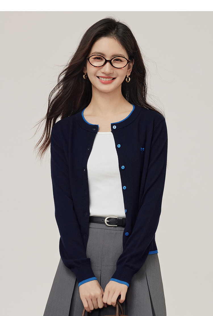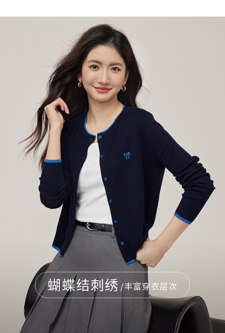 【08/27新品】熙世界绵羊毛撞色圆领针织开衫女2025秋季新款刺绣长袖毛衫短外套