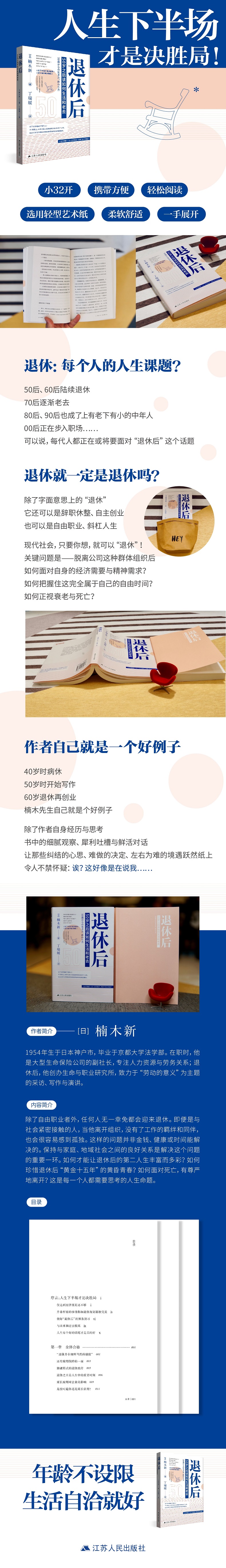 ?当然,除了字面意思上的“退休”,它还可以是辞职休整,可以是自主创业,也可以是自由职业、斜杠青年。现代社会,只要你想,就可以“退休”,关键问题是,脱离公司这种群体组织后,如何面对自身的经济需要与精神需求?如何把握住这属于自己的自由时间?如何正视衰老与死亡?所以,这是一本没有年龄限制的书,别看书名叫“退休后”,其实是一部生活自洽指南。和日本类似,中国也是一个尊崇集体的国家,当不从属于任何一个组织之后,该如何过好自己的人生?这本书不会给你答案,但会给你启发。