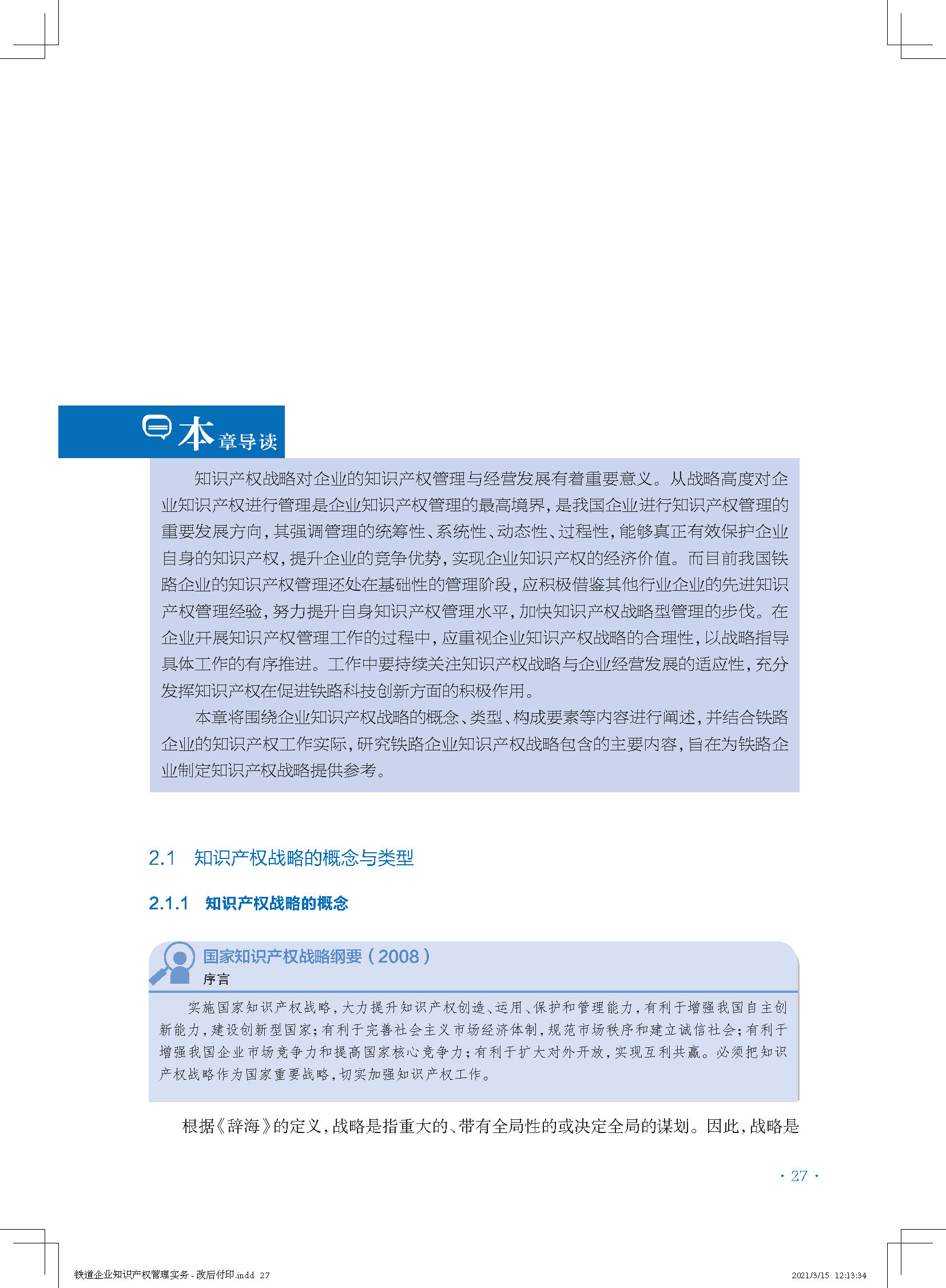 本书系统介绍了铁路企业知识产权管理政策与法律常识、企业知识产权战略的内涵与基本要素,并从知识产权工作的主要环节以及企业生产经营的管理流程(立项、研发、试制生产、贸易、采购)两个不同维度,阐释了企业知识产权工作的主要内容与普遍性做法,有助于科技管理或研发人员理解与掌握知识产权相关知识,对铁路企业提升知识产权管理水平具有重要参考价值。