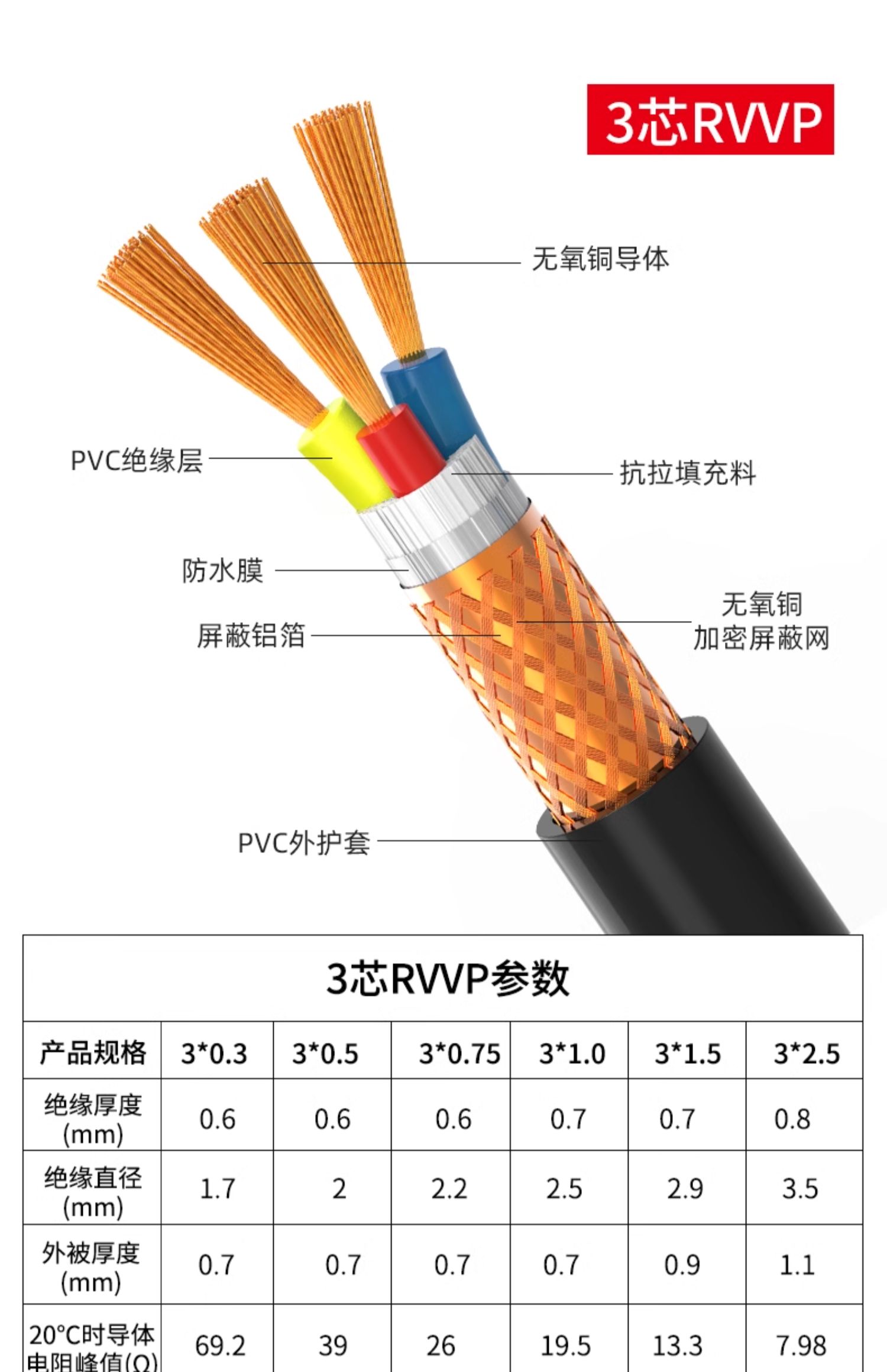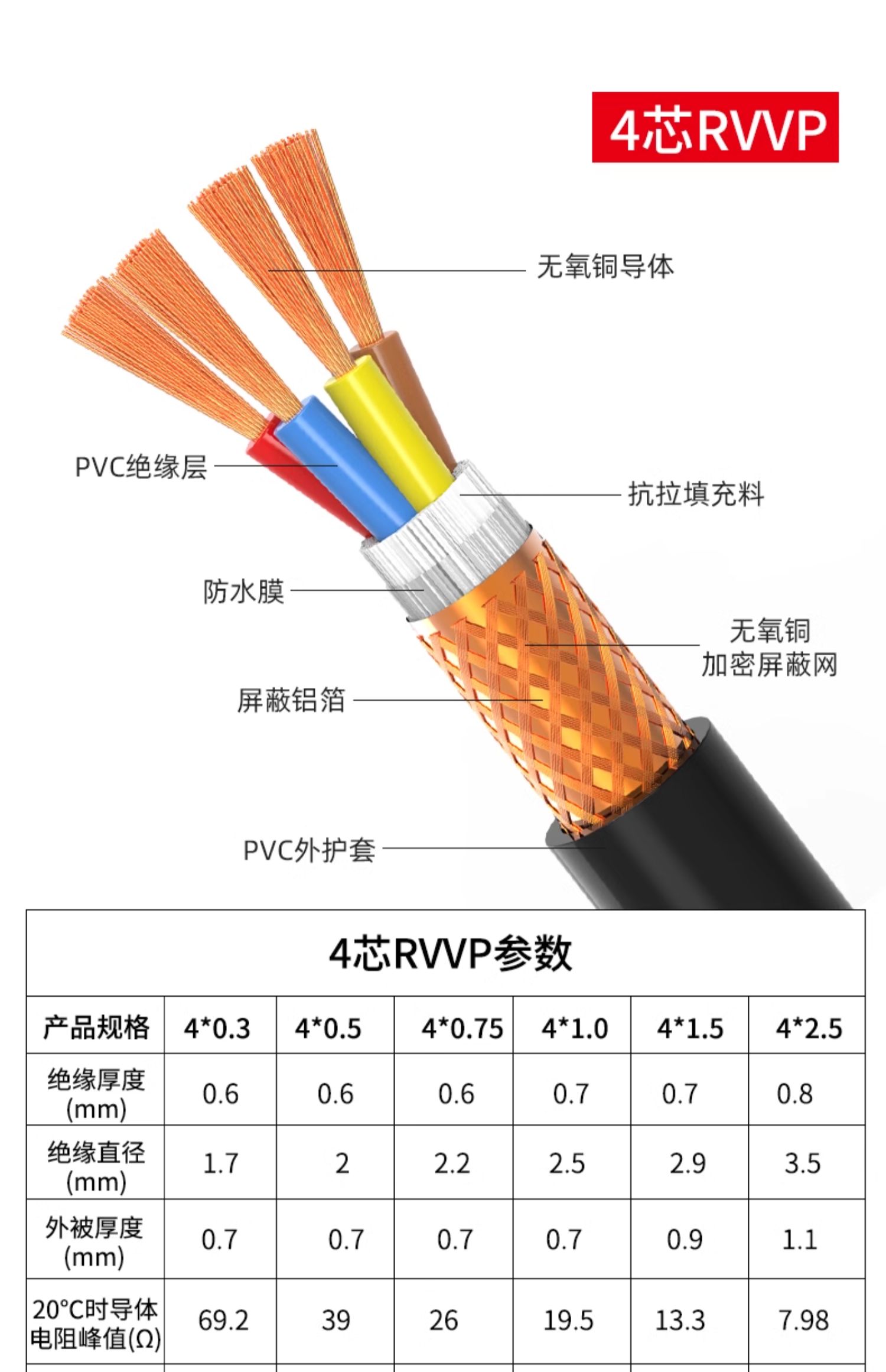 商品名称:国标纯铜RVVP屏蔽线2芯3芯4芯0.3 0.75平方1.5控制电缆音频信号线
